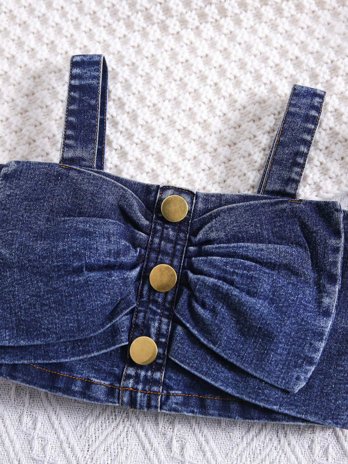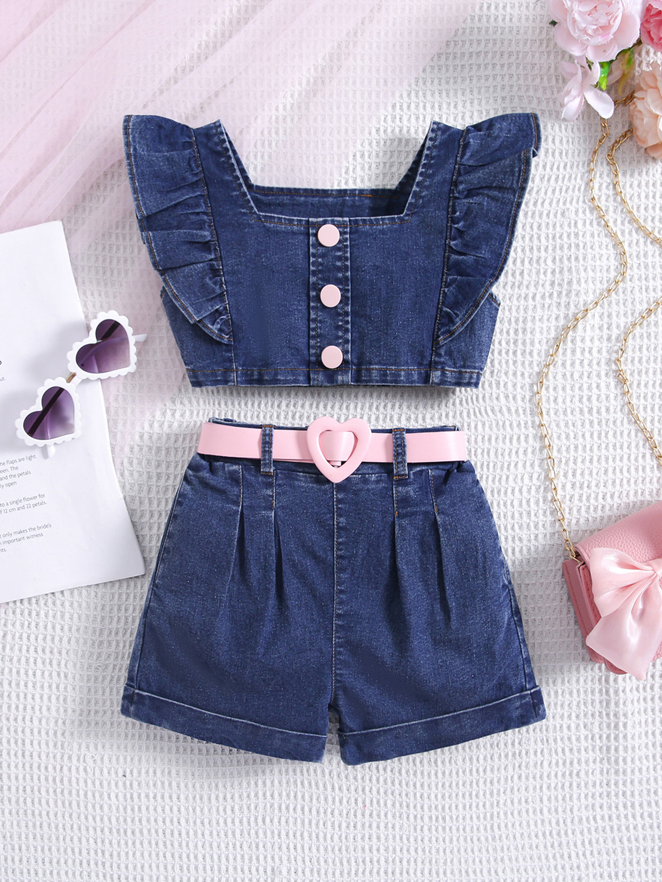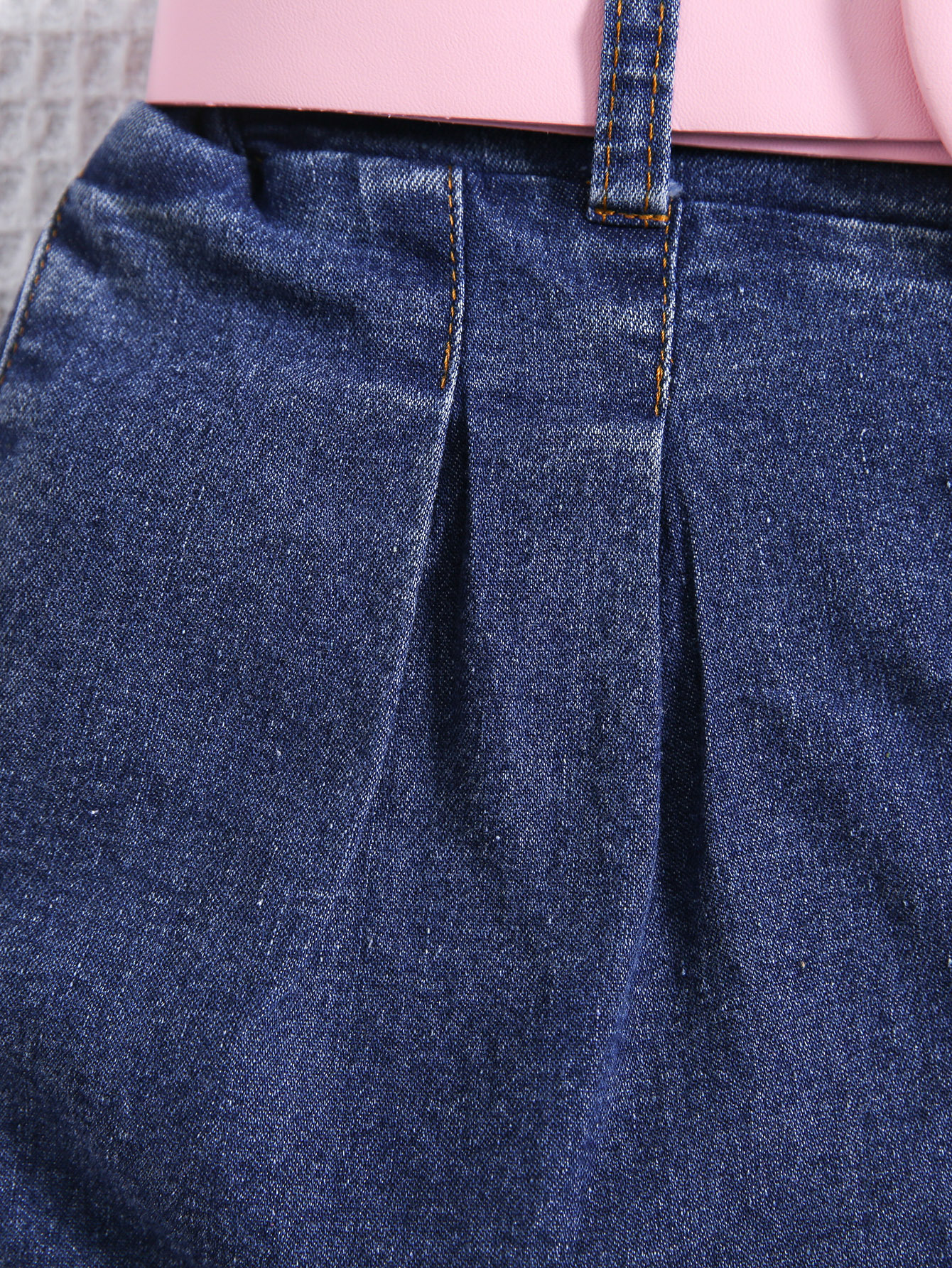 유럽과 미국의 국경 간 아동복 소녀 광장 칼라 랜턴 슬리브 상단 파편 패턴 주름 스커트 멀티 버튼 데님 소녀복 세트