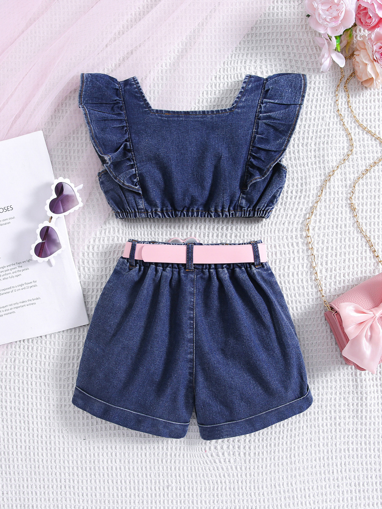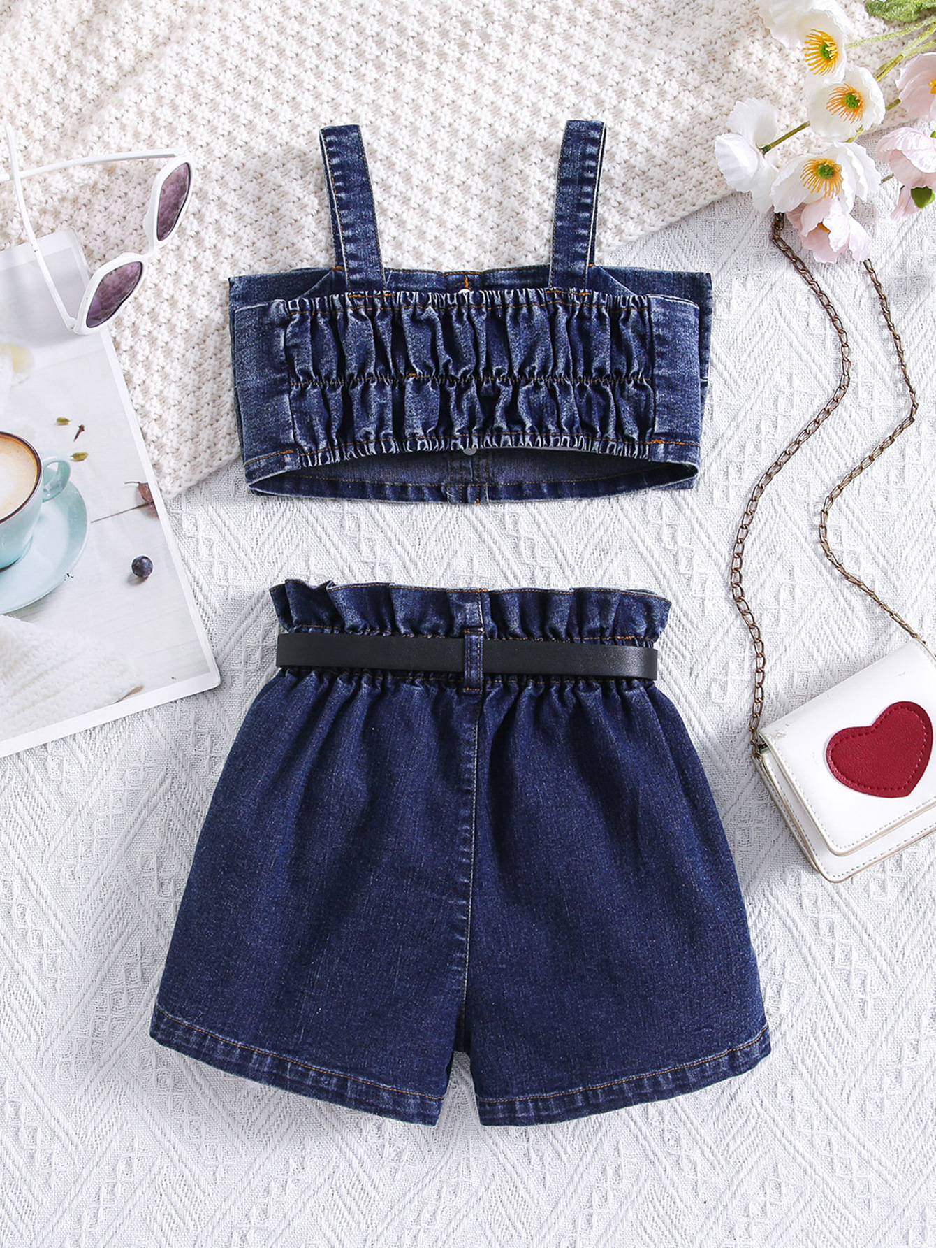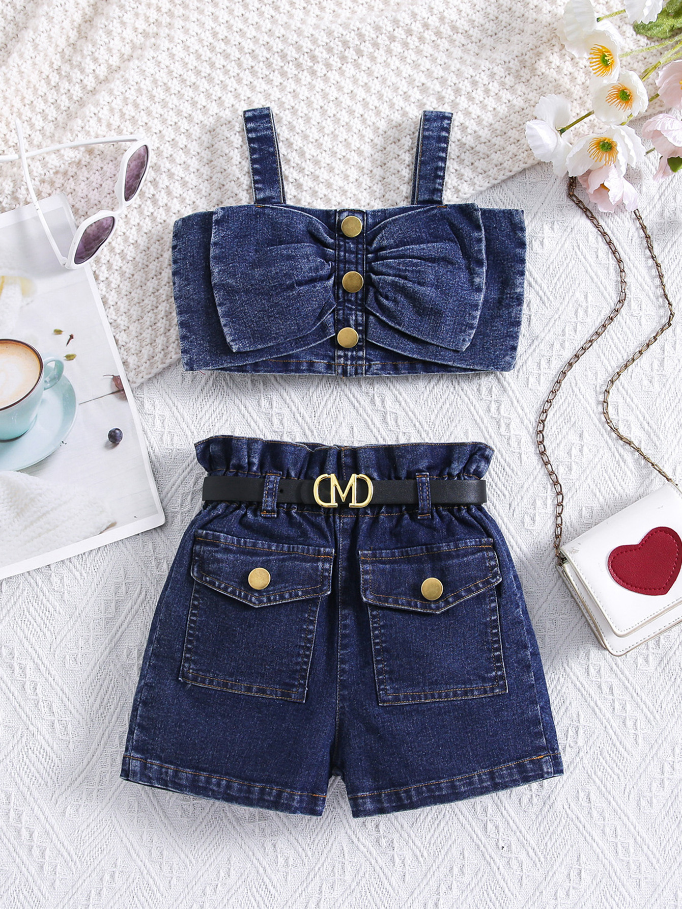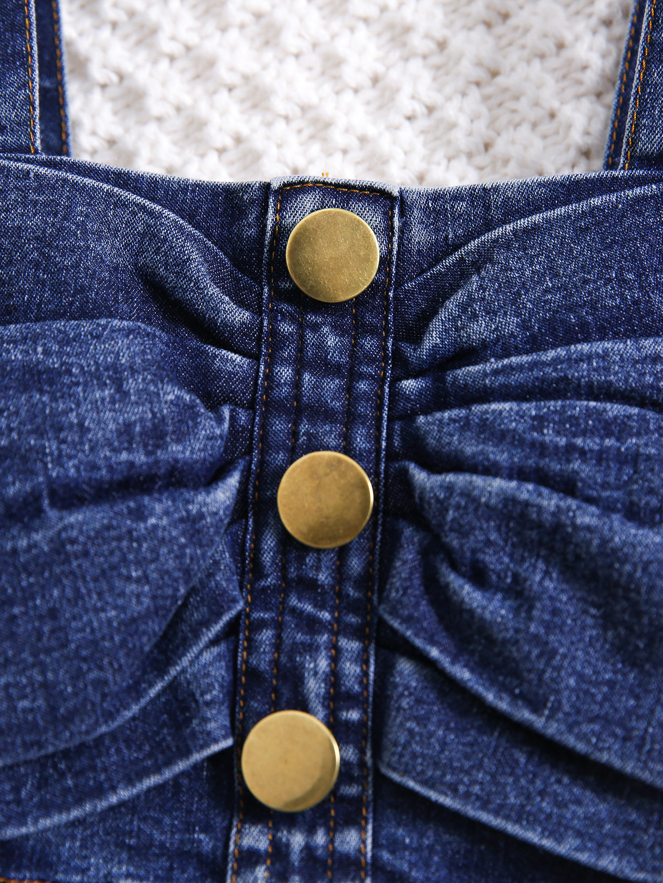 유럽과 미국의 국경 간 아동복 소녀 광장 칼라 랜턴 슬리브 상단 파편 패턴 주름 스커트 멀티 버튼 데님 소녀복 세트