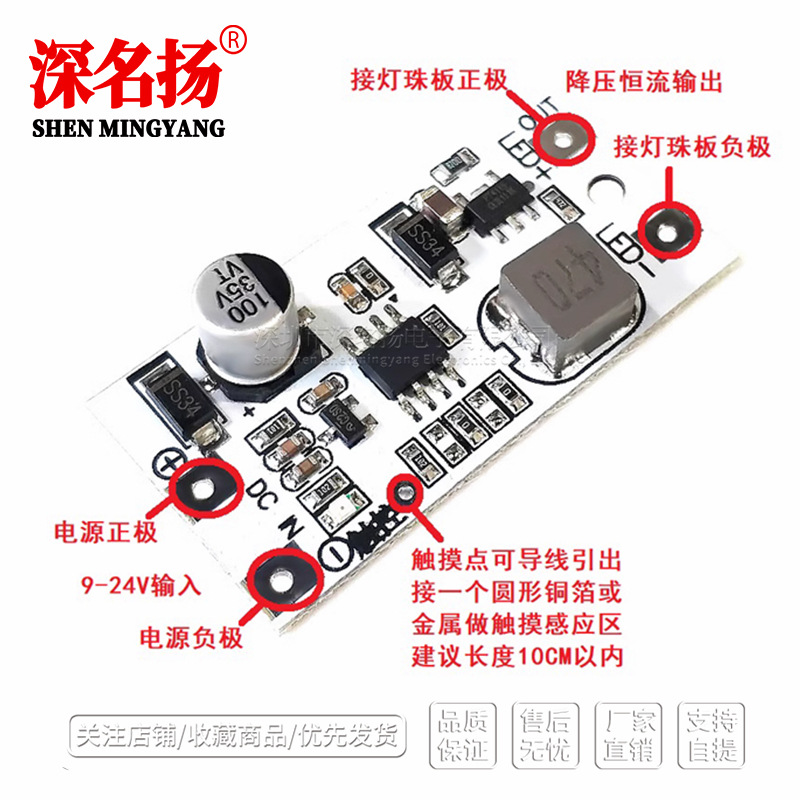恒流驱动触摸调光控制板;选用华润矽威PT4115方案,具有高可调光比,宽电压输入,高峰值效率,过温软保护,LED自然开路保护等功能;及高性能电容式单键触控,可不直接接触感应,可用于玻璃、陶瓷、塑料等介质表面,PWM方式调光频率高达32KHz,基本无频闪和噪声,具备工作环境发生变化自动适应,支持几种不同的工作模式:无级调光,三挡调光,直接输出,锁存输出等,板设有RC滤波和LDO稳压,为系统提供稳定可靠的工作电源。 主要应用于台灯,落地灯,氛围灯等LED灯具控制板上。