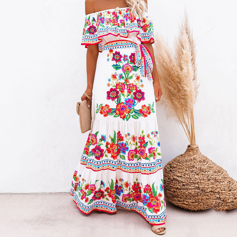 2021年欧美春夏季独立站亚马逊新款一字肩红花印花长款大摆连衣裙