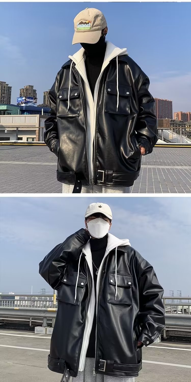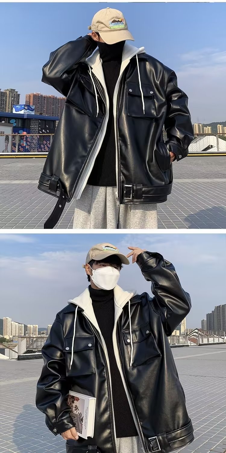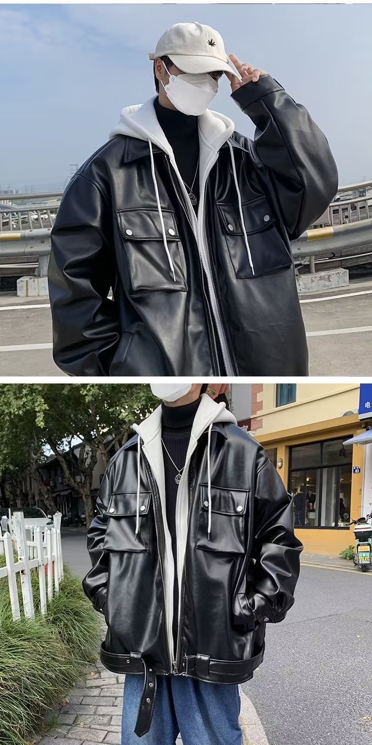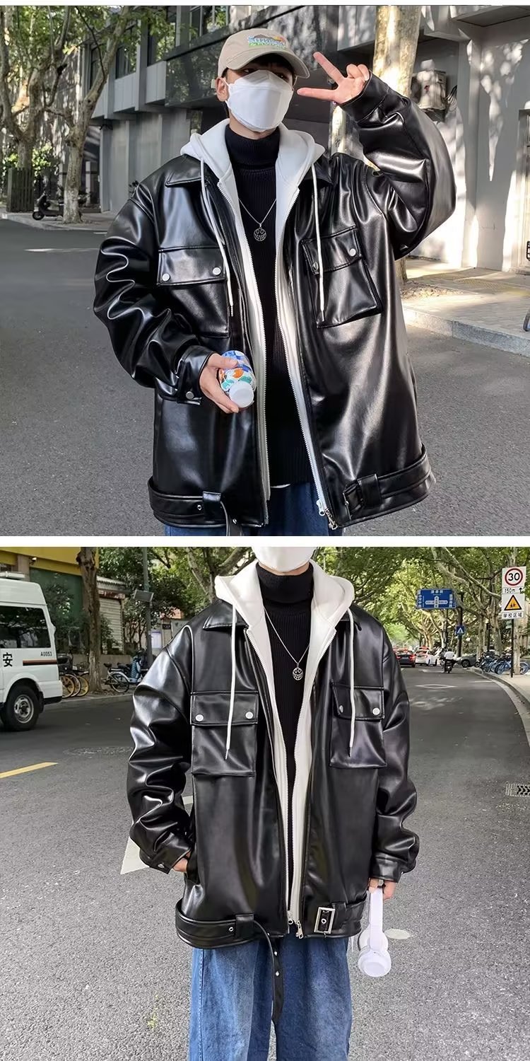 면 패딩 재킷 남성 겨울 가짜 투피스 후드 가죽 코트 남성 PU 가죽 면 패딩 일본식 패딩 코튼 코트