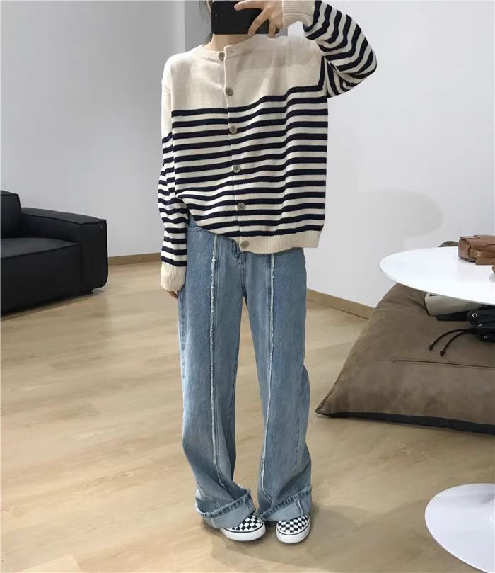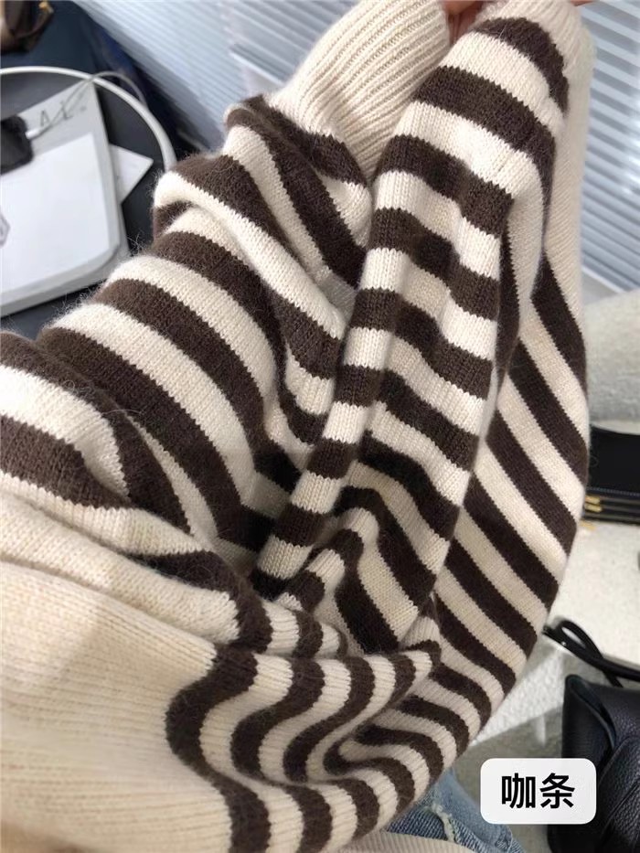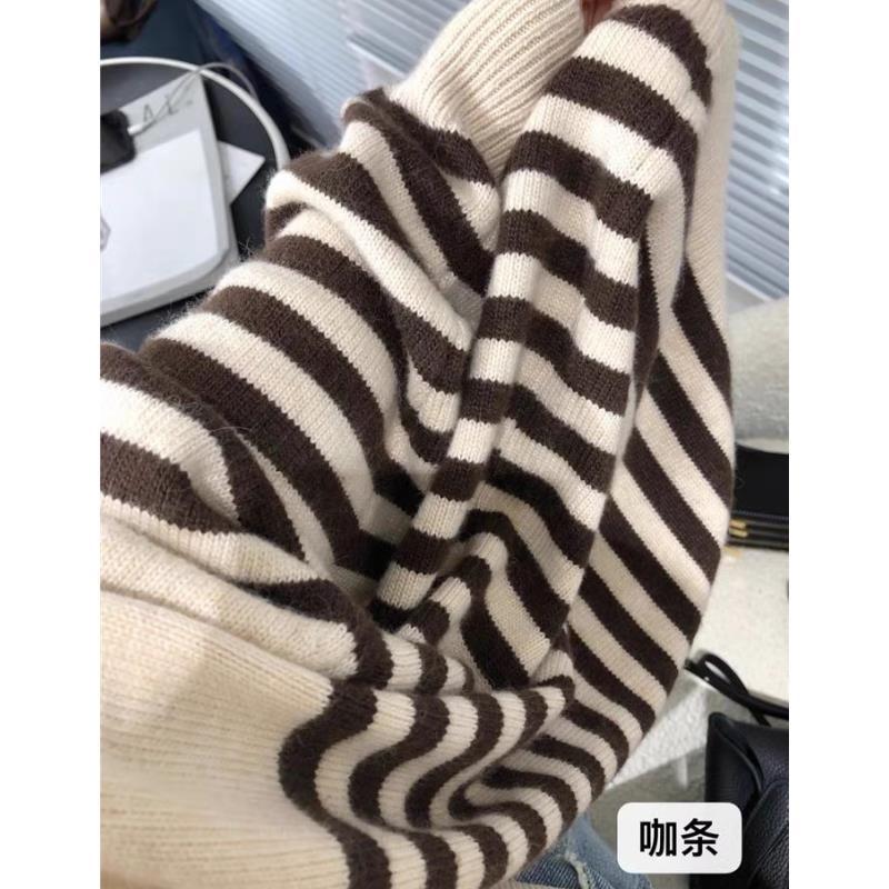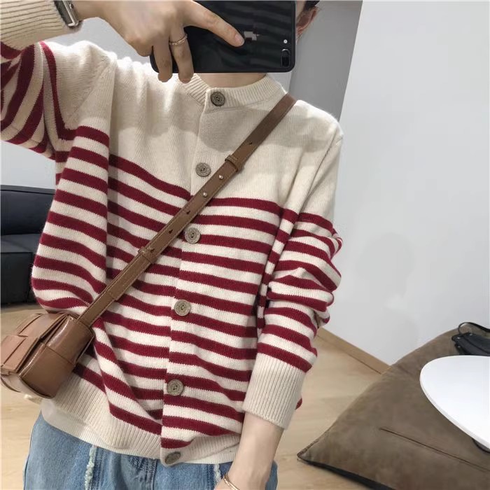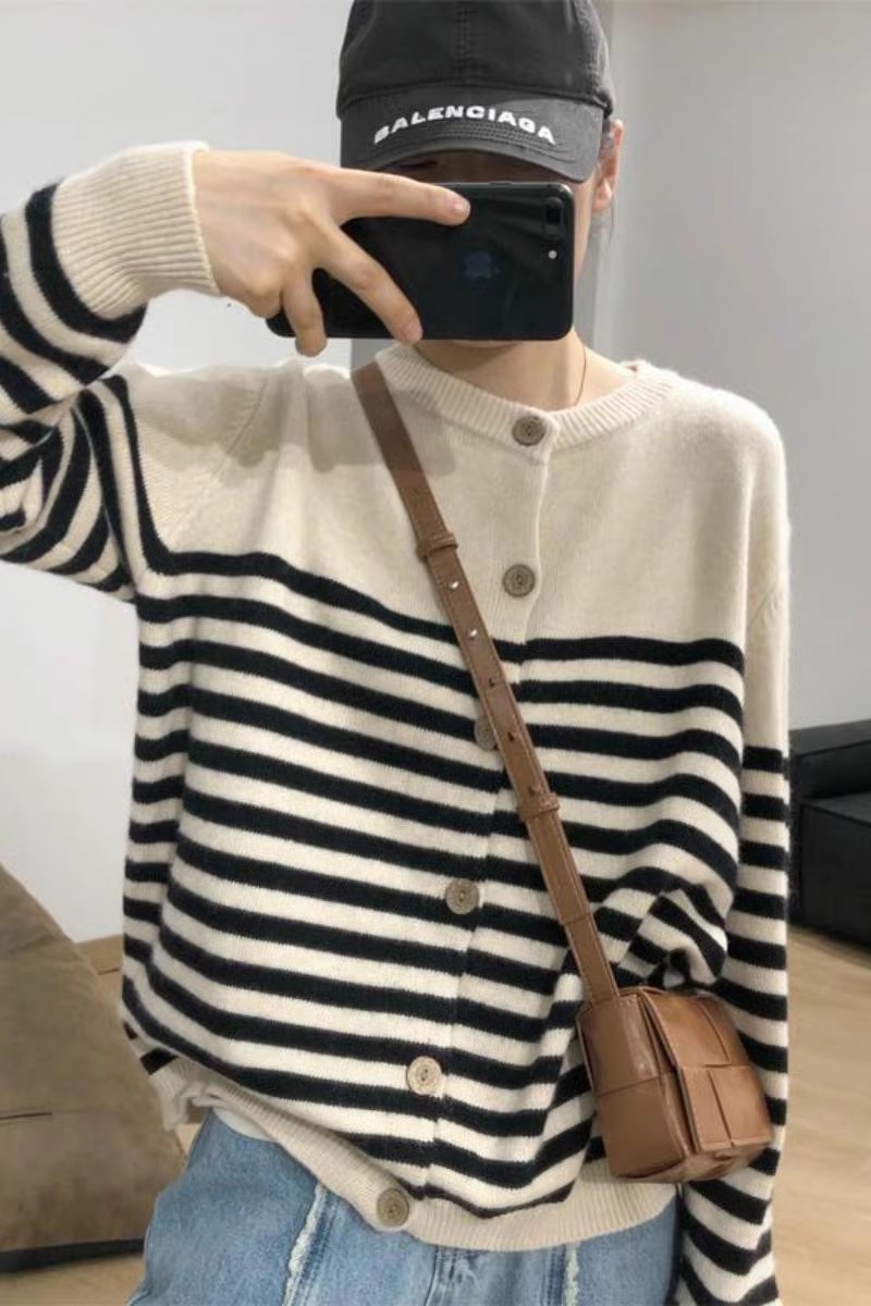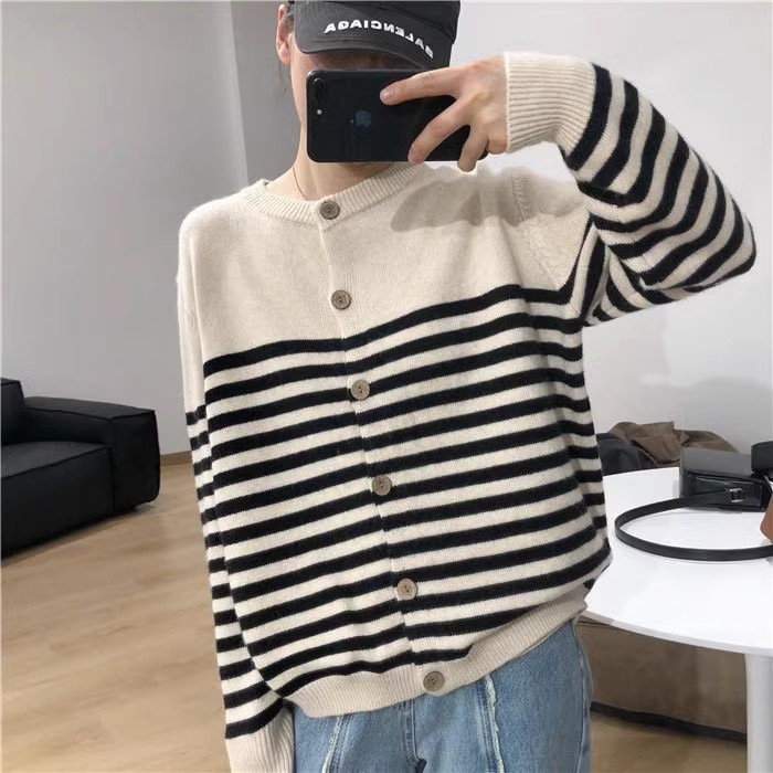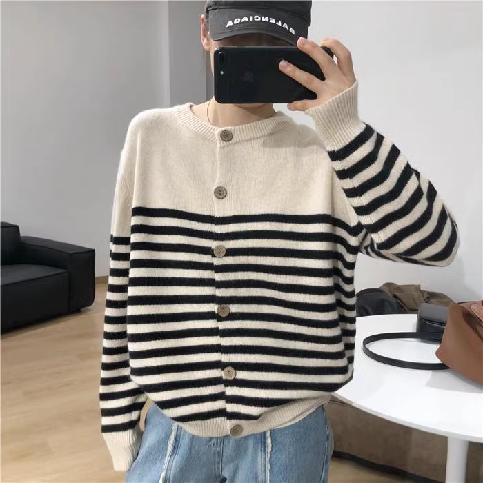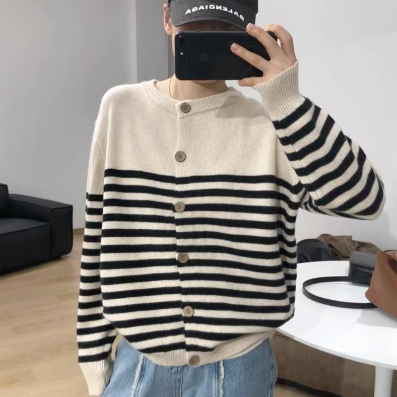 세련된 모든 매치 스트라이프 100 퓨어 울 니트 가디건 여성용 가을과 겨울 라운드 넥 레이지 루즈한 캐시미어 베이스 스웨터스토어 가기