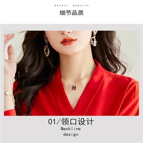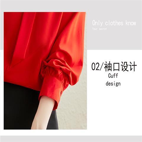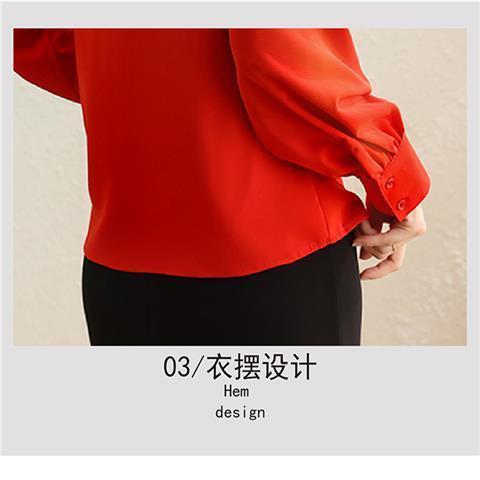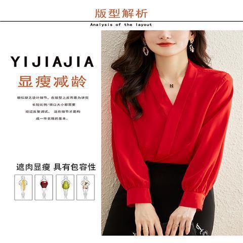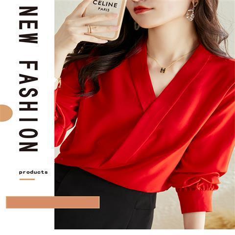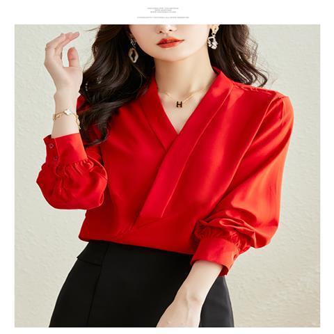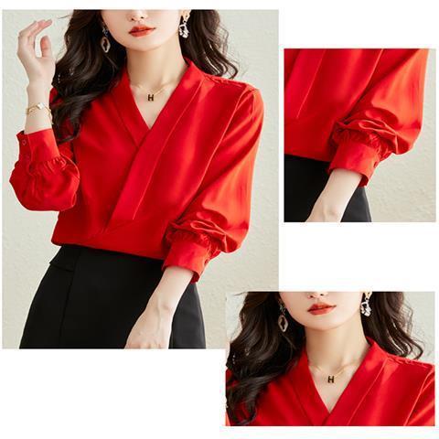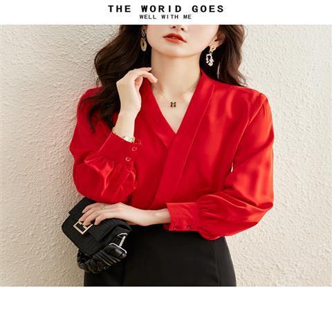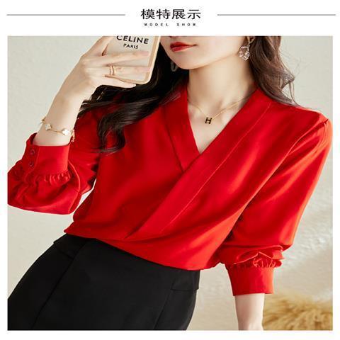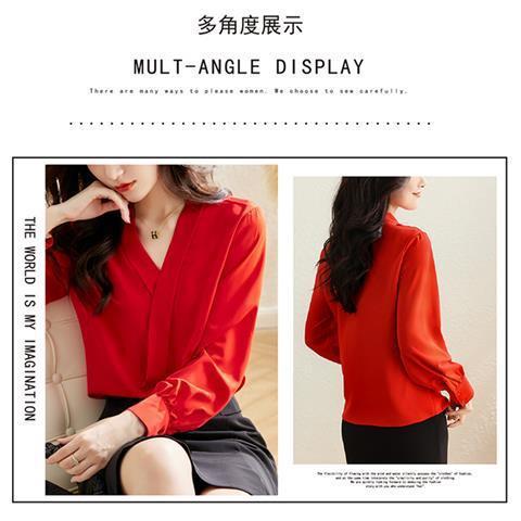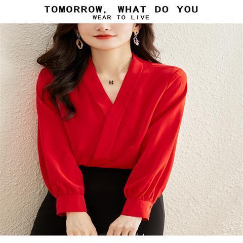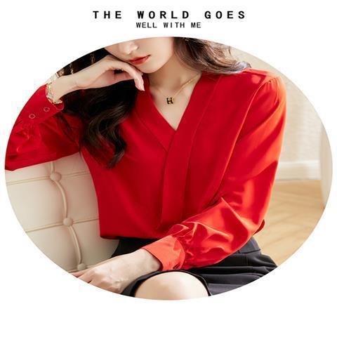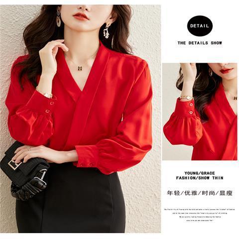 빨간색 쉬폰 셔츠 여성용 긴팔 봄 가을 신상 외출용 탑 패셔너블한 브이넥 셔츠 봄 신상스토어 가기