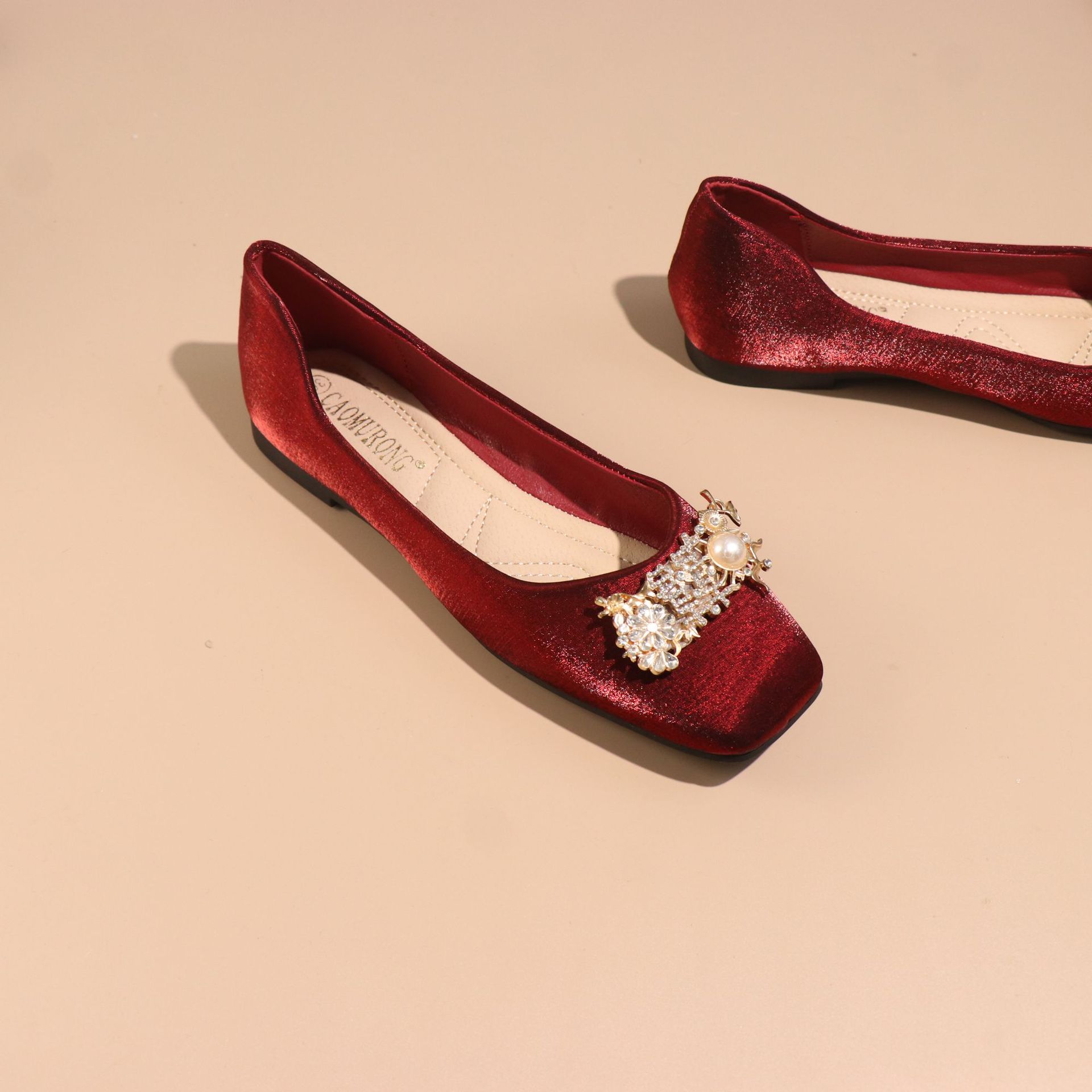 스퀘어 토 플랫 더블 행복 버클 여성용 고급 버건디 신부 신발 임산부 착용 플랫 힐 Xiu Wo 신발 토스트 신발스토어 가기
