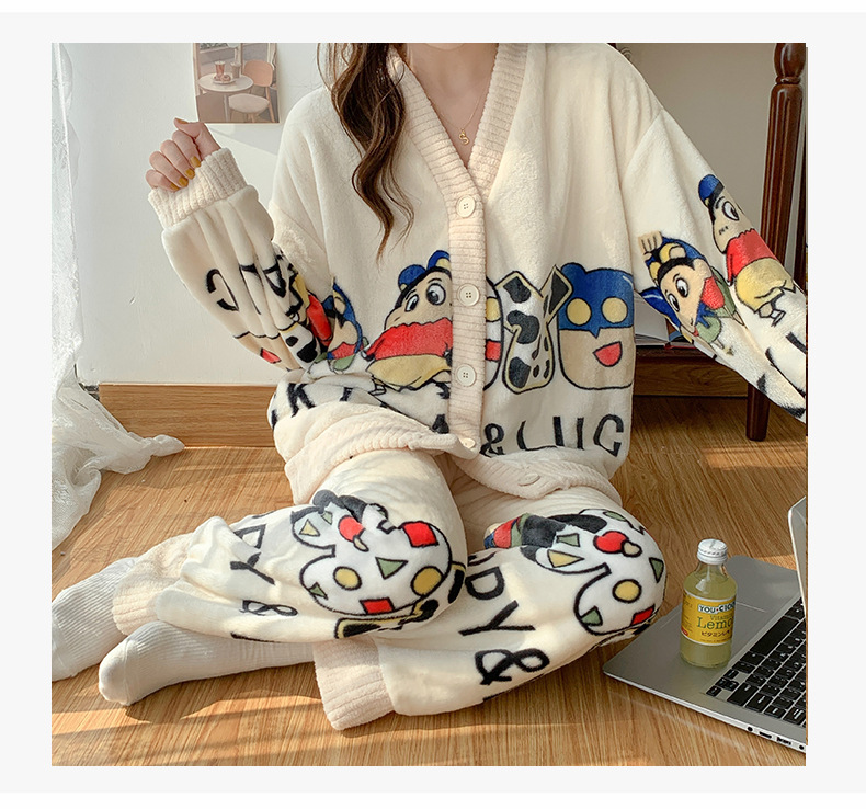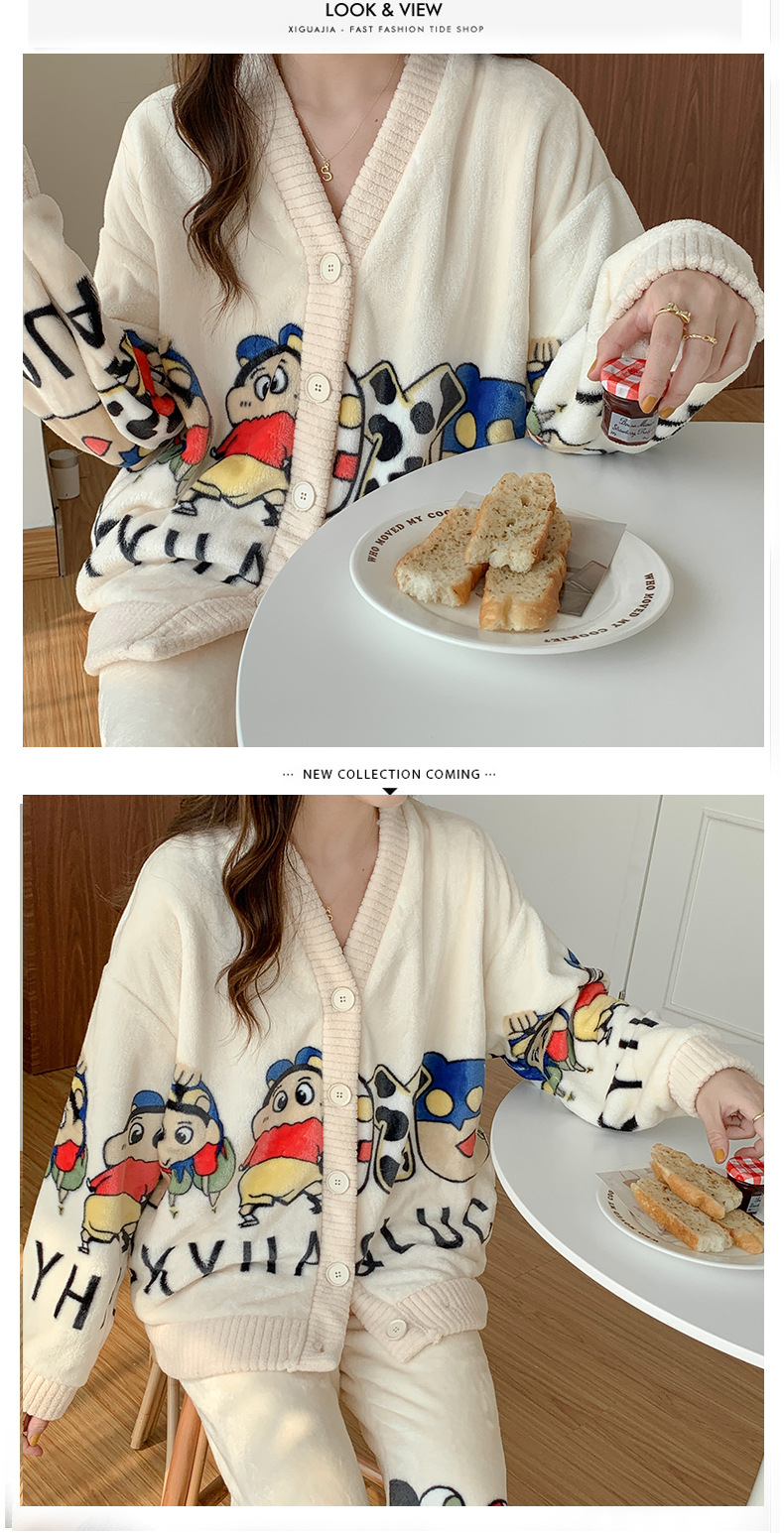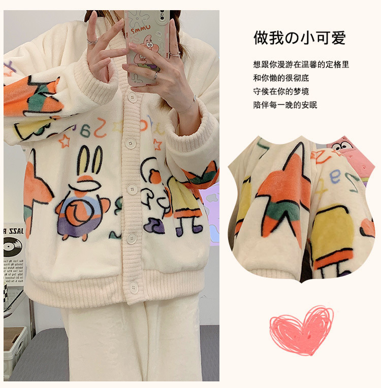 패트릭 잠옷 여자의 겨울 산호 양털 두꺼운 기모 만화 귀여운 가을과 겨울 카디건 달콤한 스타일 가정 옷