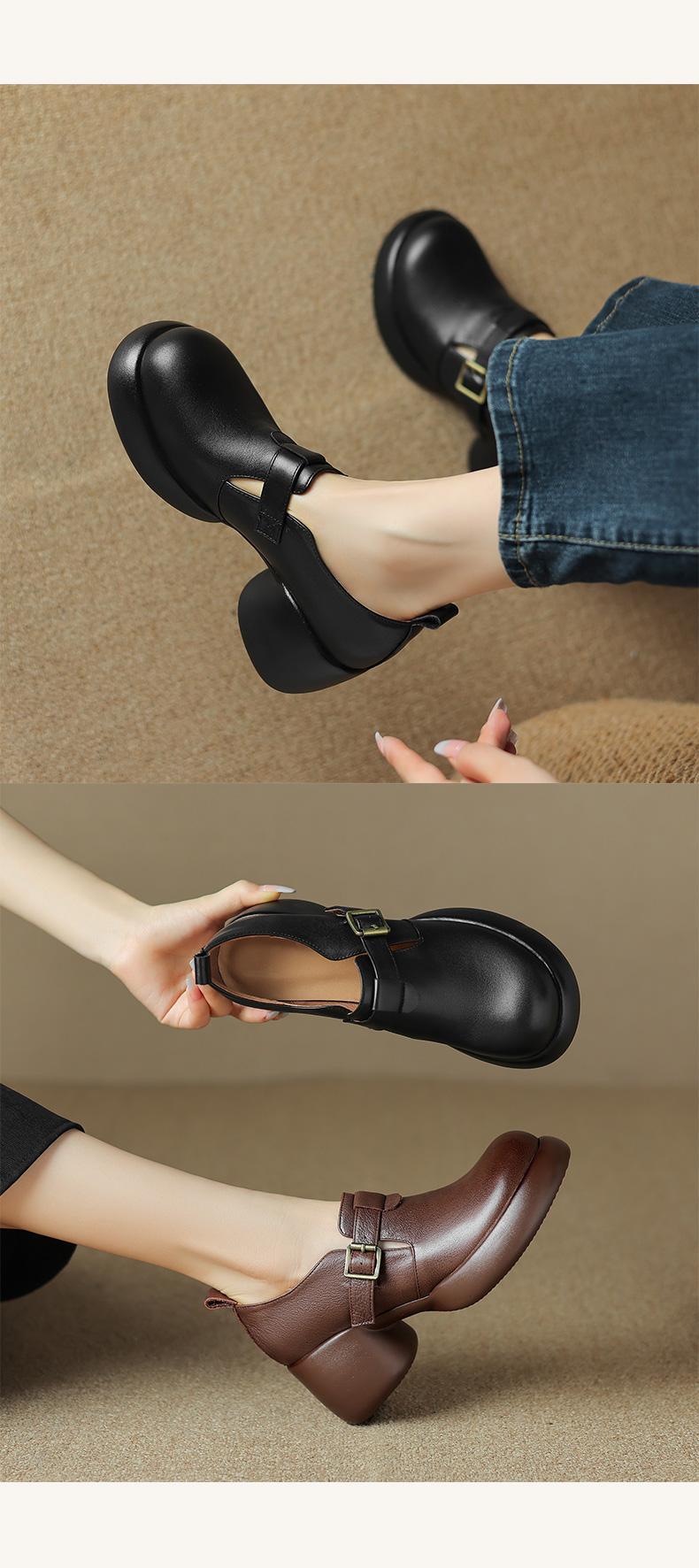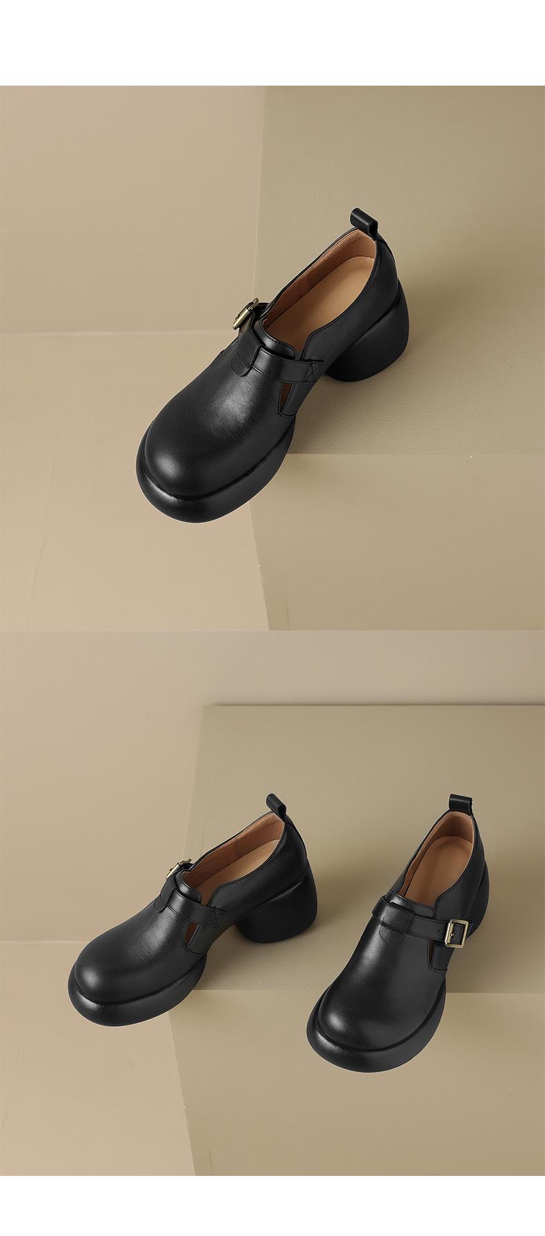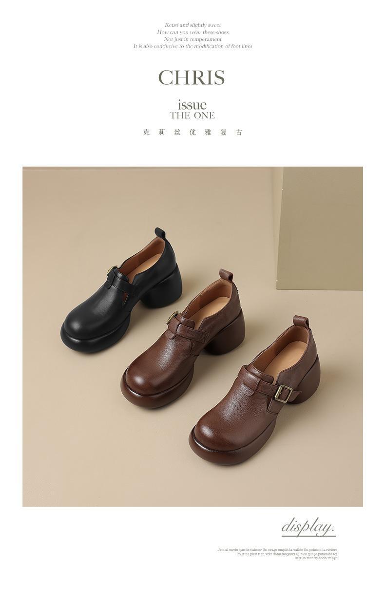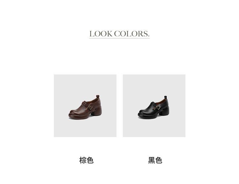 스톰프 느낌 정품 가죽 두꺼운 밑창 작은 가죽 신발 여성용 2023 새로운 라운드 발가락 깊은 입 단일 레이어 신발 벨트 버클 두꺼운 굽 높은 굽 여성 신발스토어 가기