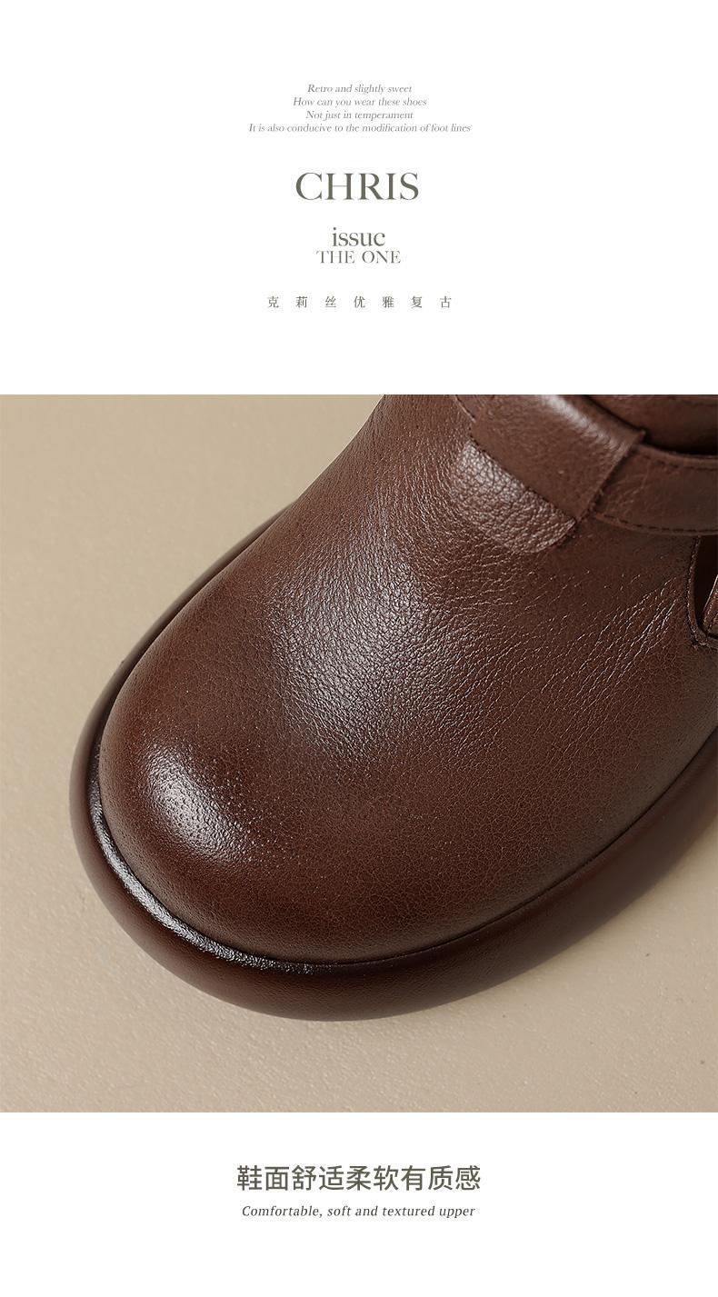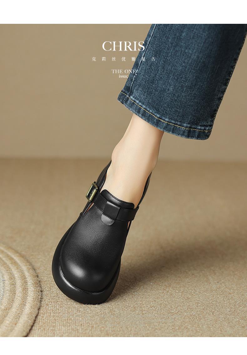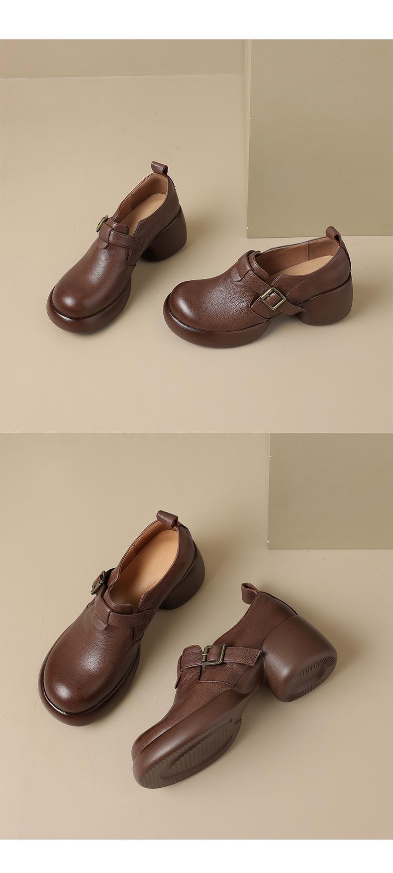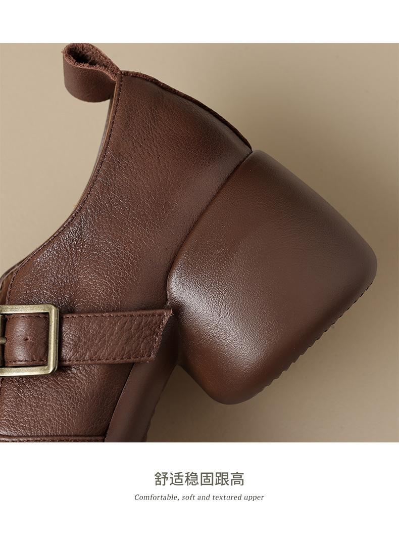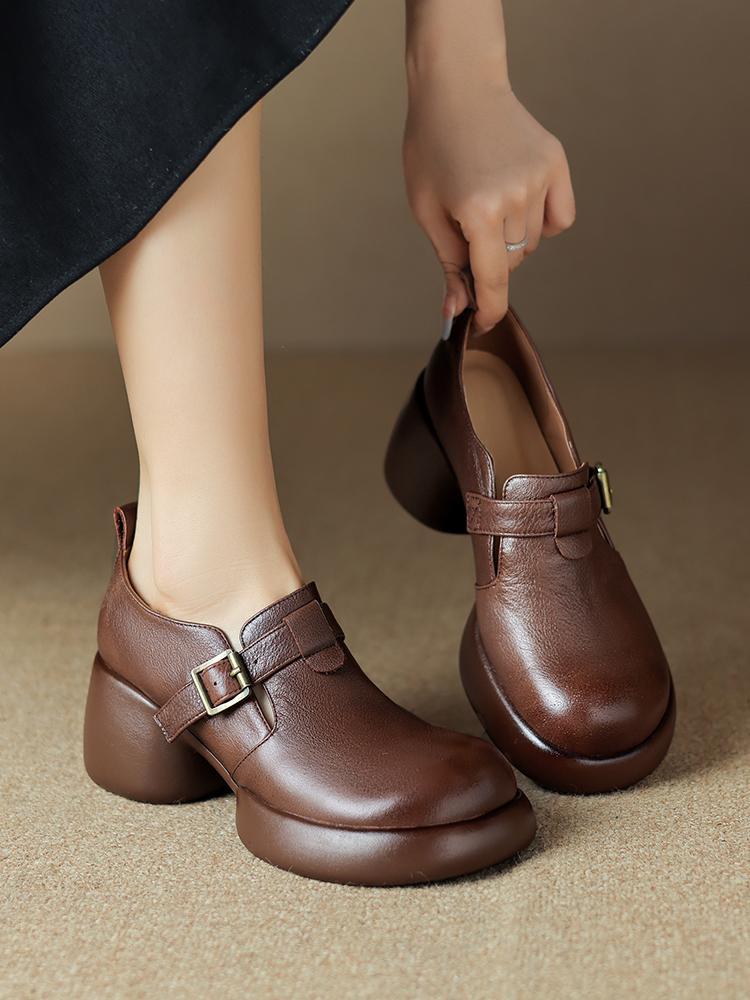 스톰프 느낌 정품 가죽 두꺼운 밑창 작은 가죽 신발 여성용 2023 새로운 라운드 발가락 깊은 입 단일 레이어 신발 벨트 버클 두꺼운 굽 높은 굽 여성 신발