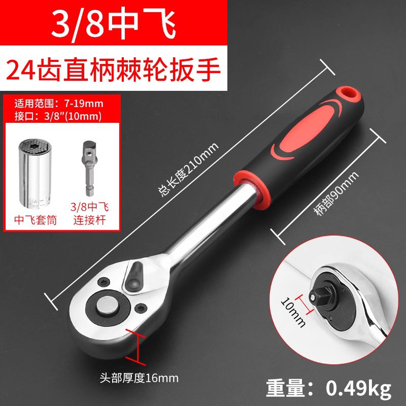 • 3/8 스트레이트 핸들 래칫 렌치 + 범용 소켓 (7-19mm)