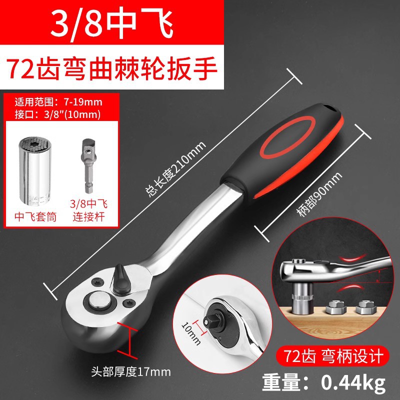 • 3/8 곡선 핸들 래칫 렌치 + 범용 소켓 (7-19mm)