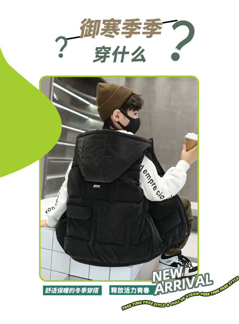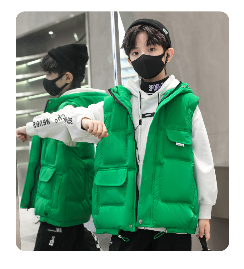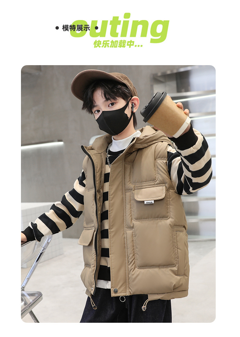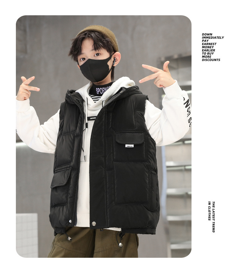 소년 가을과 겨울 다운 면 조끼 2023 새로운 어린이 겨울 옷 두꺼운 후드 탑 잘 생긴 중간 및 큰 어린이 패션