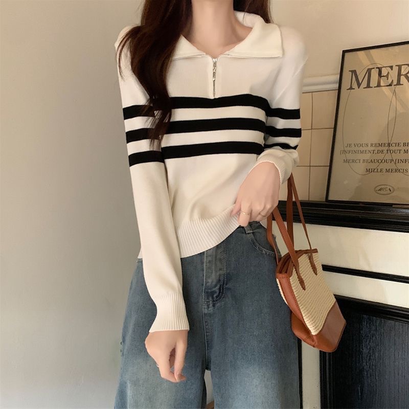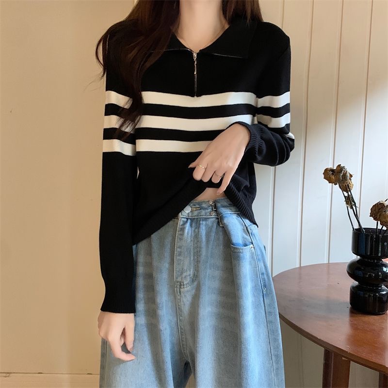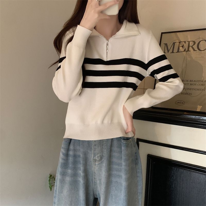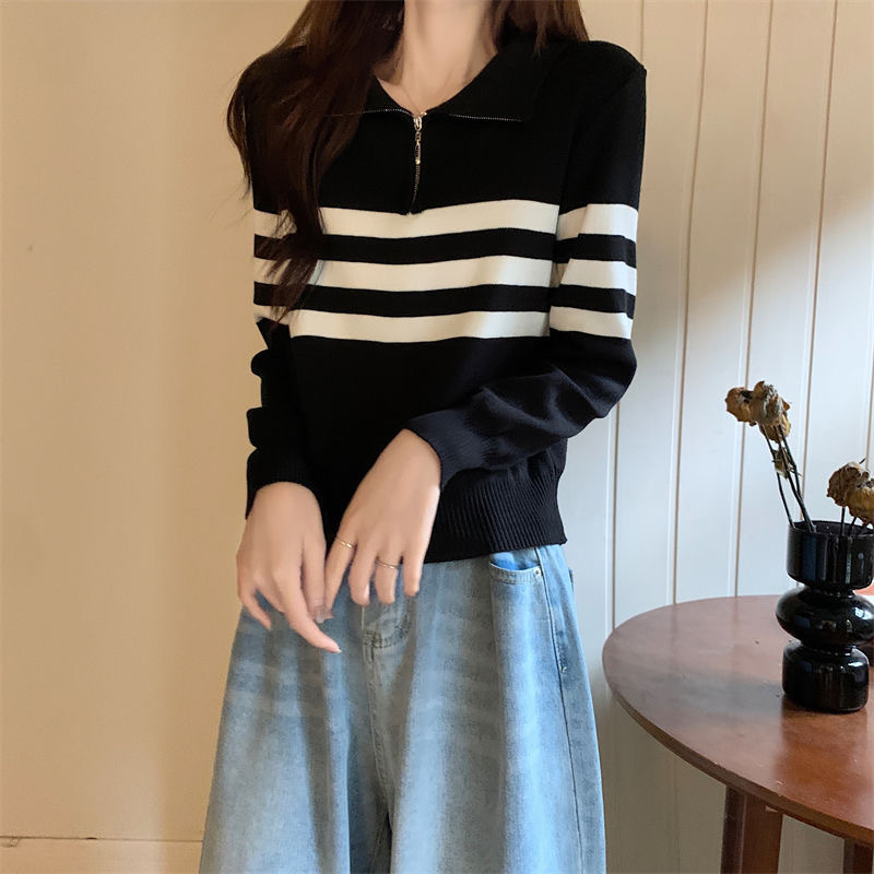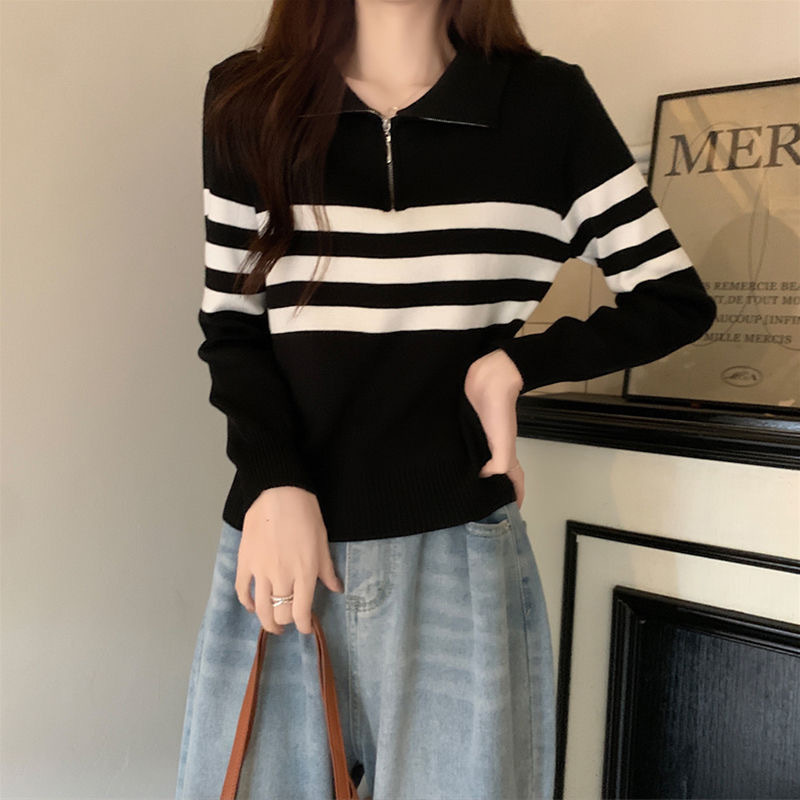 디자인 센스 하프 지퍼 POLO 칼라 스트라이프 스웨터 긴팔 여성 가을 뉴 슬림핏 슬리밍 올매치 탑