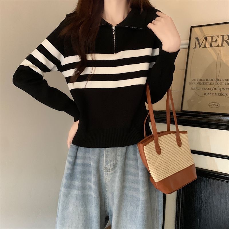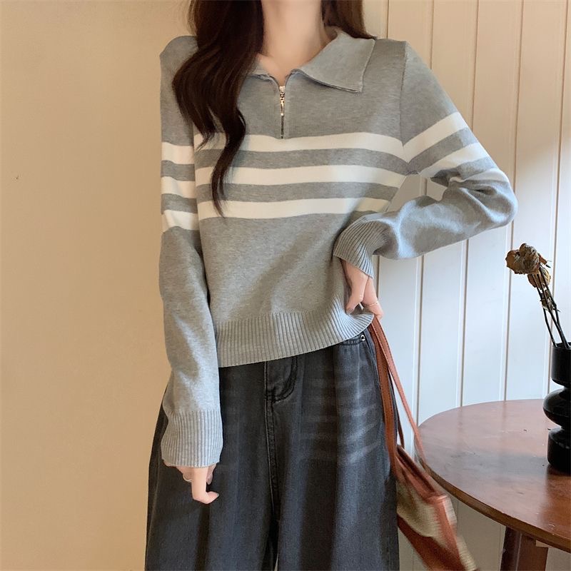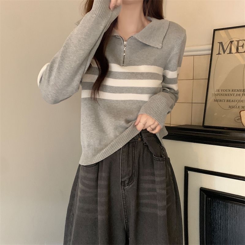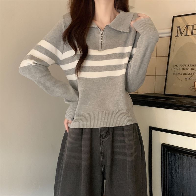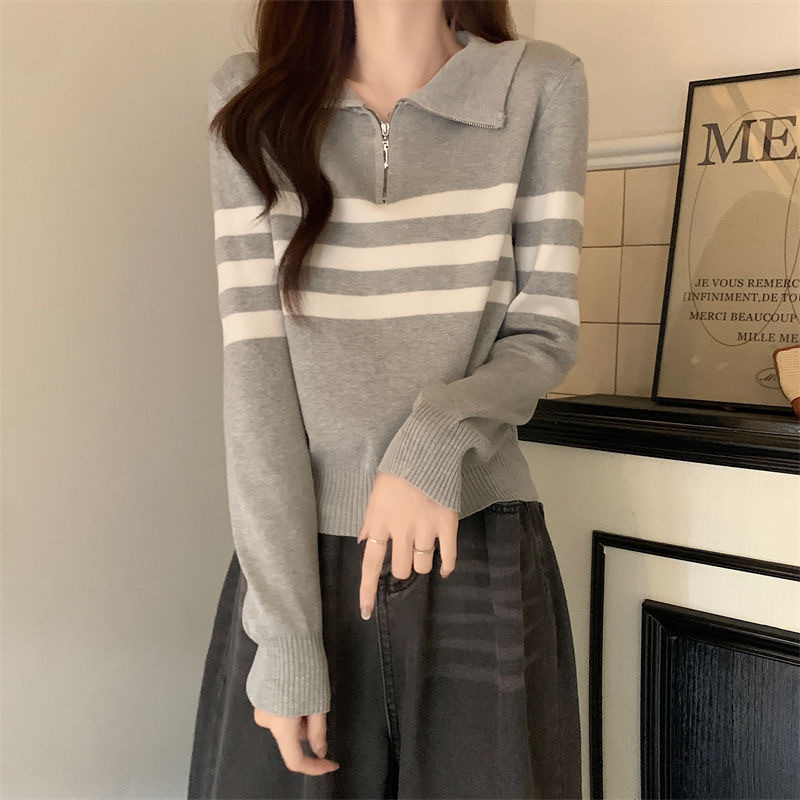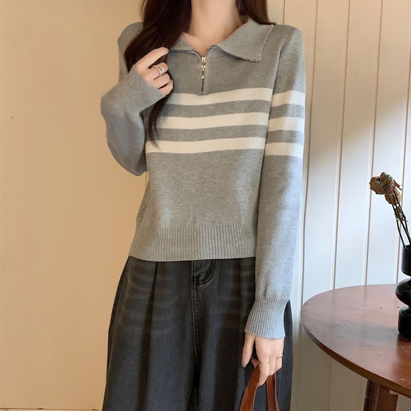 디자인 센스 하프 지퍼 POLO 칼라 스트라이프 스웨터 긴팔 여성 가을 뉴 슬림핏 슬리밍 올매치 탑