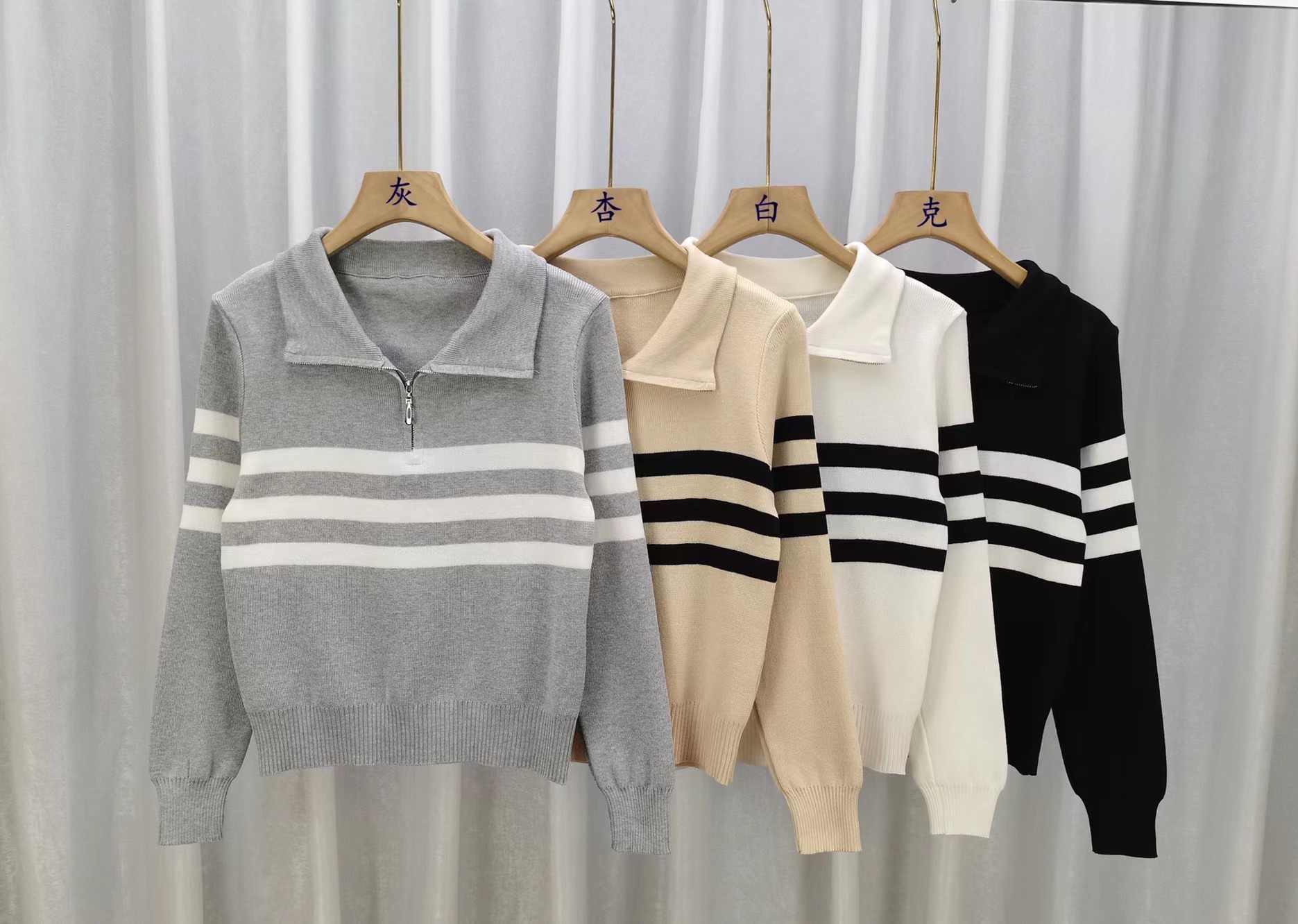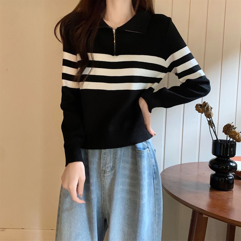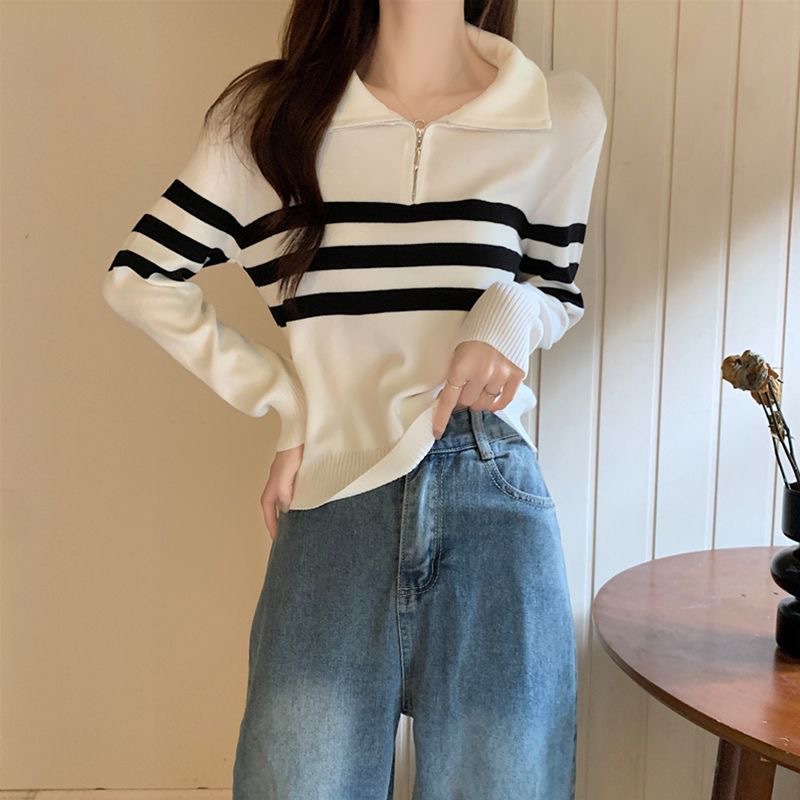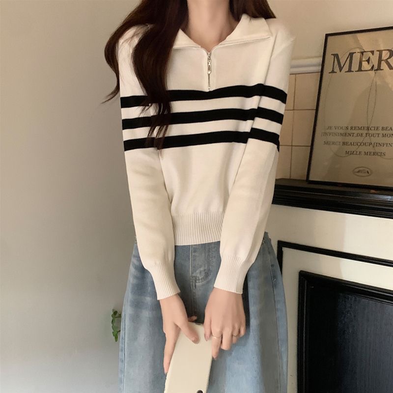 디자인 센스 하프 지퍼 POLO 칼라 스트라이프 스웨터 긴팔 여성 가을 뉴 슬림핏 슬리밍 올매치 탑스토어 가기