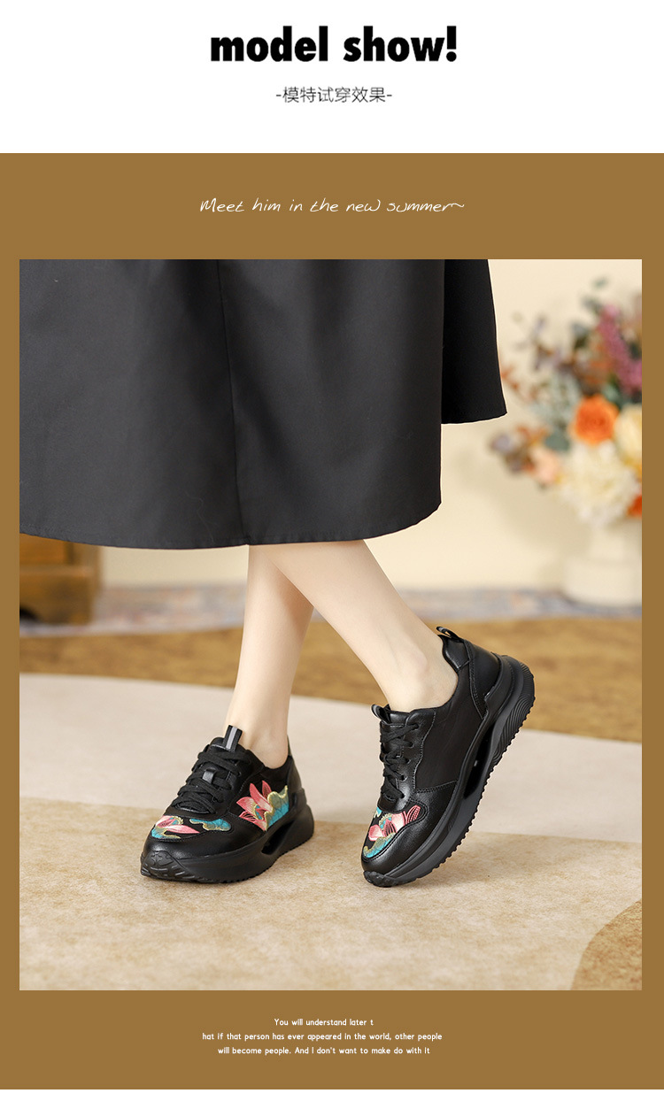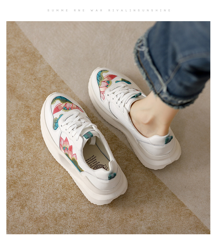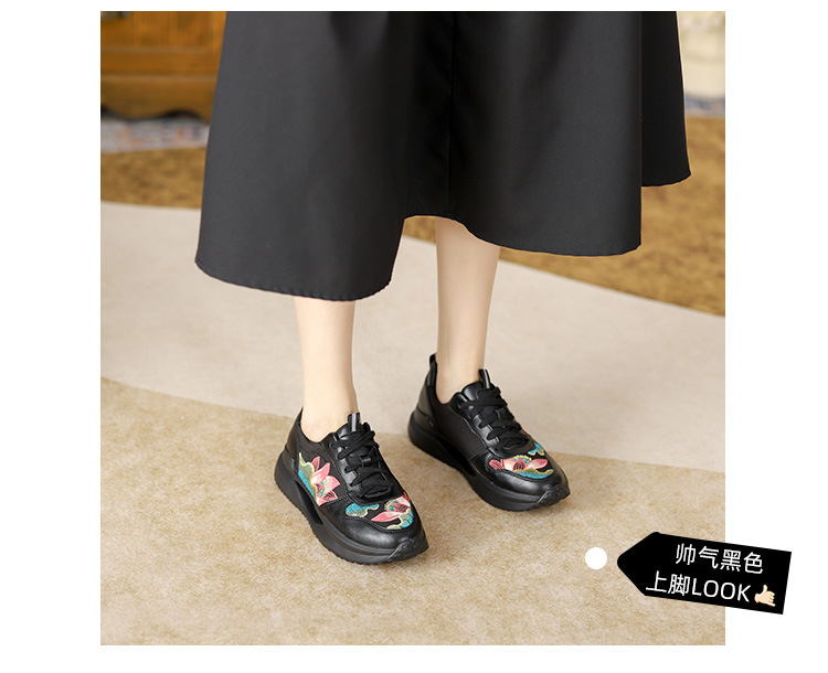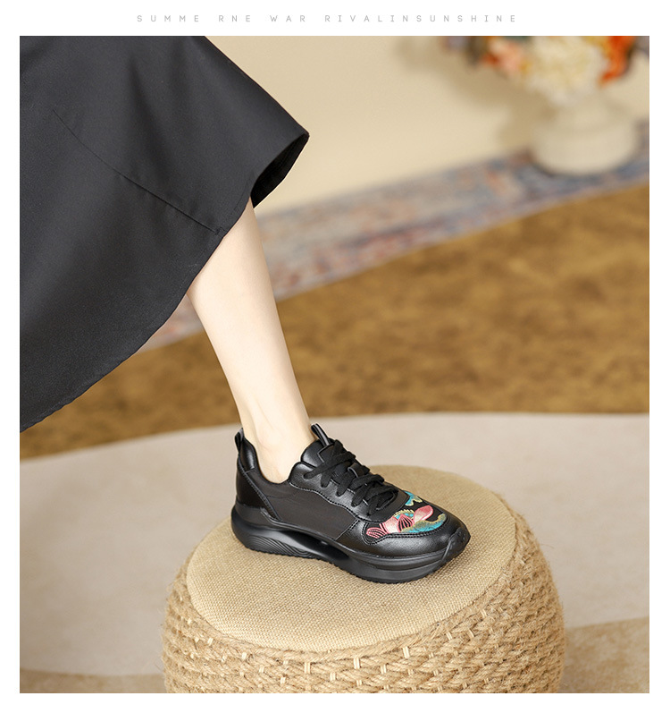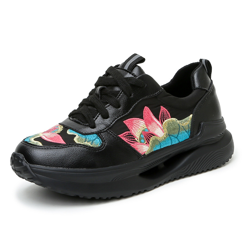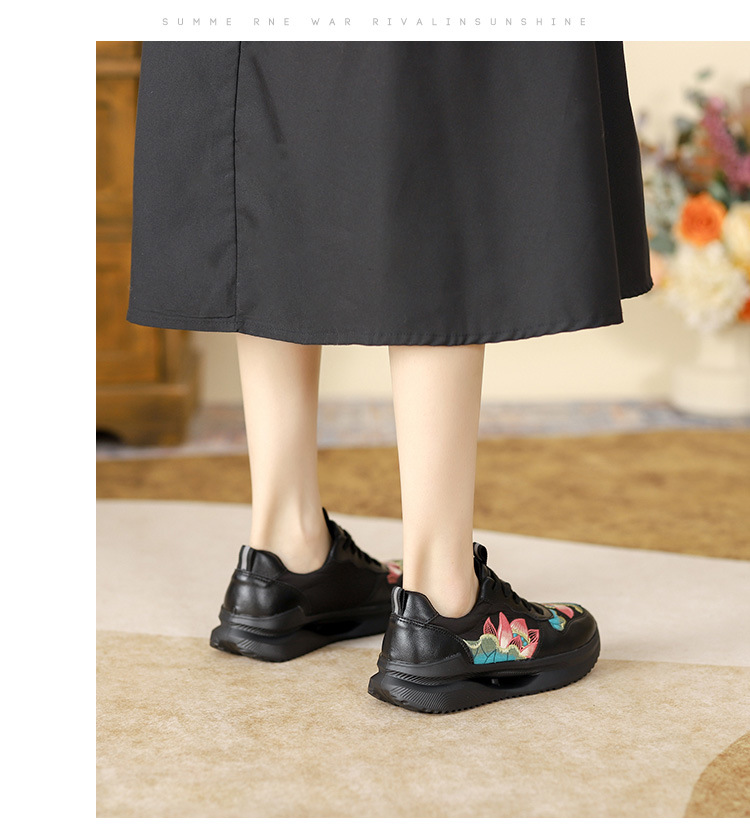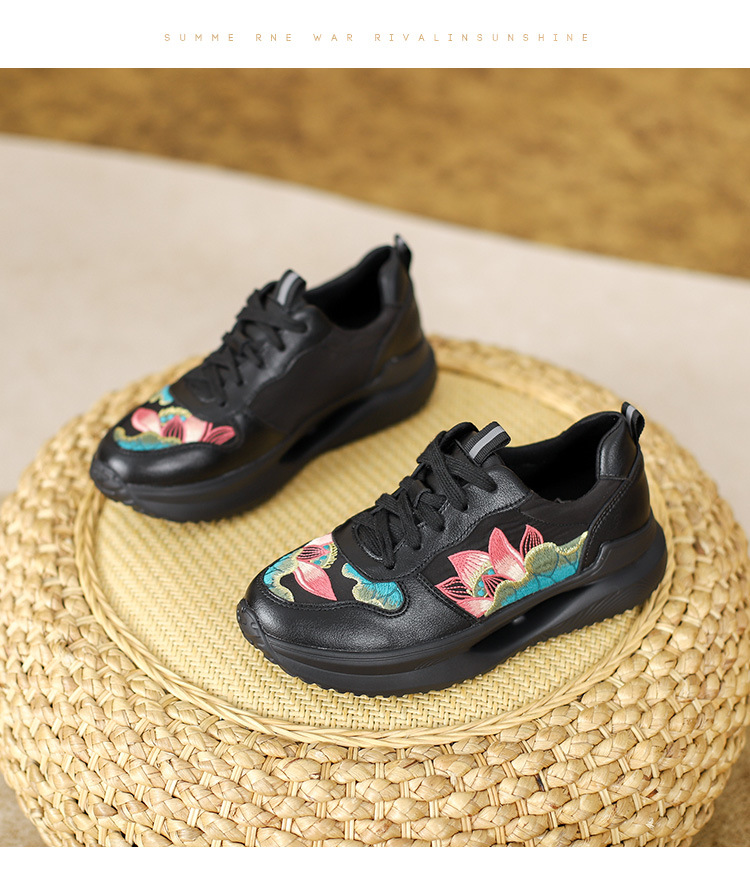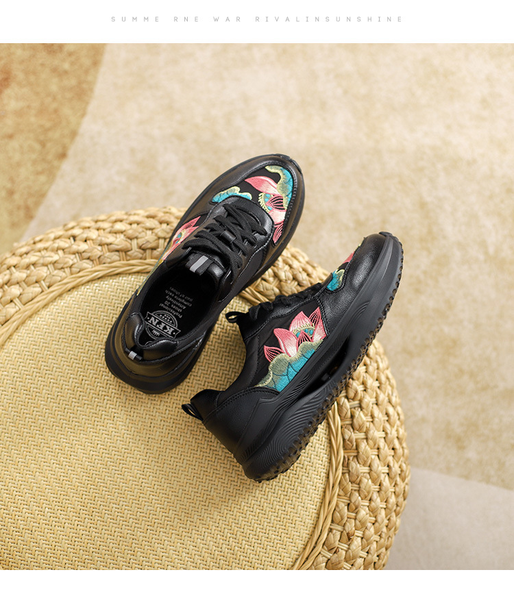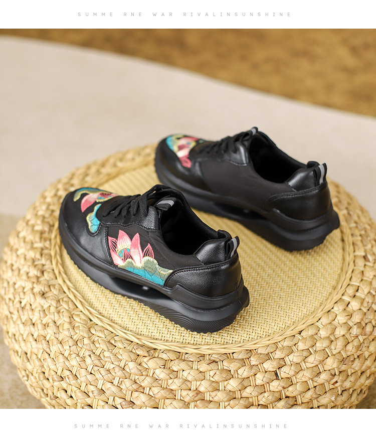 중국풍 가죽 자수 여성화, 중국 스타일 패션, 다용도, 럭셔리, 정교한 레이스업 스포츠 캐주얼 연꽃 두꺼운 밑창 신발스토어 가기