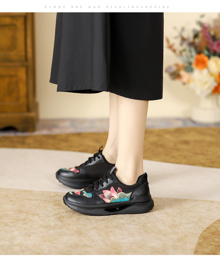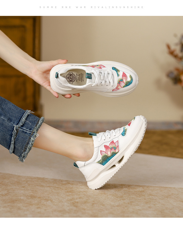 중국풍 가죽 자수 여성화, 중국 스타일 패션, 다용도, 럭셔리, 정교한 레이스업 스포츠 캐주얼 연꽃 두꺼운 밑창 신발