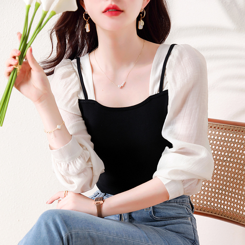 2023 가을 디자인 센스 프랑스 틈새 스티칭 가짜 투피스 스퀘어 칼라 퍼프 슬리브 슬림 캐주얼 탑 여성용