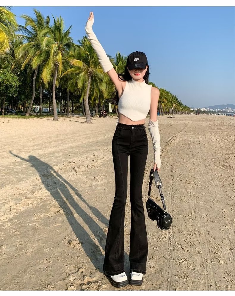아메리칸 스타일 레트로 마이크로-라르 청바지 여성의 가을 2023 새로운 하이 웨이스트 슬림 룩 작은 말굽 러프 플레어 팬츠