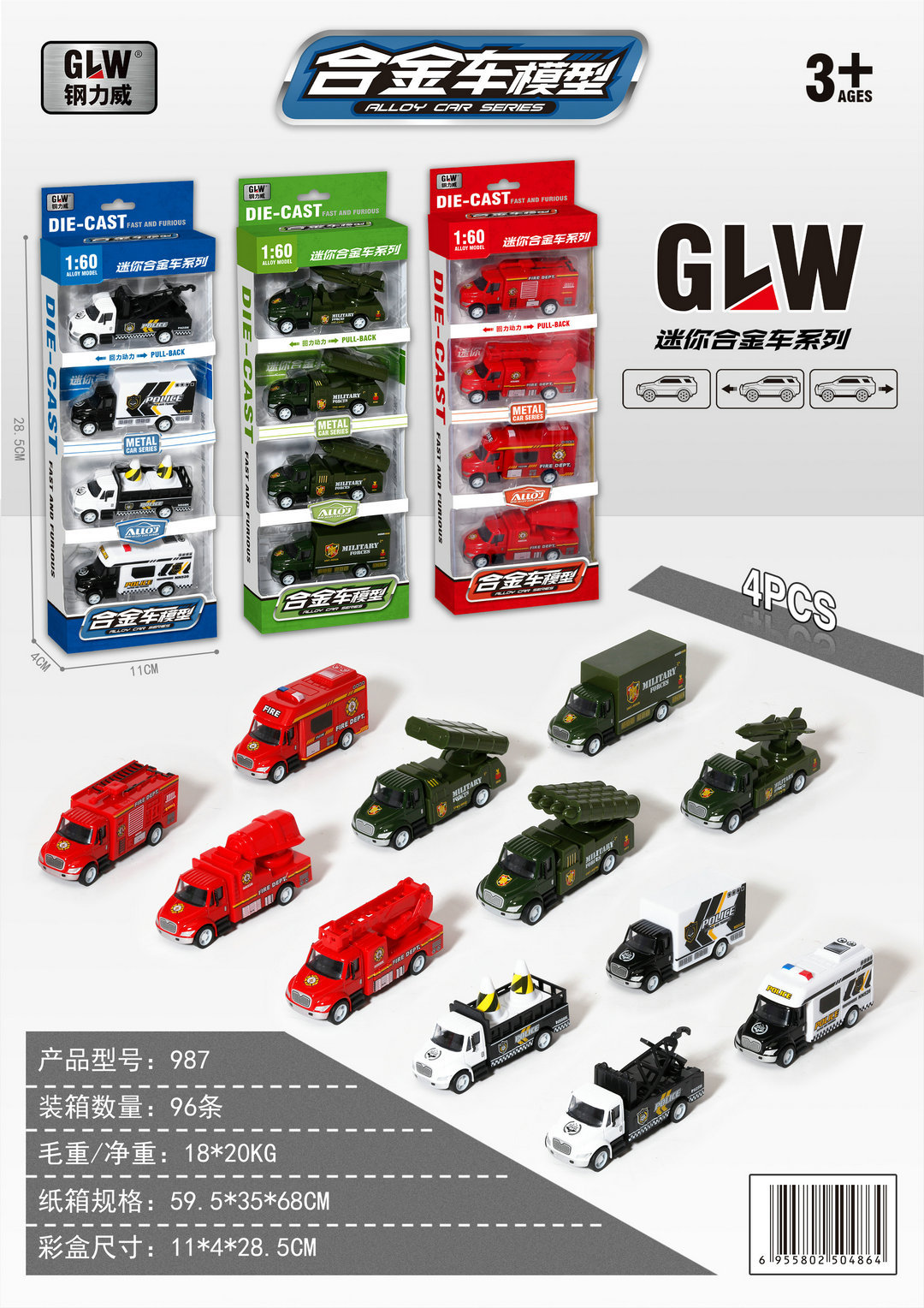 4 합금 슬라이딩 군사 화재 경찰차 987 놀이 집 마구간 자동차 모델 어린이 시뮬레이션 장난감 도매