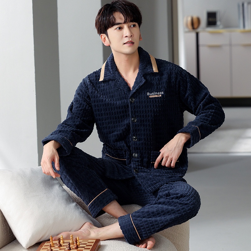 가을과 겨울 플란넬 두껍게 플러스 벨벳 잠옷 남성 겨울 세트 편안한 핏 레저 스탠드 칼라 지퍼 아일랜드 벨벳