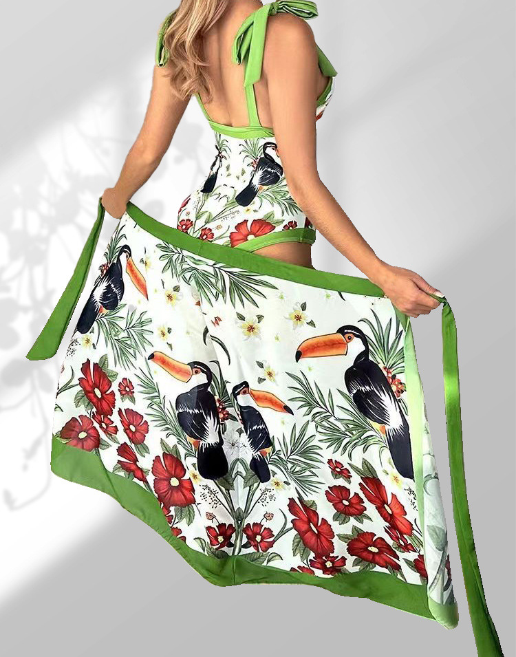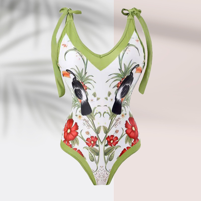 2024 유럽과 미국의 새로운 도착 프랑스 스타일 레트로 버드 프린트 수영복 신선한 해변 원피스 투피스 수영복 여성용