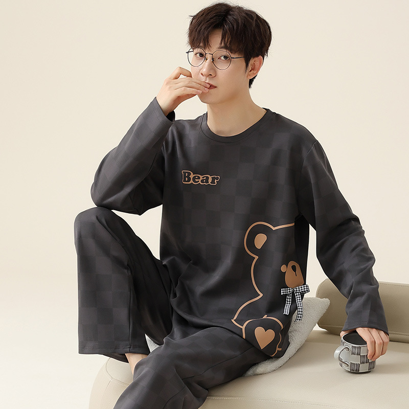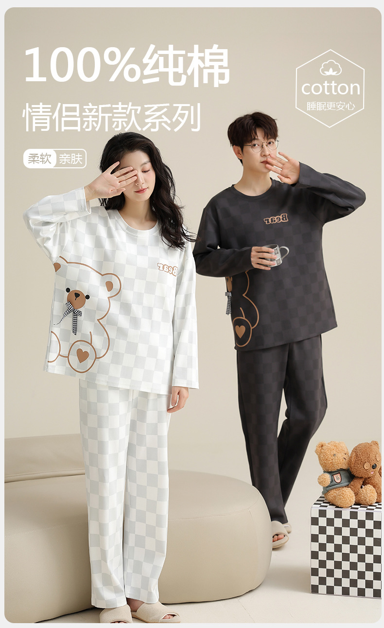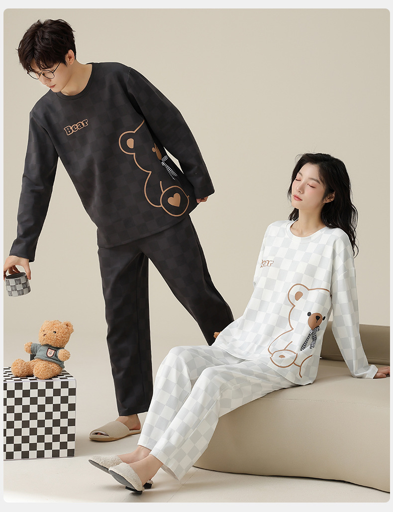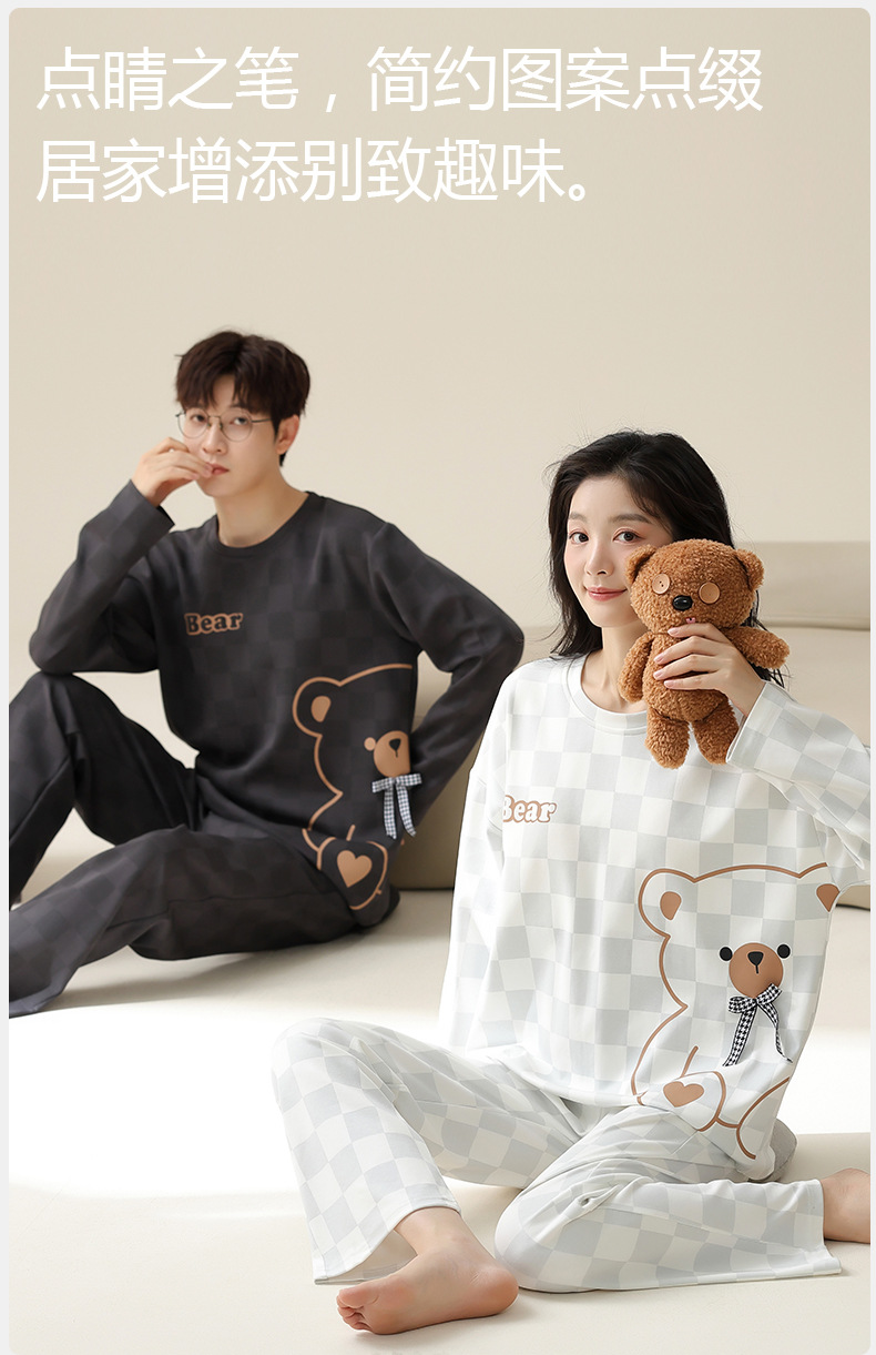 [순면] 커플 잠옷 여성용 가슴 패드 포함 봄 가을 겨울 긴팔 만화 남성용 홈웨어 세트 패션