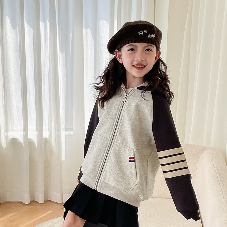 어린이 양털 후드 재킷 Congxiaomei 2025 가을, 겨울 스타일 소년과 소녀를위한 세련된 대비 색상 캐주얼 야구 유니폼 탑