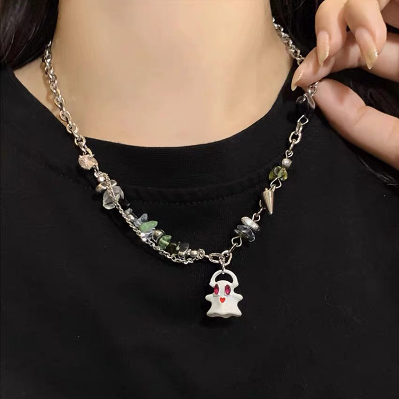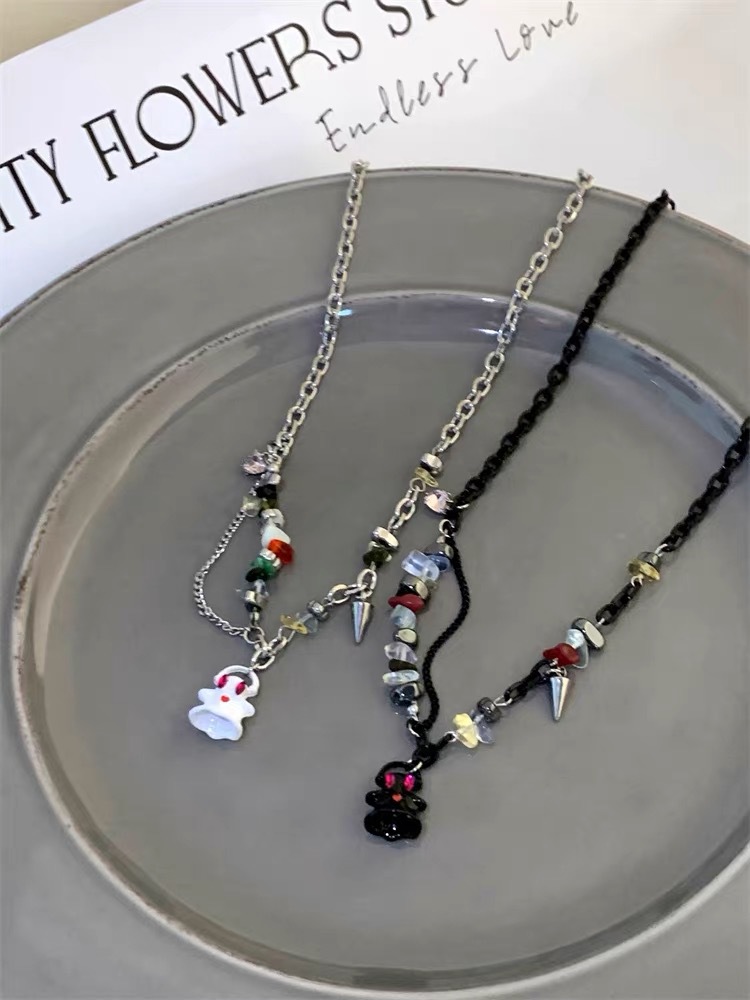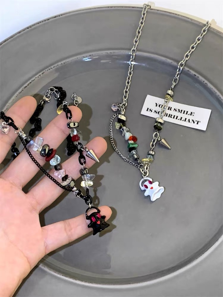 흑백 작은 유령 괴물 목걸이 여성용 티타늄 스틸 체인 자갈 스티칭 쇄골 체인 틈새 디자인 커플 목걸이 트렌디스토어 가기