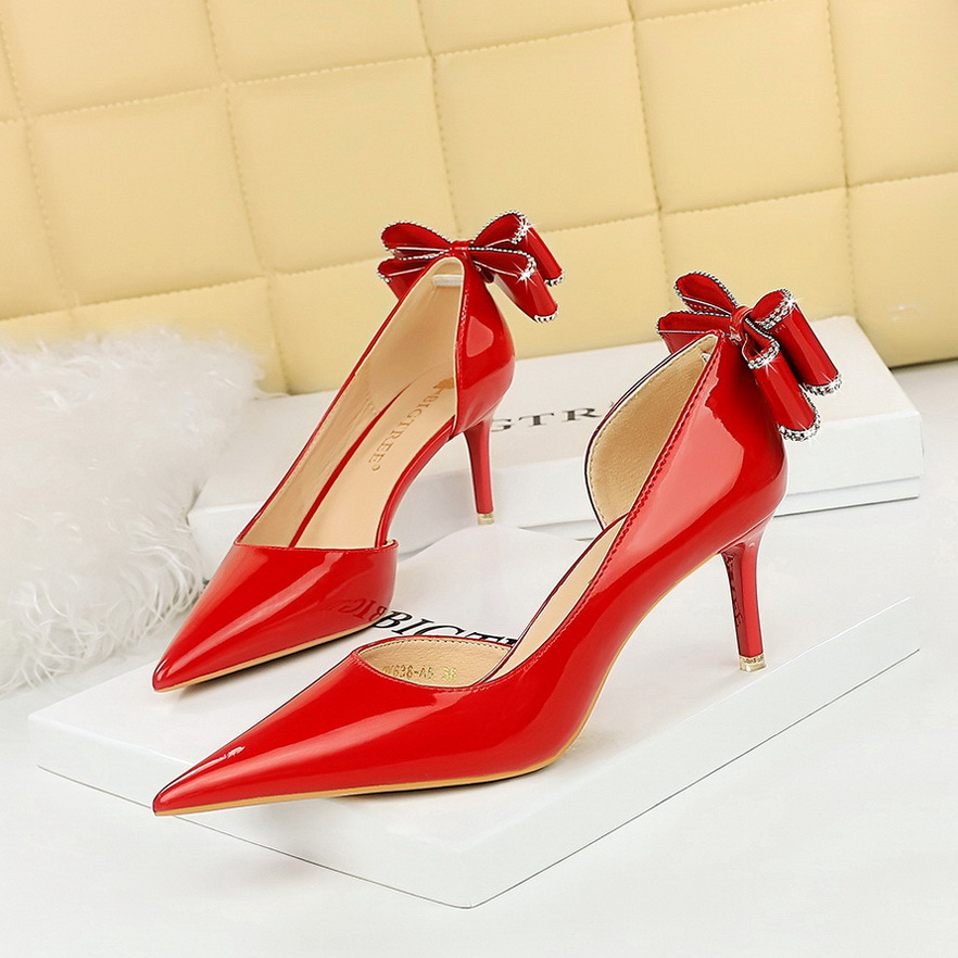 638-AH35M 한국식 연회 하이힐 스틸레토 힐 얕은 입 뾰족한 측면 중공 에나멜 가죽 후면 활 단층 신발스토어 가기
