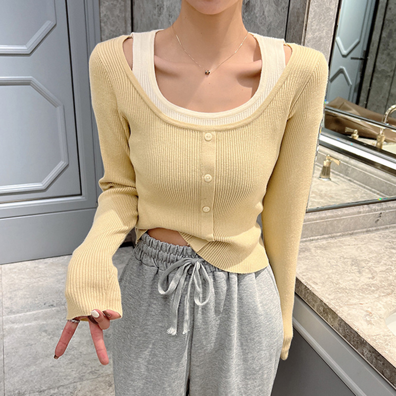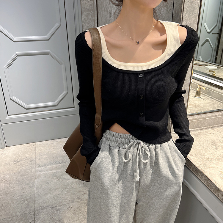 한국 세련된 가을 새로운 스티치 가짜 투피스 스웨터 2023 디자인 얇은 짧은 긴 소매 탑 여성