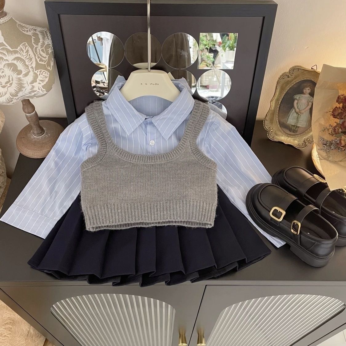 여자 대학 스타일 쓰리 피스 아기의 가을 조끼 블루 스트라이프 셔츠 플리츠 스커트 78098스토어 가기