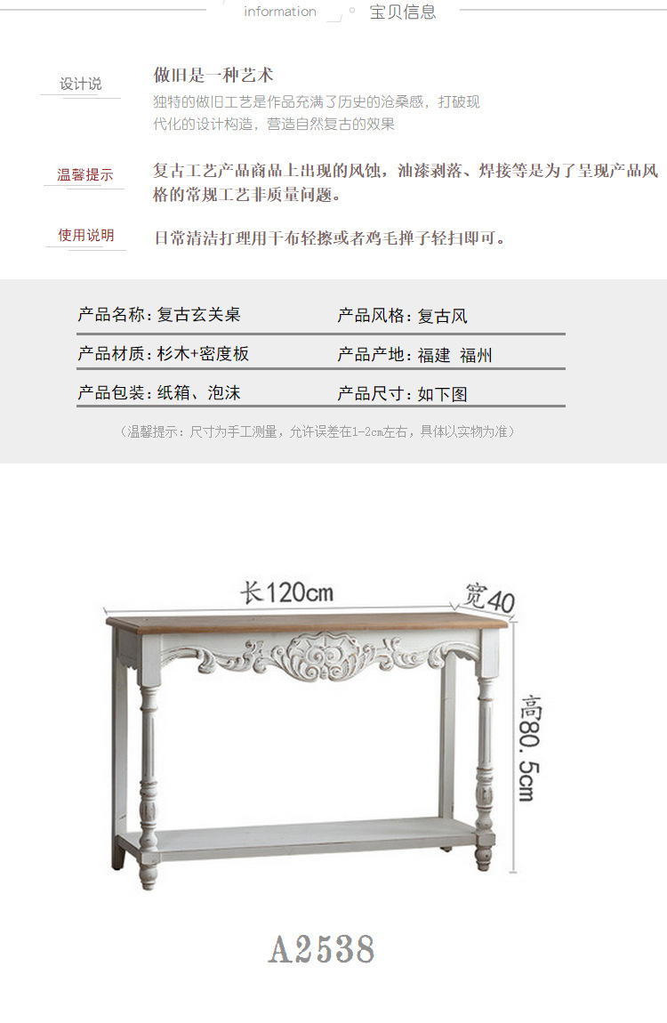 프랑스 스타일 입구 테이블 거실 단단한 나무 조각 오래된 테이블 빈티지 입구 캐비닛 좁은 테이블 벽 장식 흰색스토어 가기