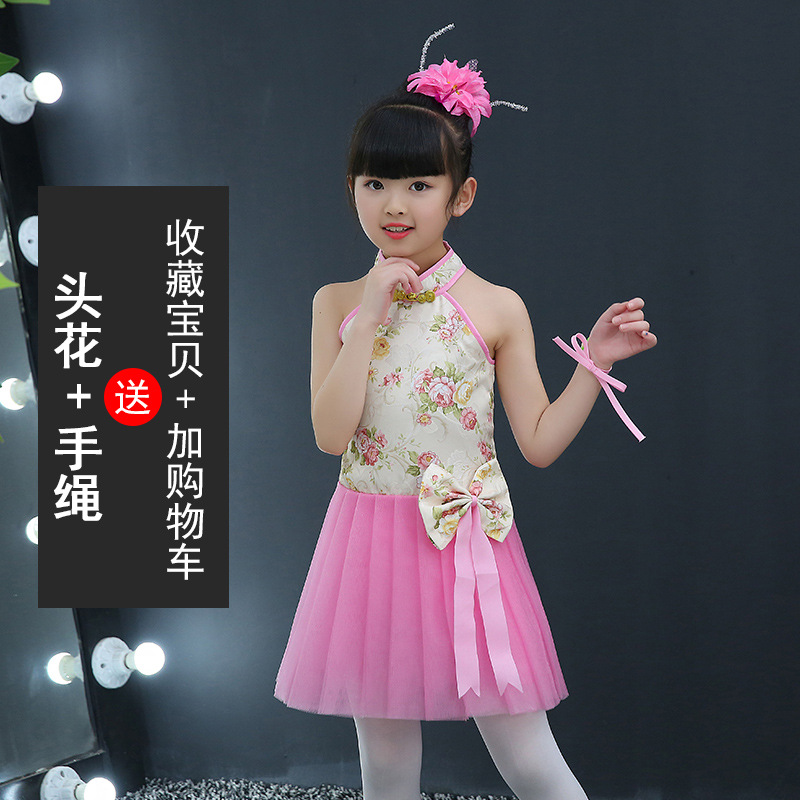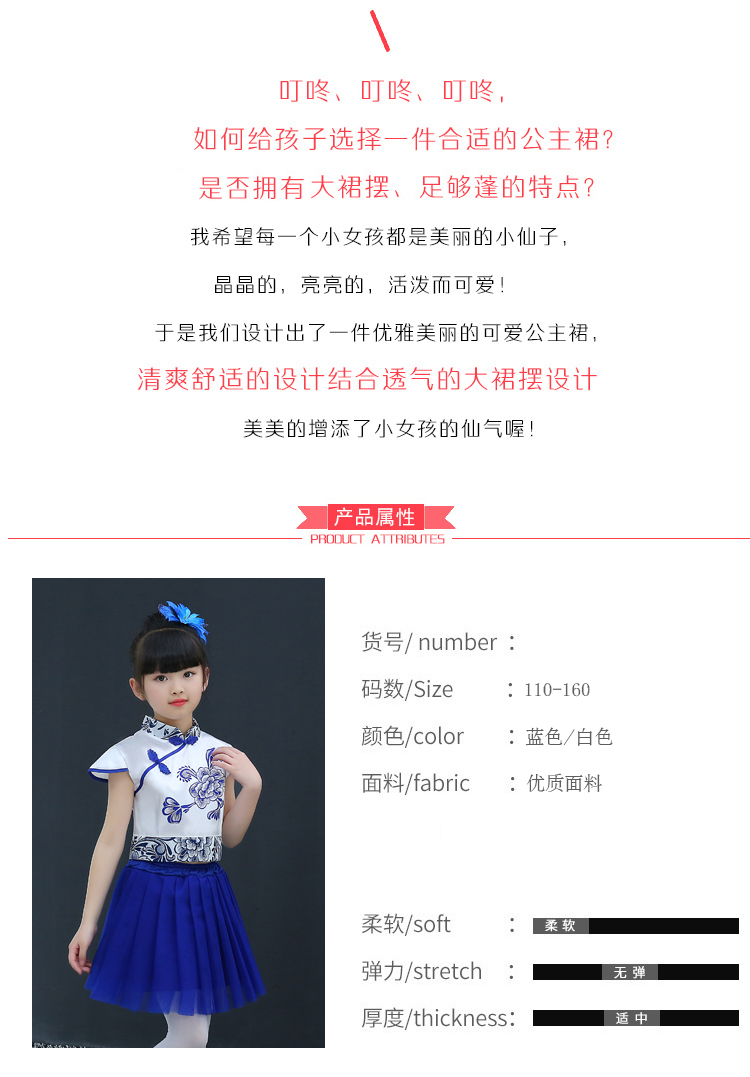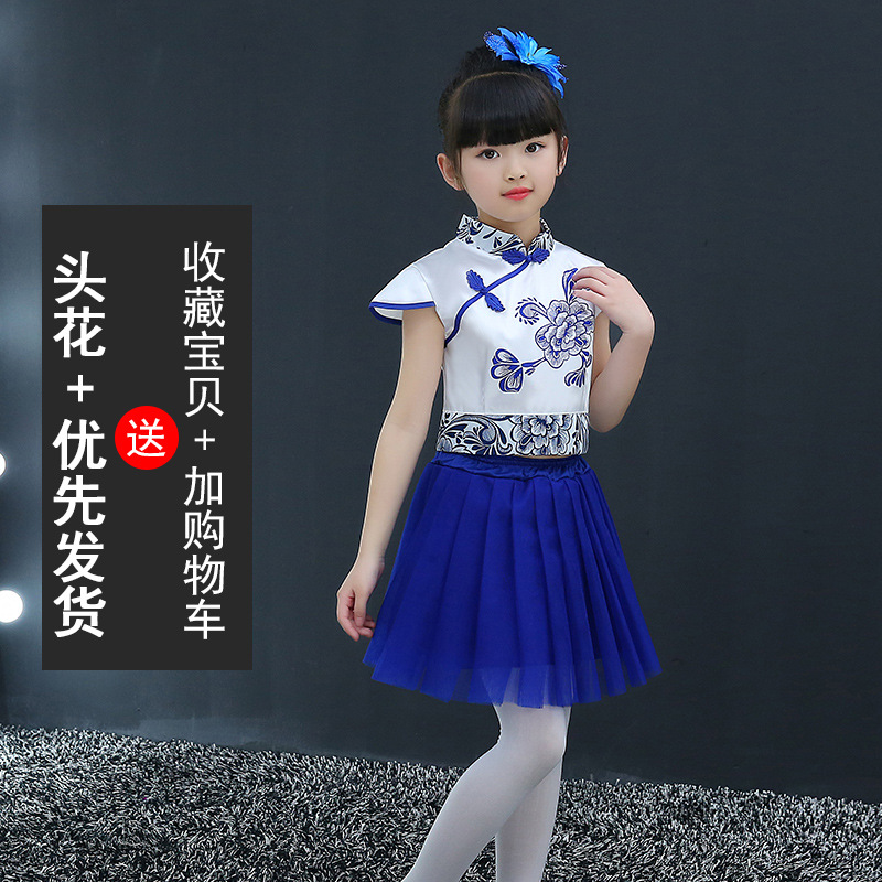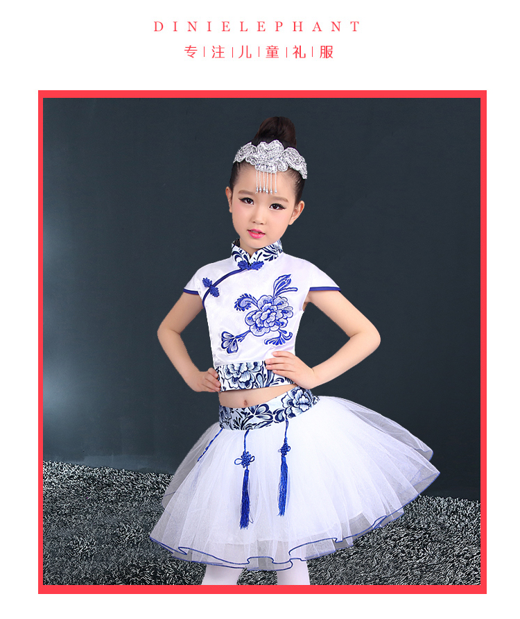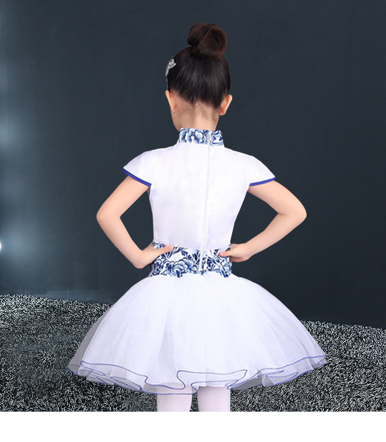 어린이 파란색과 흰색 도자기 원피스 합창 원피스 소녀 민족 Guzheng 공연 원피스 중국 스타일 댄스 투투 원피스스토어 가기