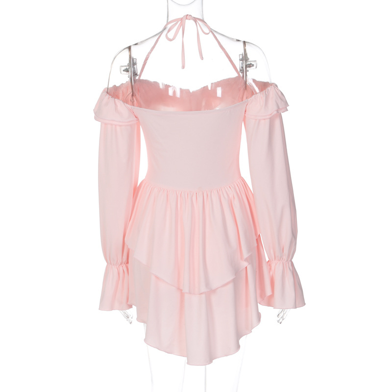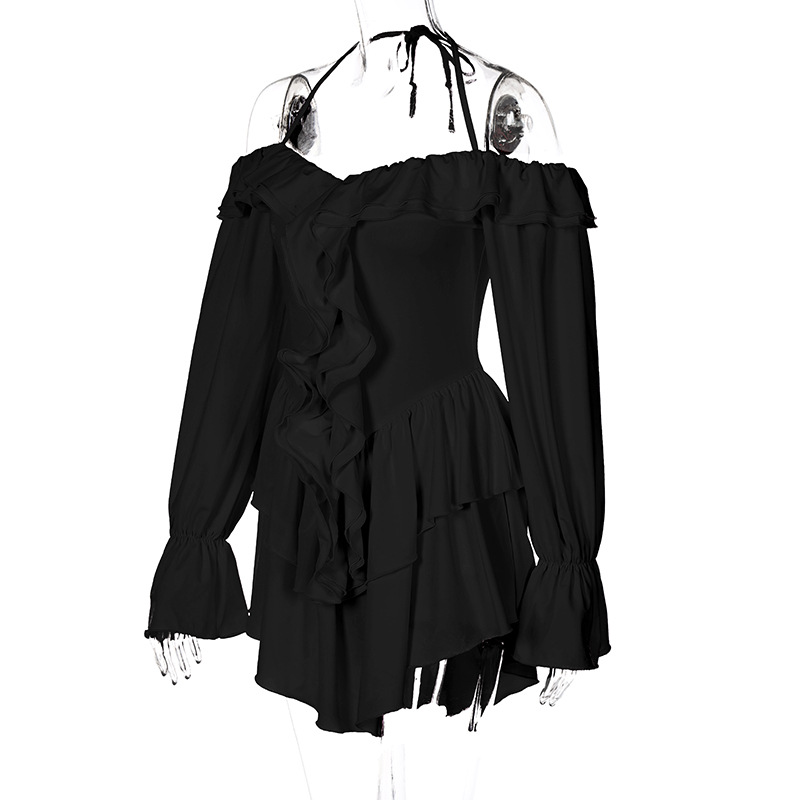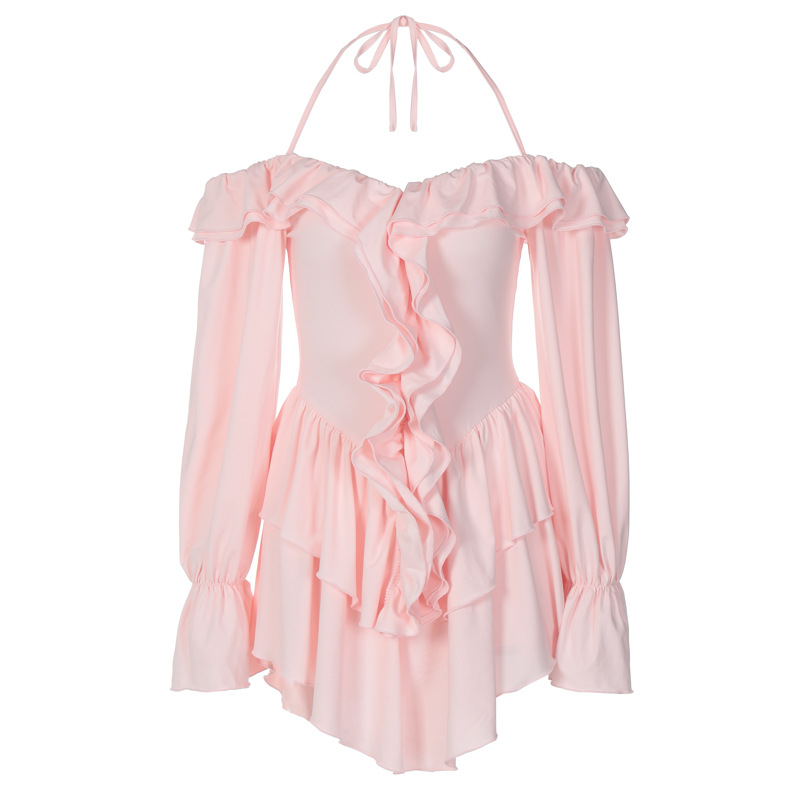 유럽과 미국 스타일의 국경 간 여성 의류 2025 새로운 여름 스타일 섹시한 홀터넥 로우 컷 프릴 긴팔 점프 슈트 드롭 배송스토어 가기
