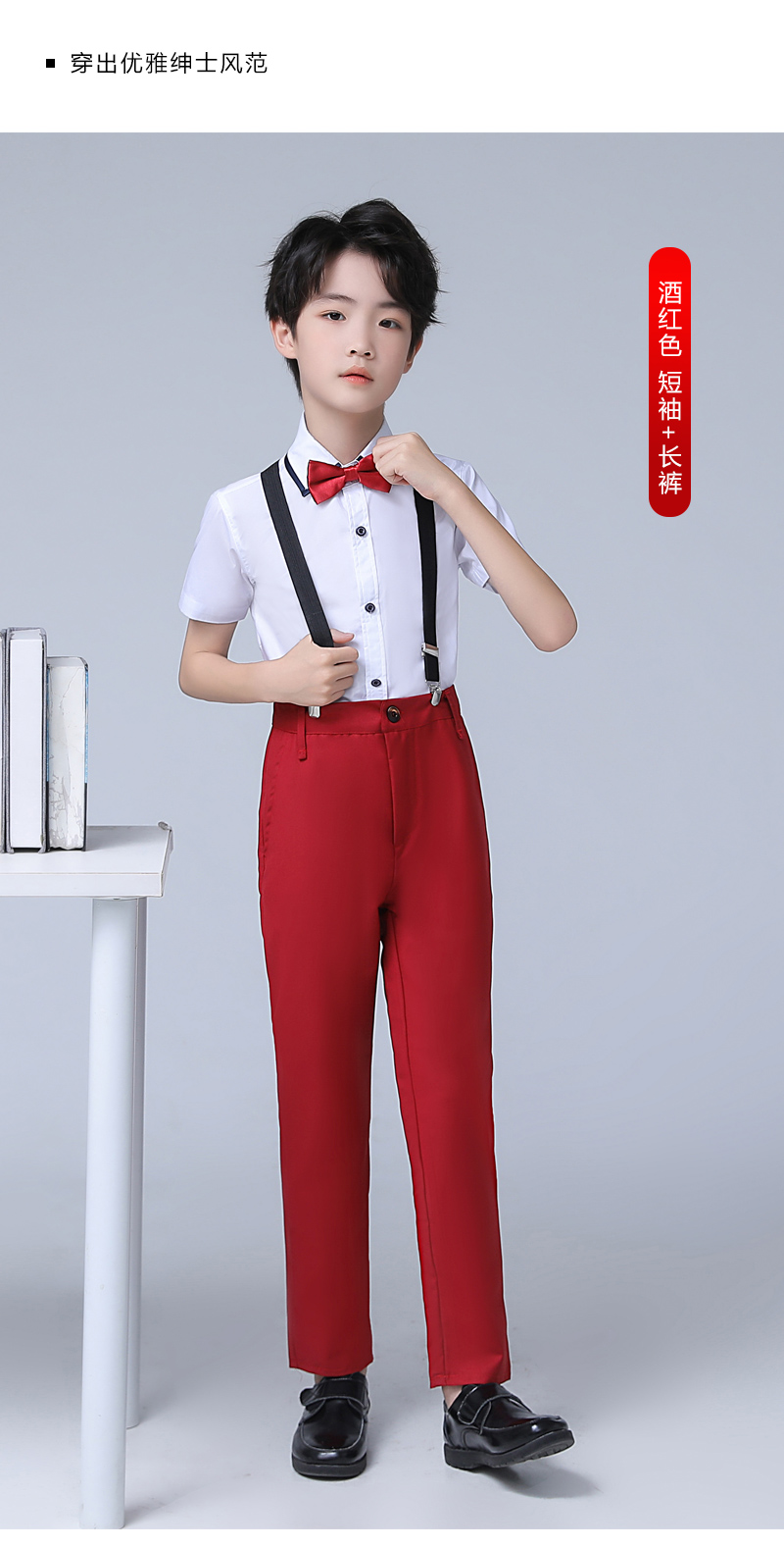 • 흰색 버건디 반팔 바지 멜빵