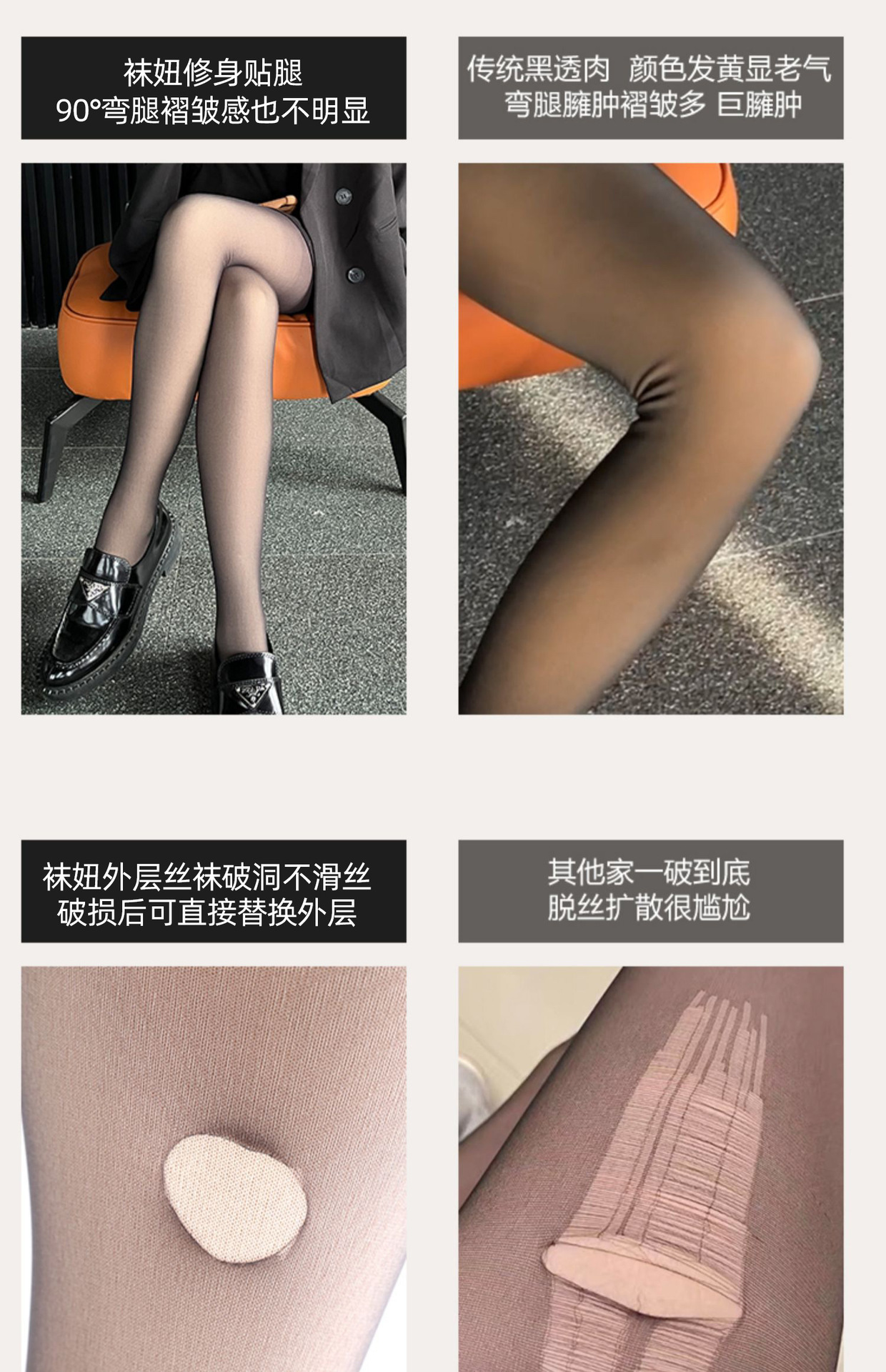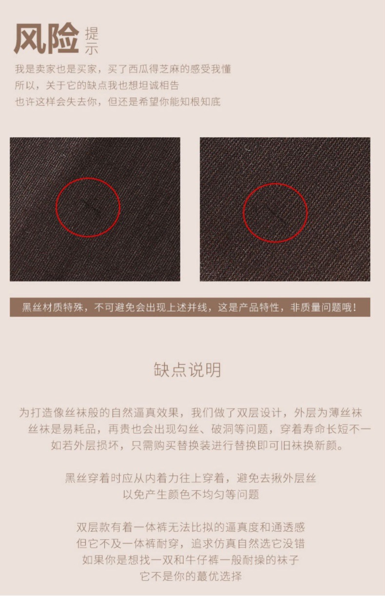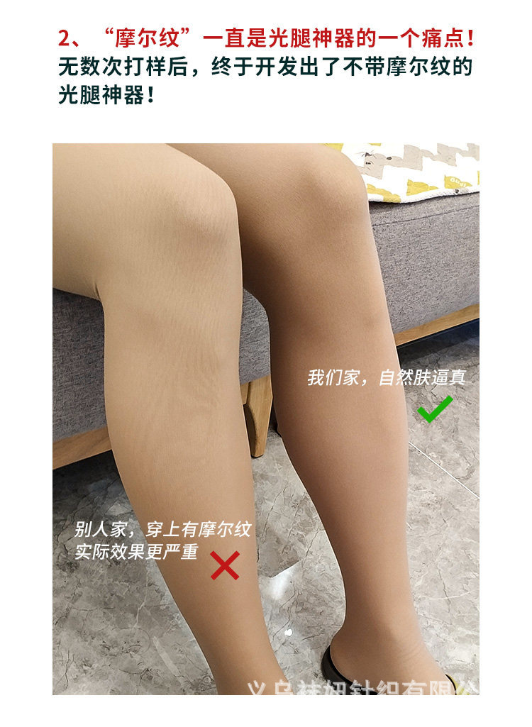 优势3.加绒黑丝光腿神器质量领先市场,今年牢度升级一倍,外层采用进口双股丝,市面都是国产单股丝,更加耐穿不容易勾破!此原料只供我家签了单独协议。欢迎对比