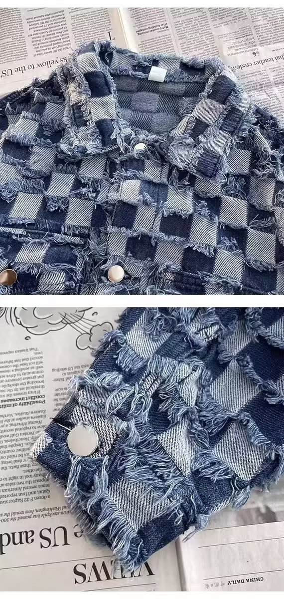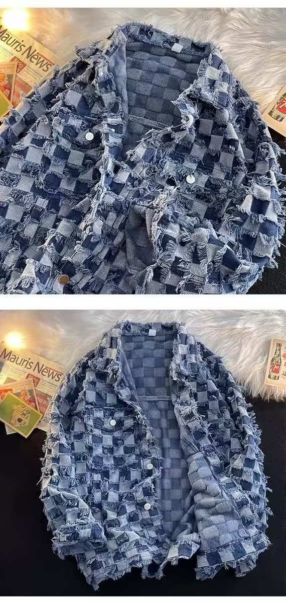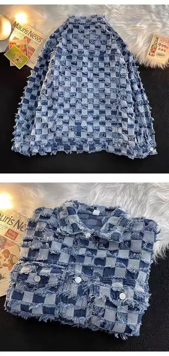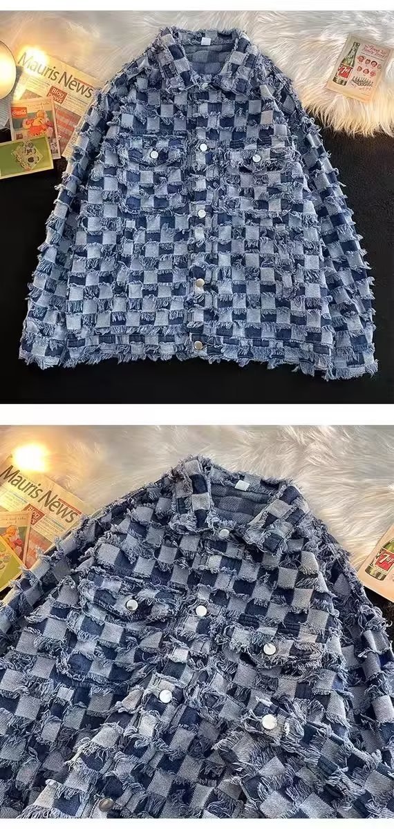 남성과 여성을위한 체스 판 격자 무늬 데님 재킷 봄과 가을 미국 스타일 하이 스트리트 인스 타 그램 인기있는 브랜드 복고풍 디자인 감각 느슨한 재킷스토어 가기