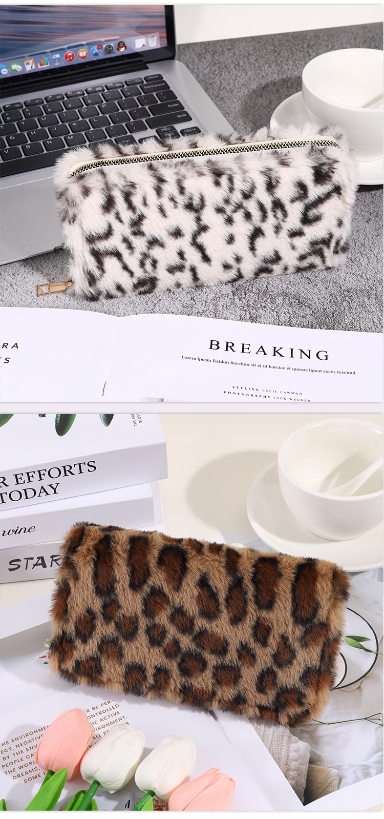 2024년 크로스보더 레오파드 프린트 플러시 지갑, 개성 있는 심플한 털가방, 휴대용 수납 클러치백 카드홀더
