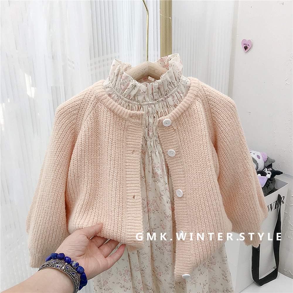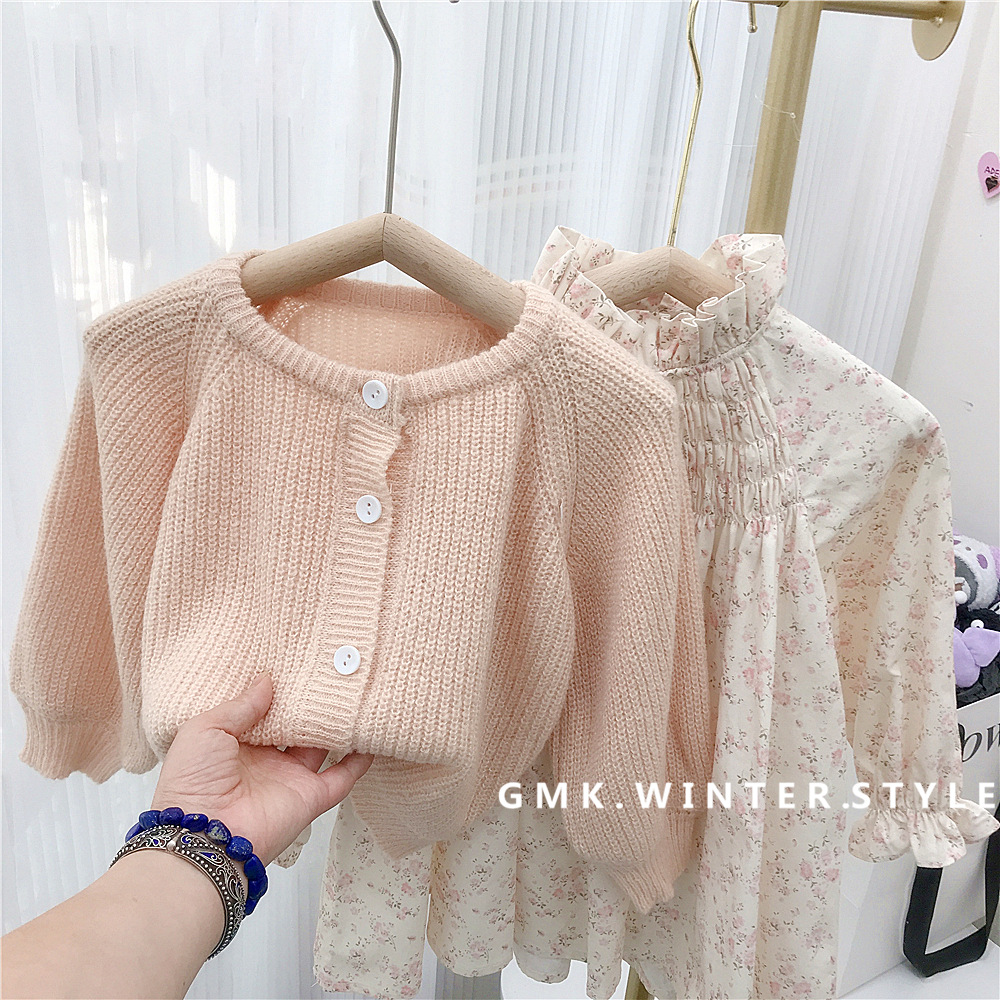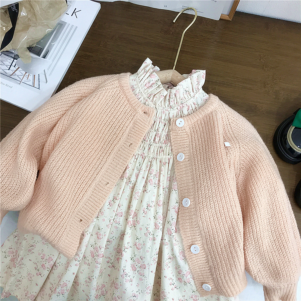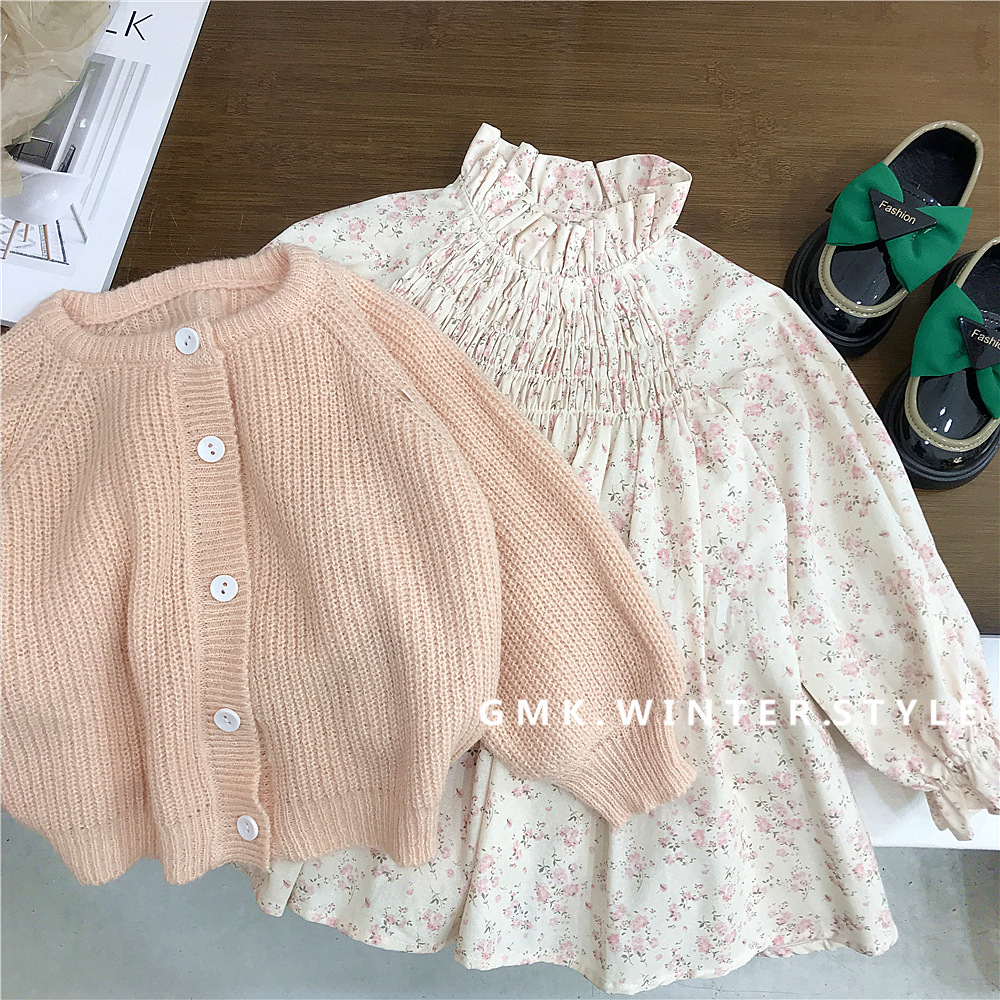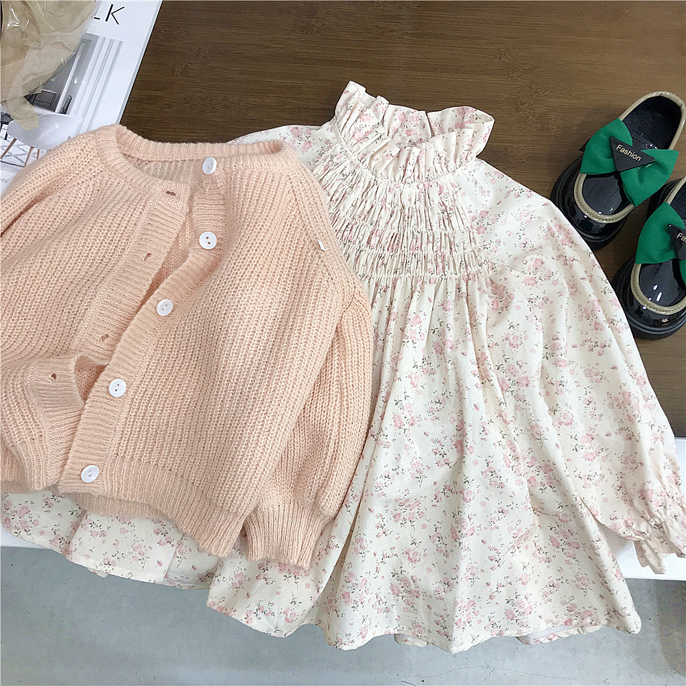 여자 가을 세트 외국 무역 여성 아기 니트 버블 슬리브 스웨터 코트 꽃 무늬 원피스 패션의 새로운 한국어 버전스토어 가기