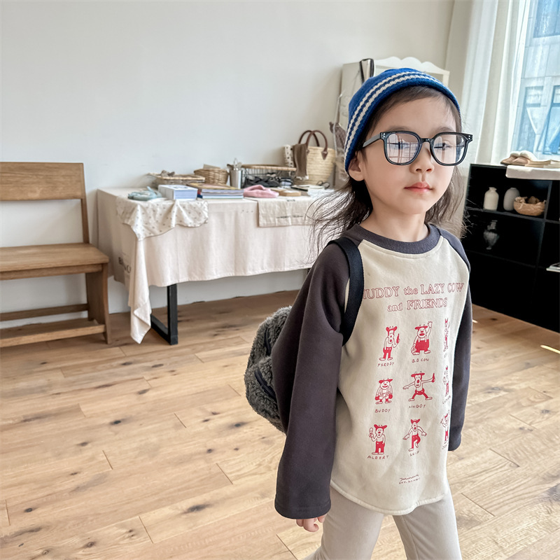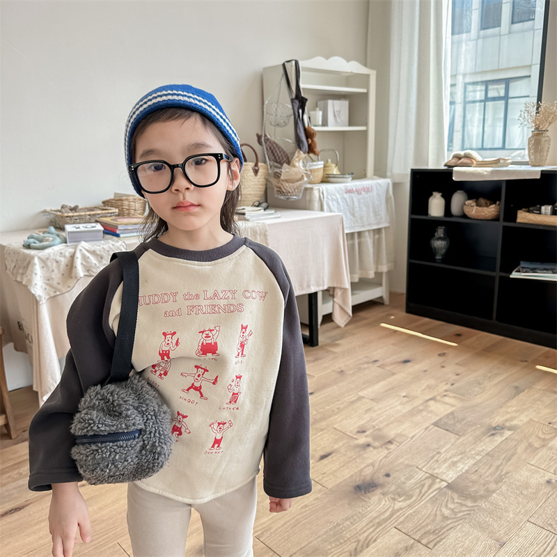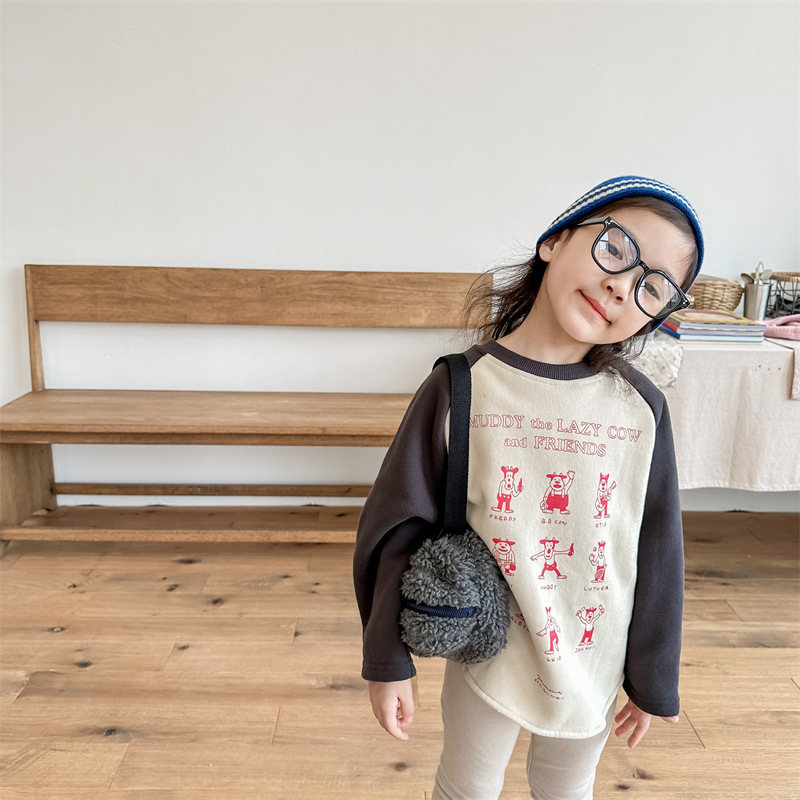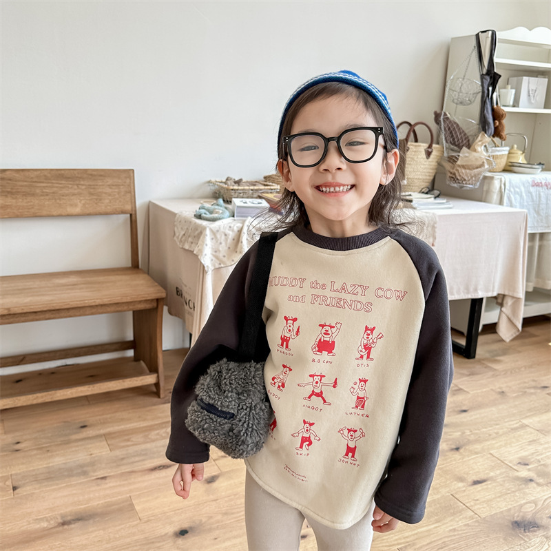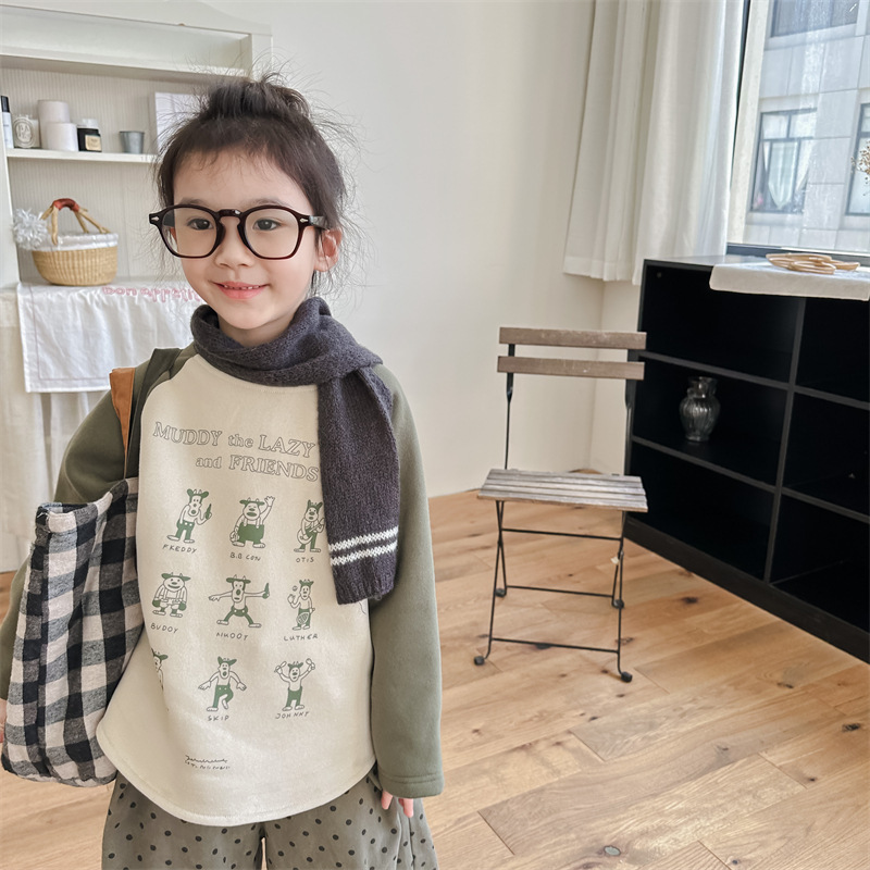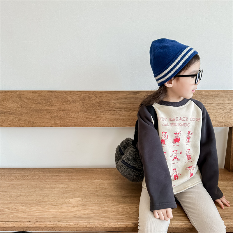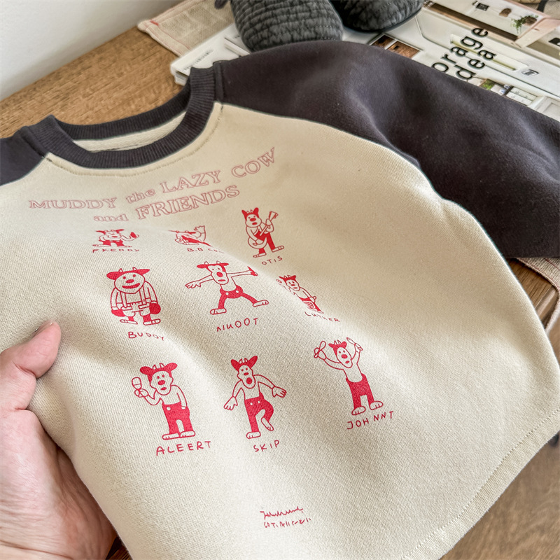 어린이 스웨터 2023 가을과 겨울 어린이 스웨터 어린이 느슨한 만화 인쇄 스티칭 양털 따뜻한 스웨터 탑