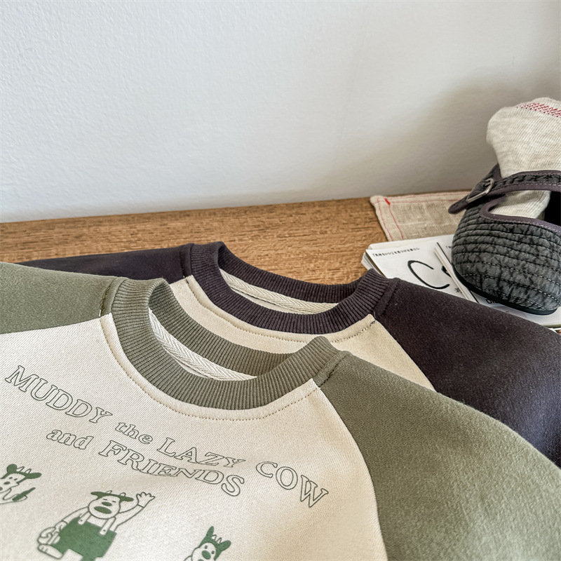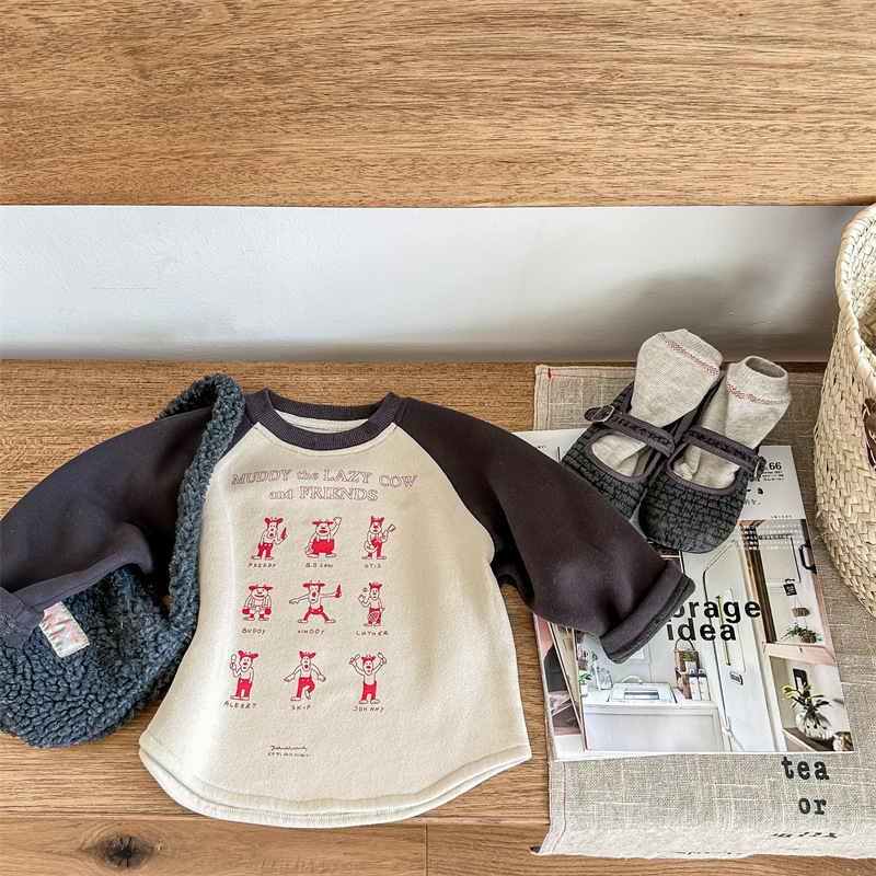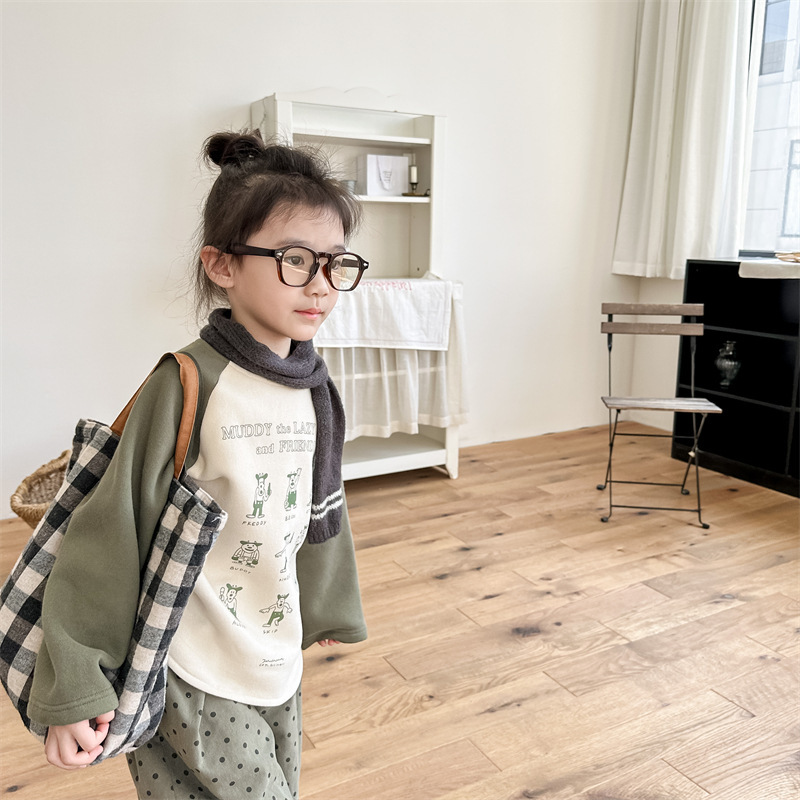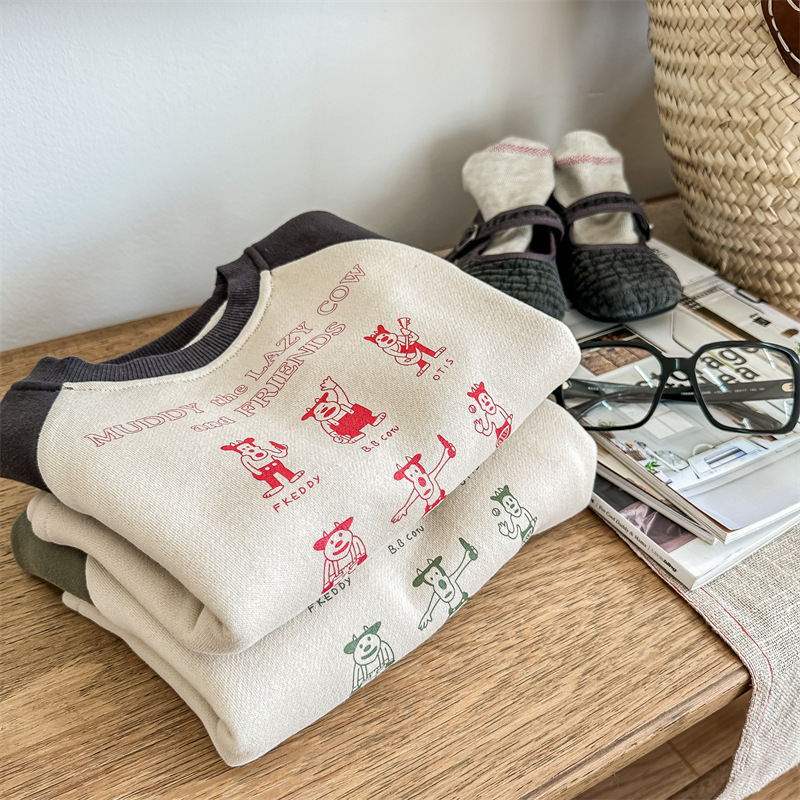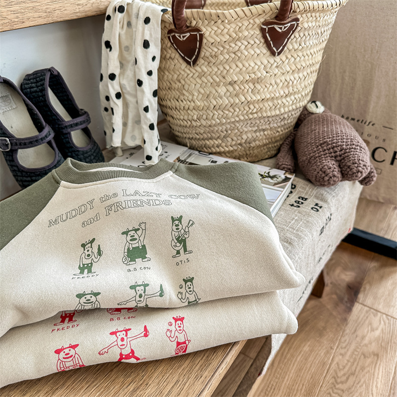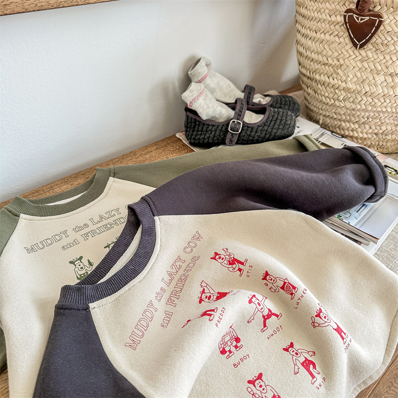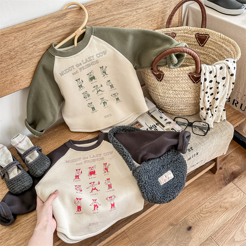 어린이 스웨터 2023 가을과 겨울 어린이 스웨터 어린이 느슨한 만화 인쇄 스티칭 양털 따뜻한 스웨터 탑스토어 가기