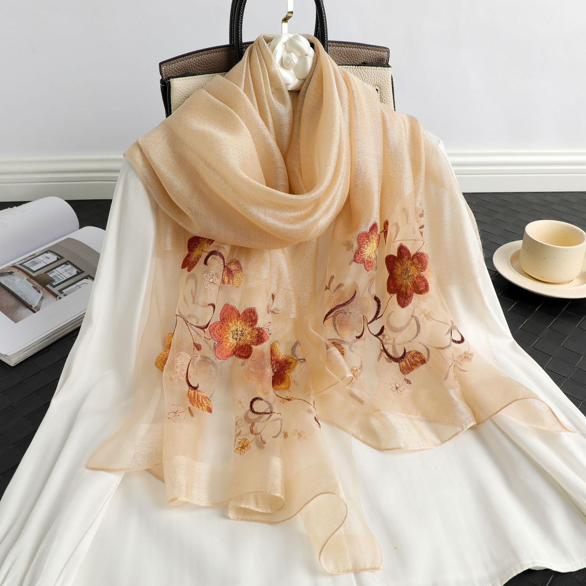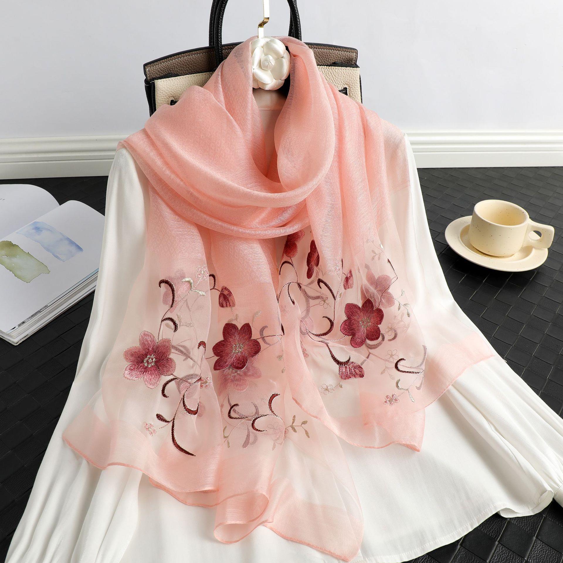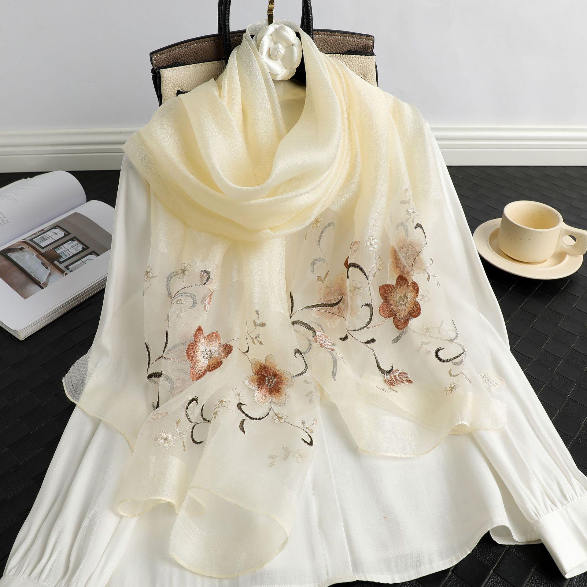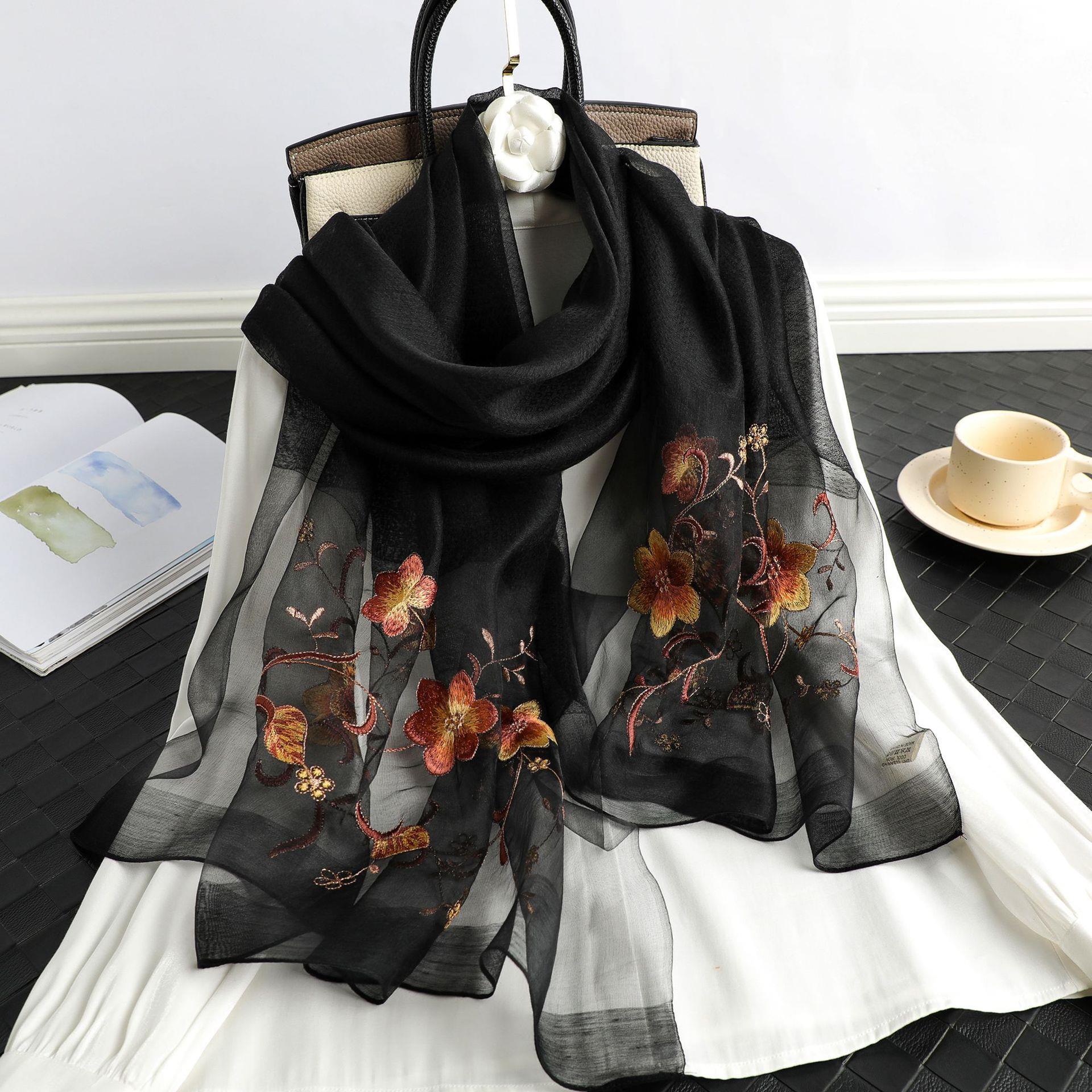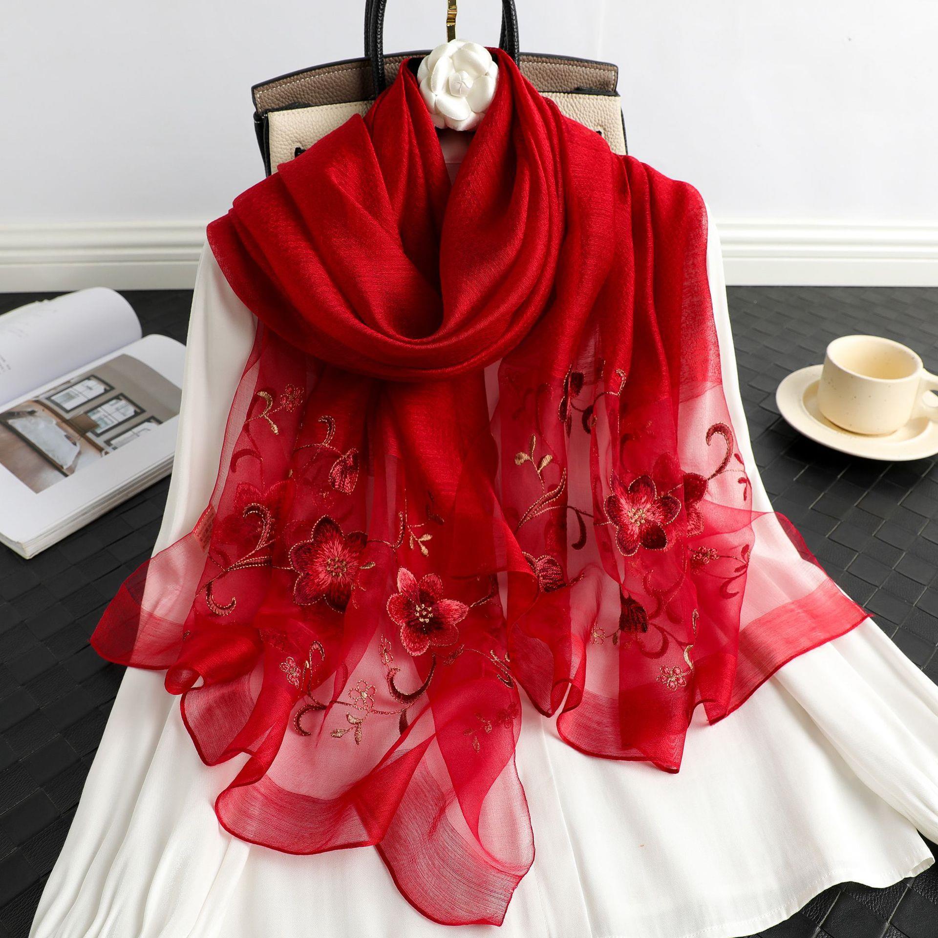 새로운 실크 울 고급 자수 긴 목도리 조커 숙녀 자수 실크 스카프 얇은 명주 그물 장식 스카프 도매