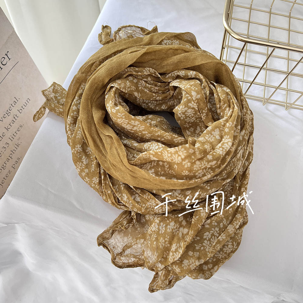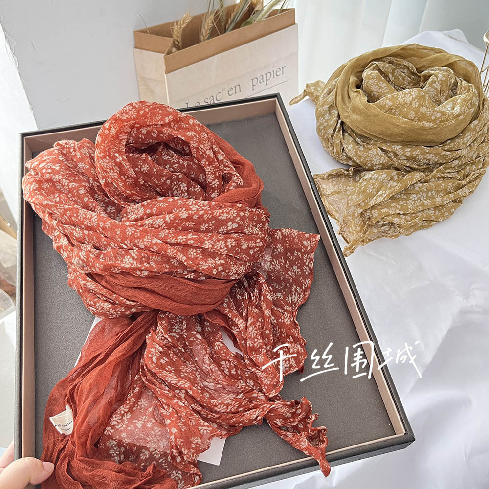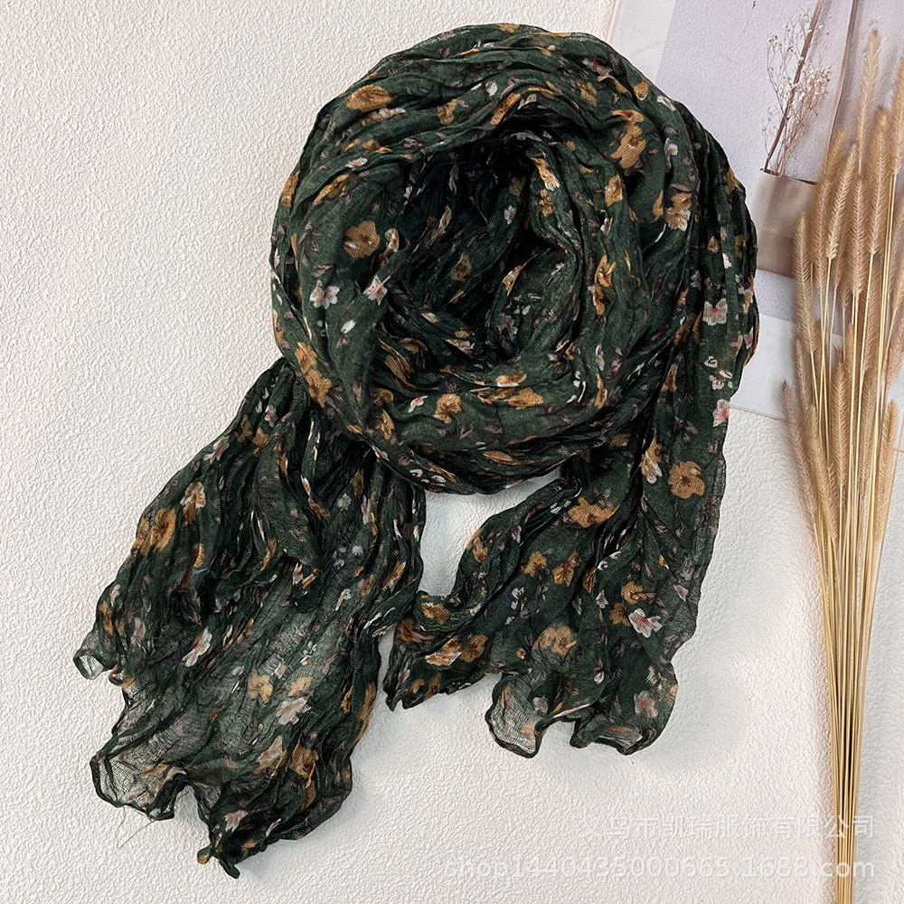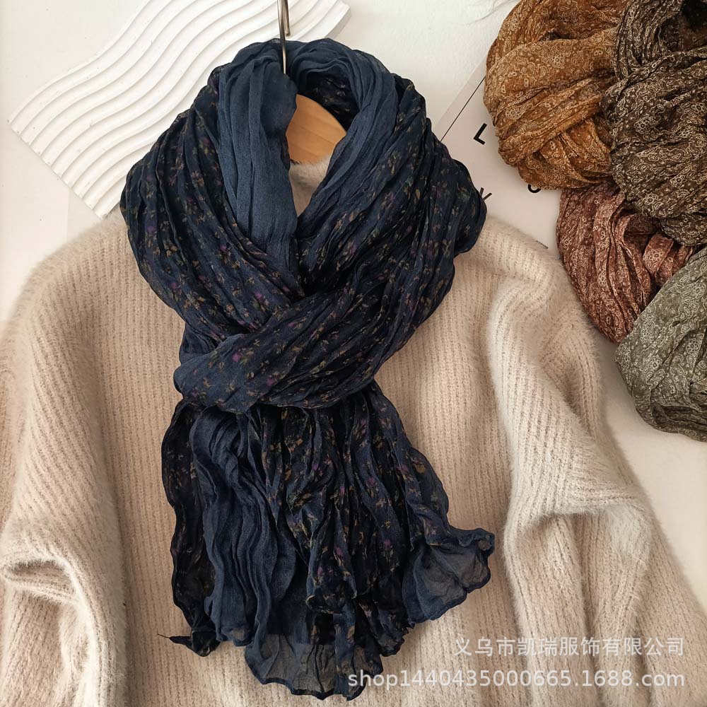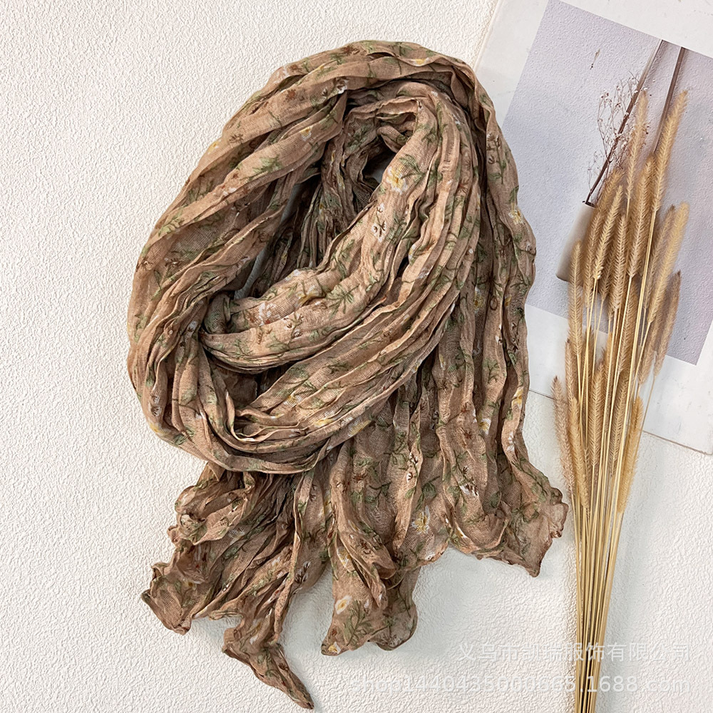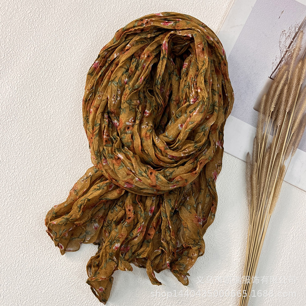 가을과 겨울 2023 새로운 빈티지 예술적 면화와 린넨 주름 얇은 모든 일치 숄 작은 꽃 스카프 일본식 스카프스토어 가기
