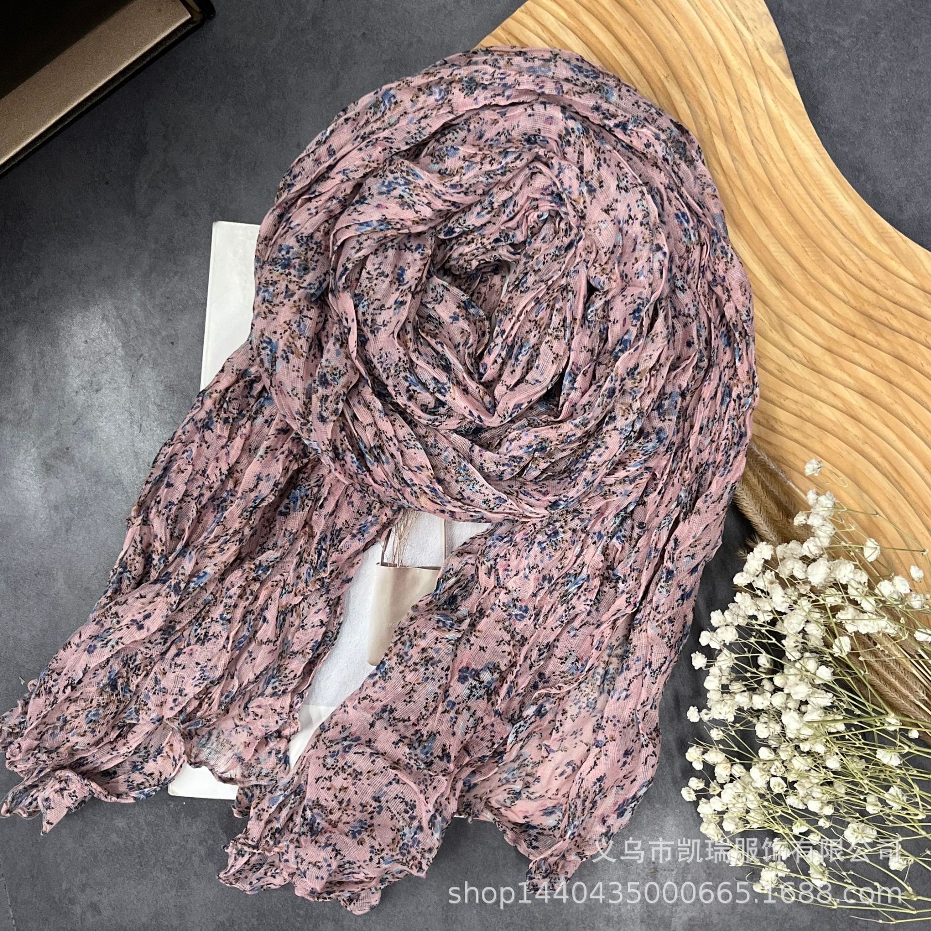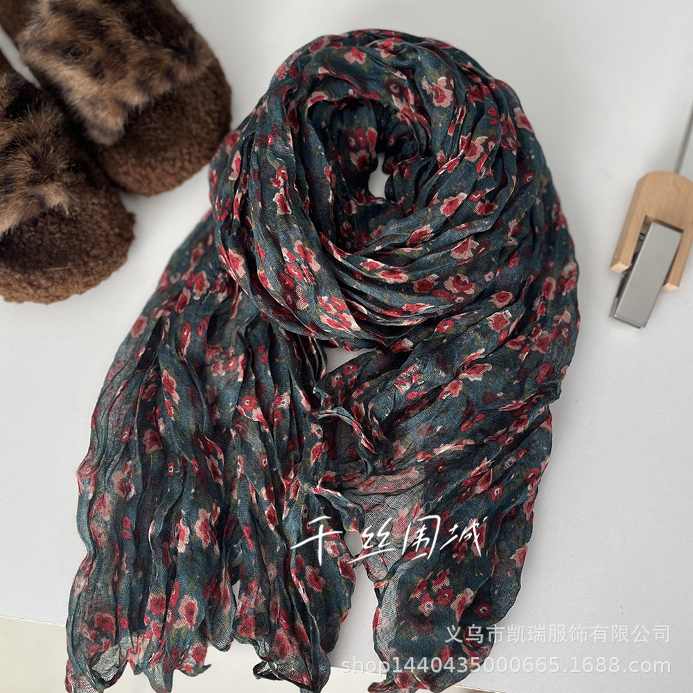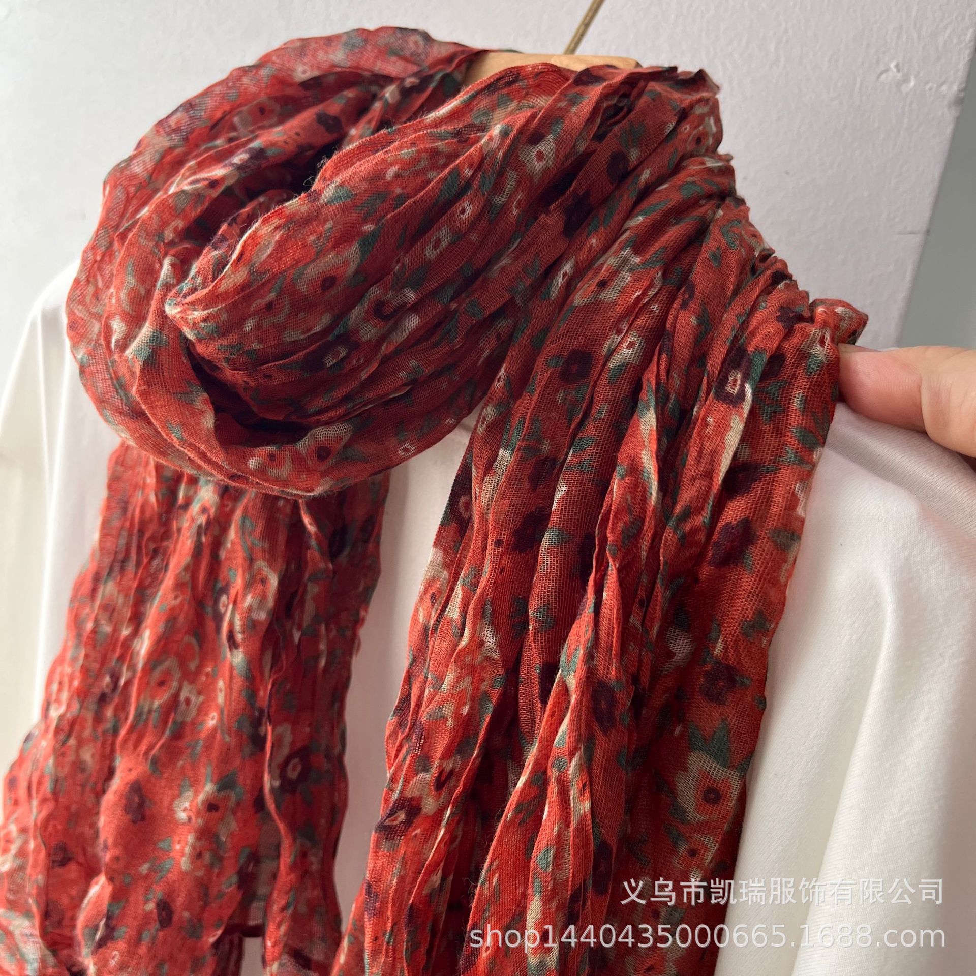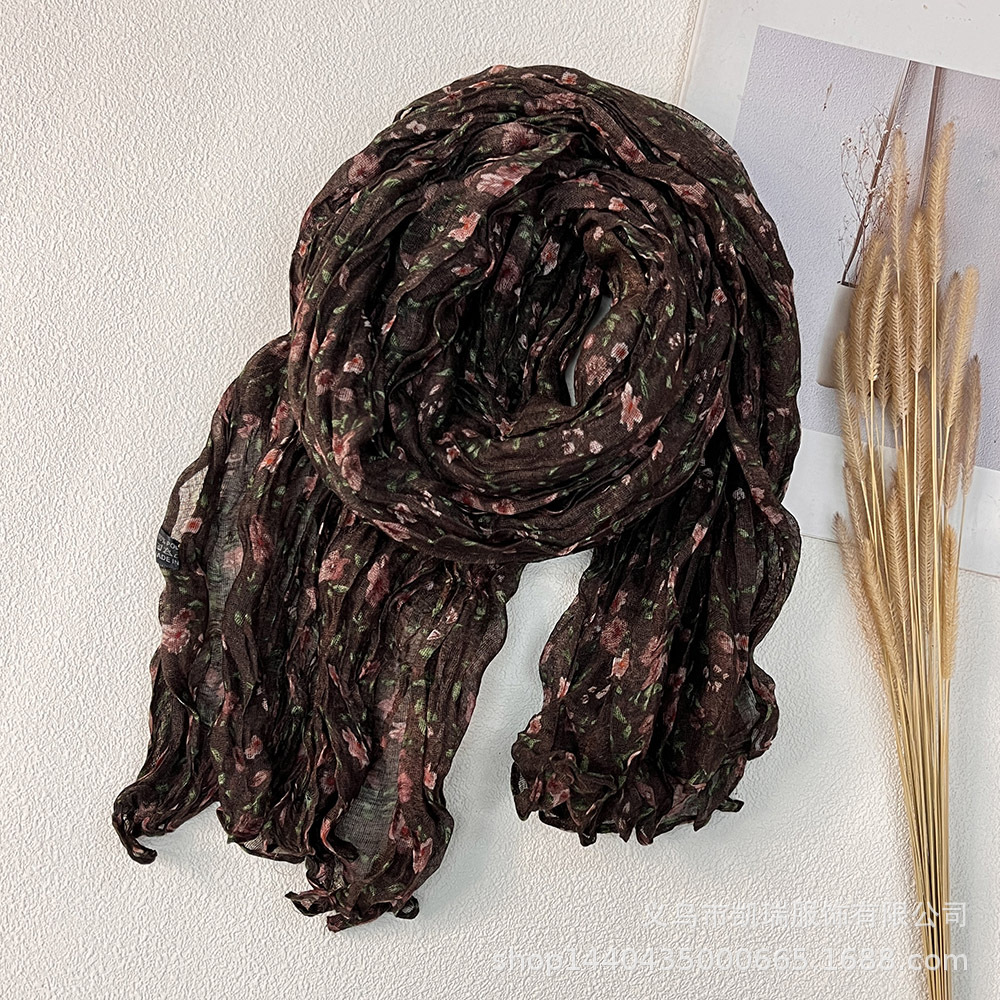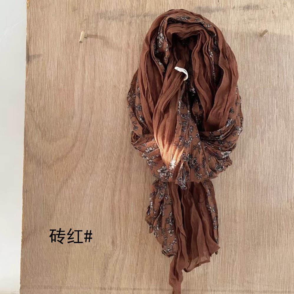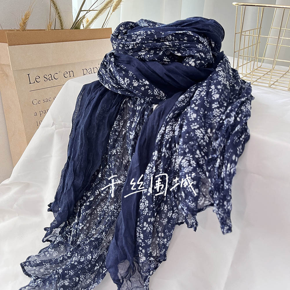 가을과 겨울 2023 새로운 빈티지 예술적 면화와 린넨 주름 얇은 모든 일치 숄 작은 꽃 스카프 일본식 스카프스토어 가기