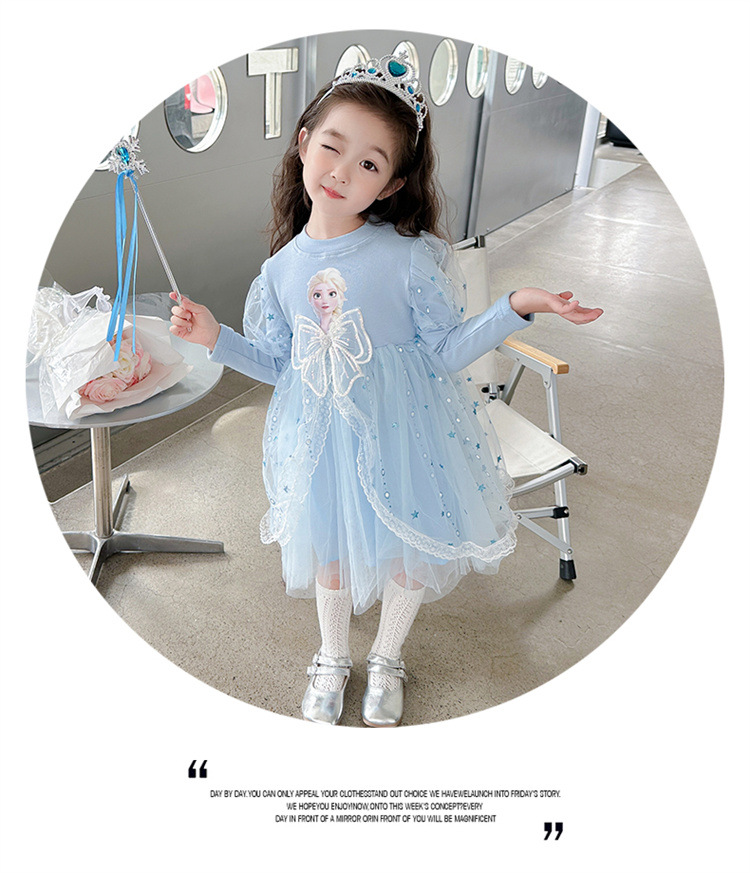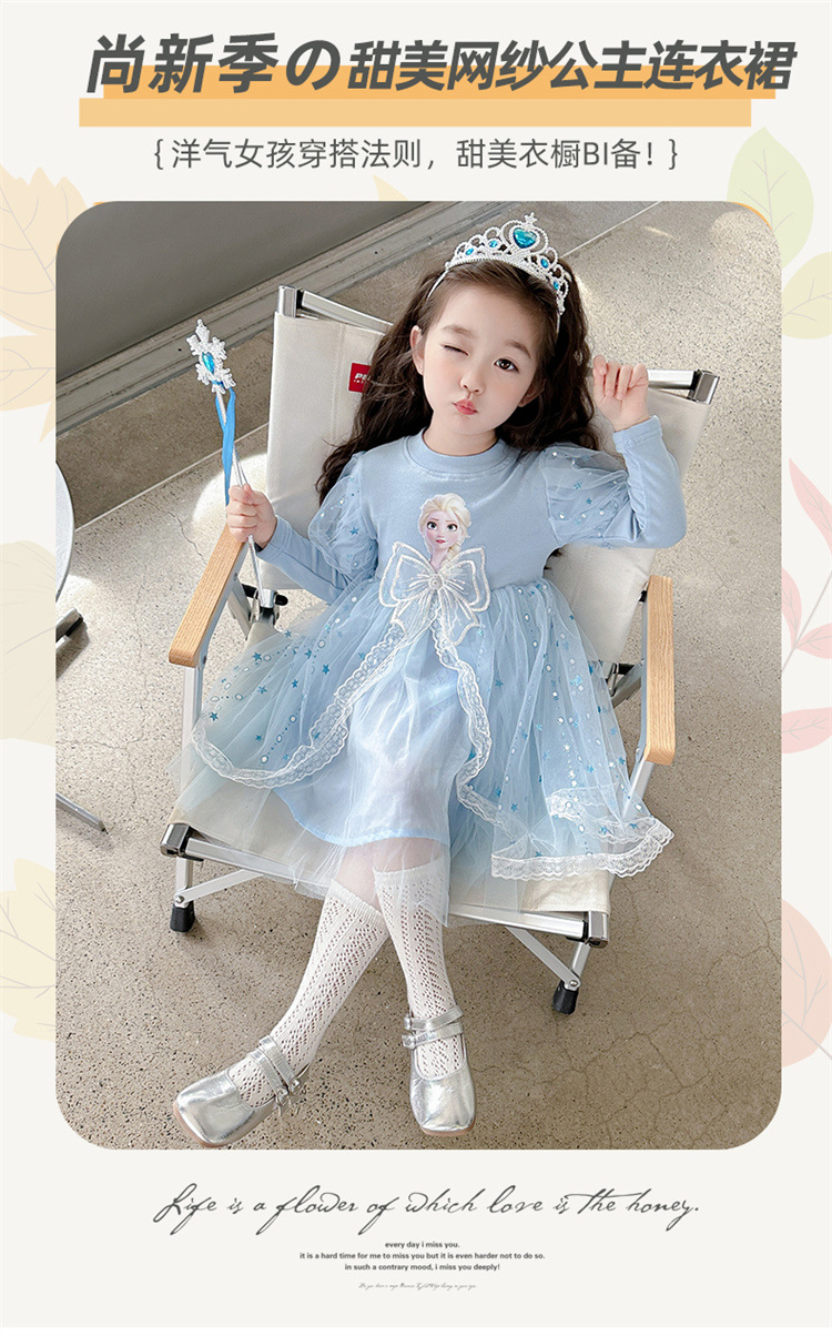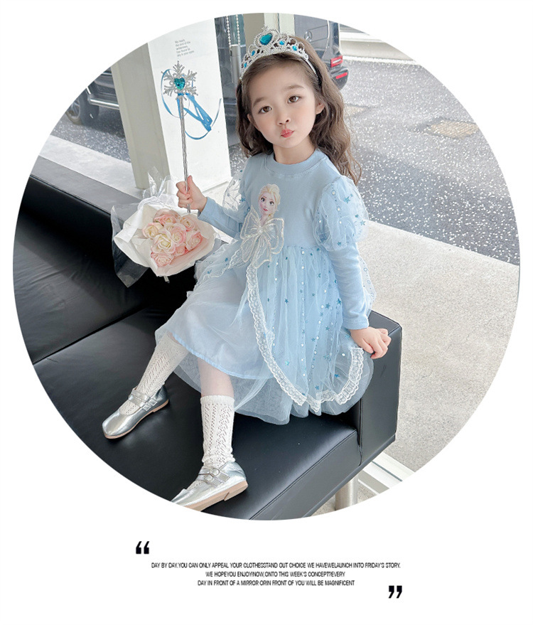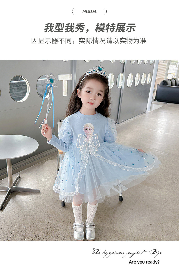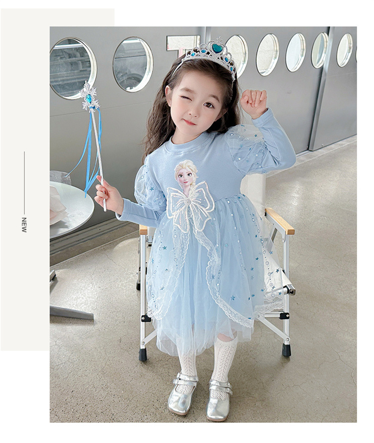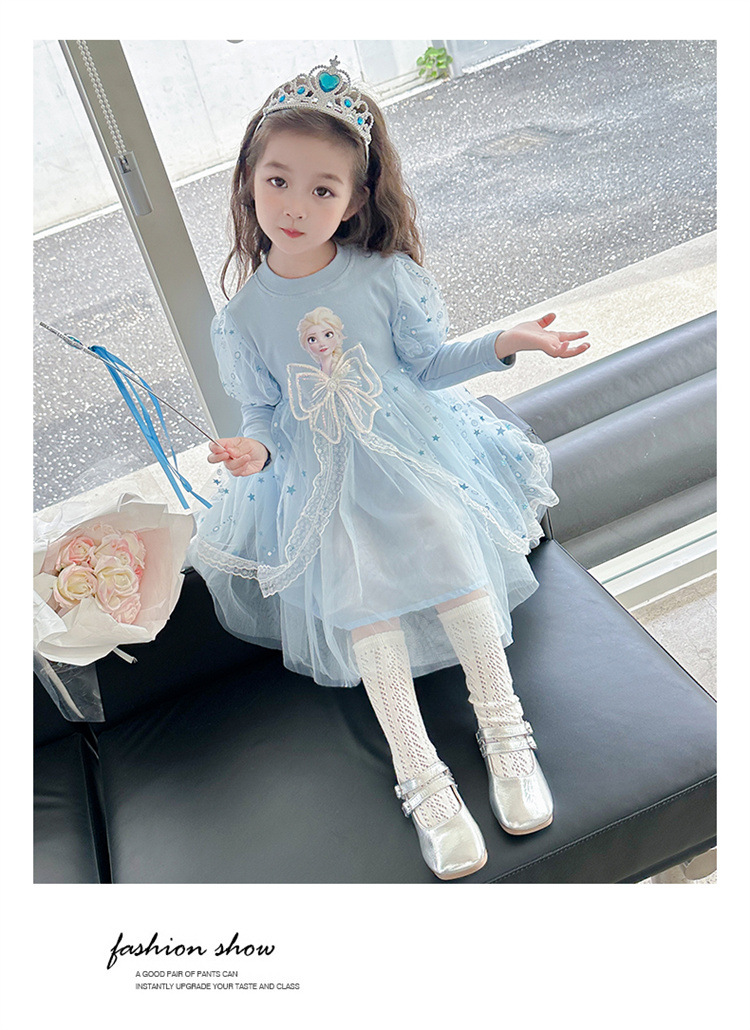 여자 한국 스타일 긴팔 엘사 공주 드레스 어린이 2025 새로운 가을 엘사 드레스 코튼 메쉬 스커트 유행스토어 가기