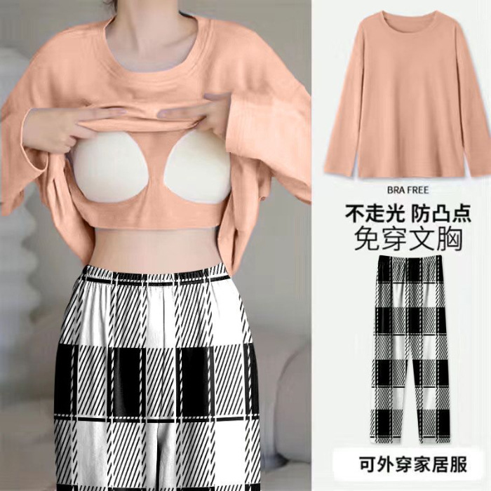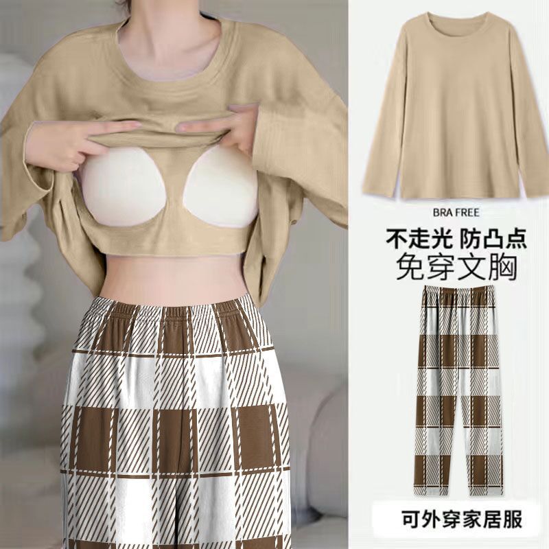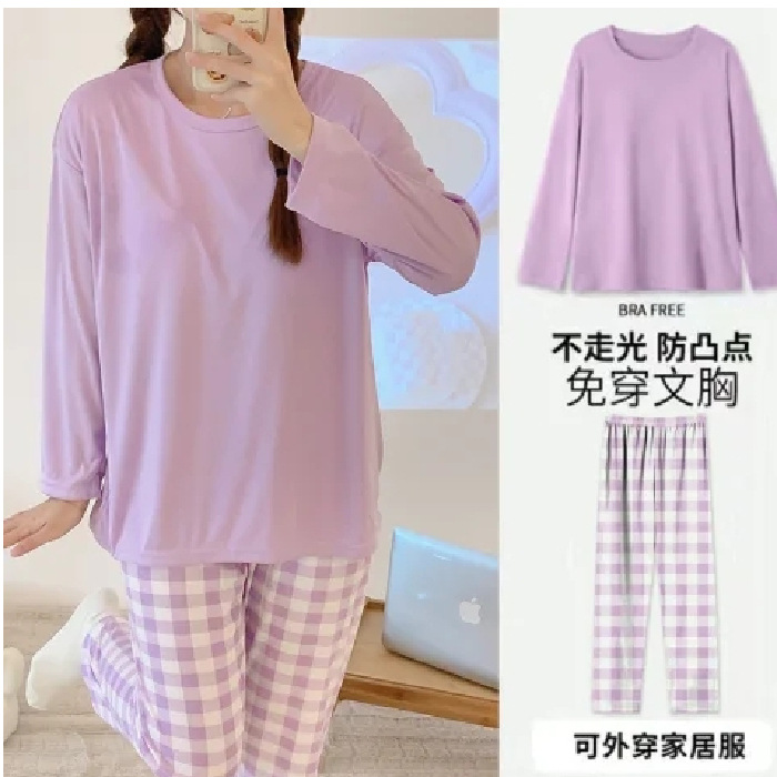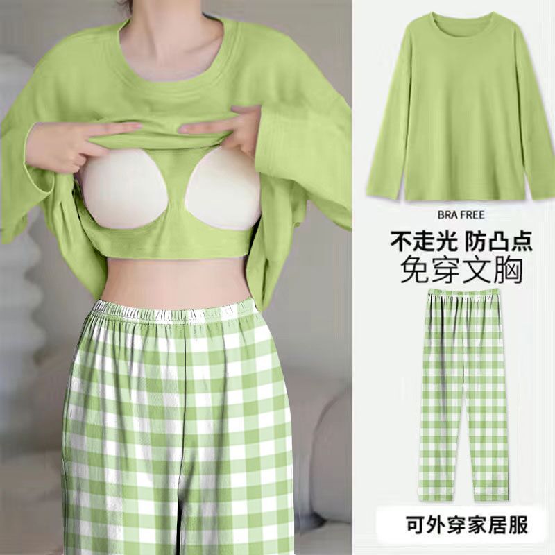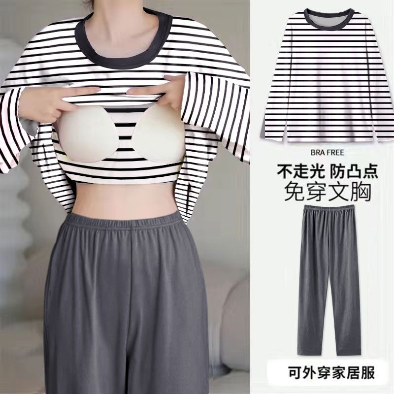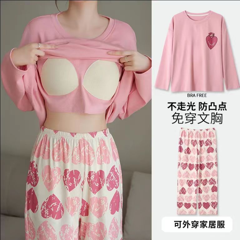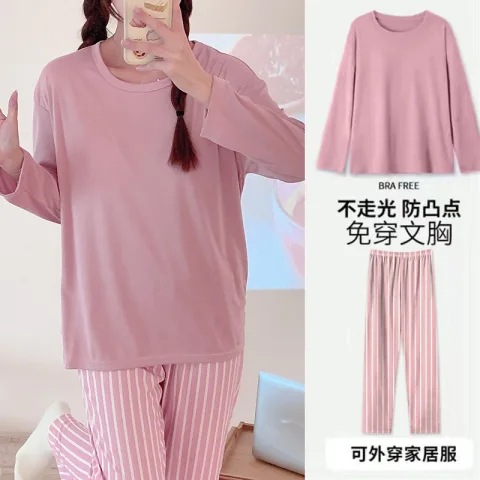 봄과 가을 새로운 긴팔 바지 가슴 패드 단색 달콤한 느슨한 플러스 사이즈 플러스 뚱뚱한 간단한 가정 옷 세트