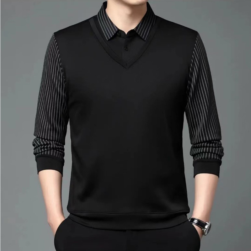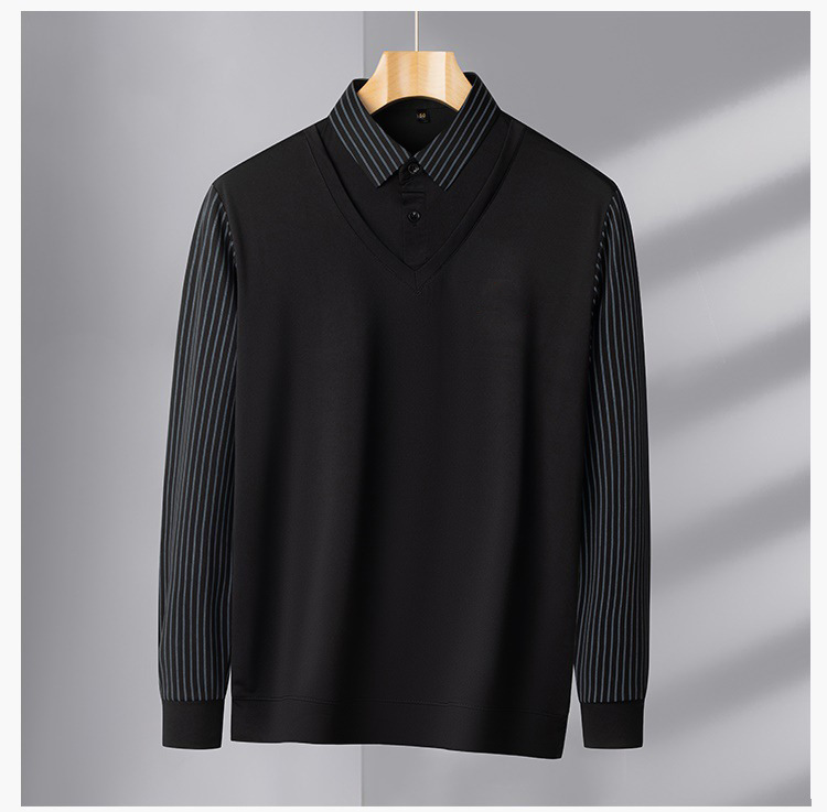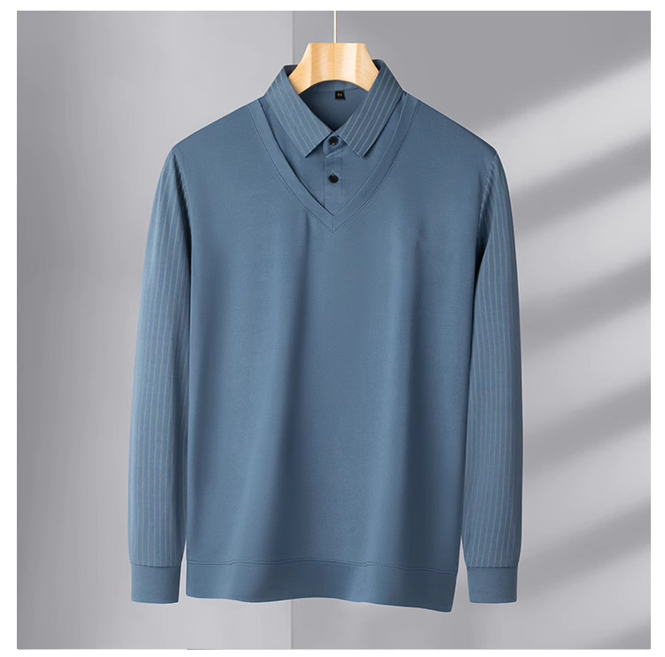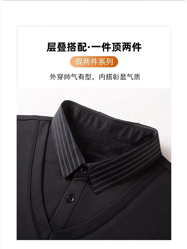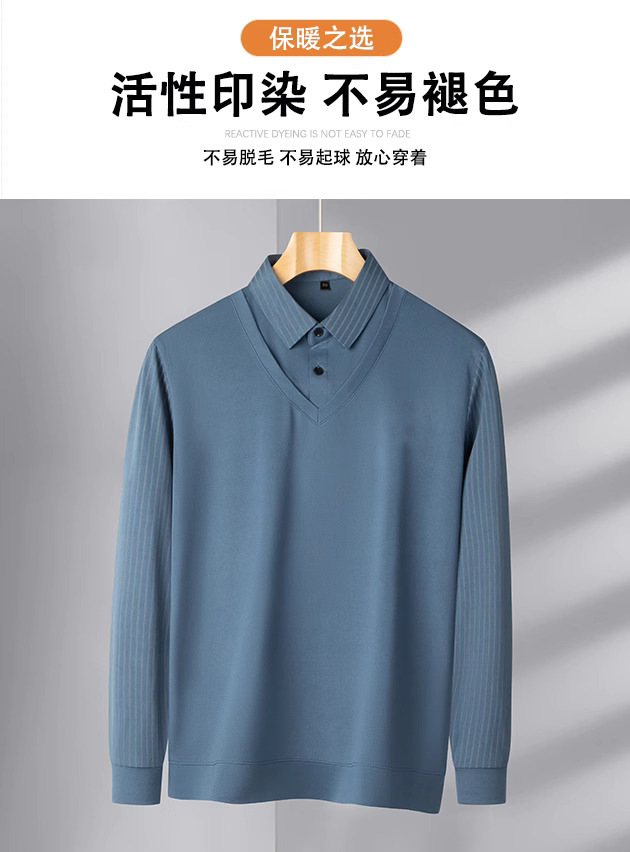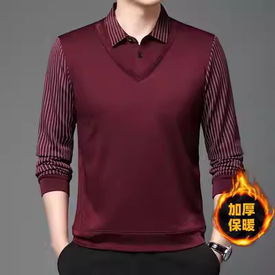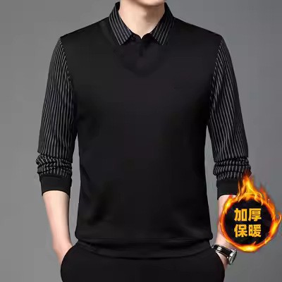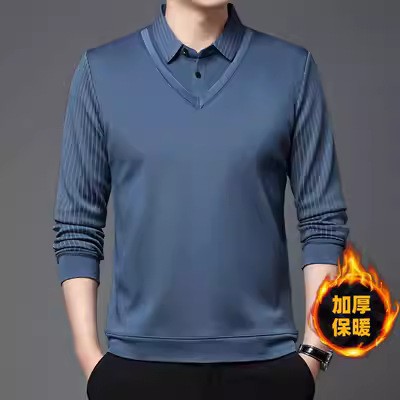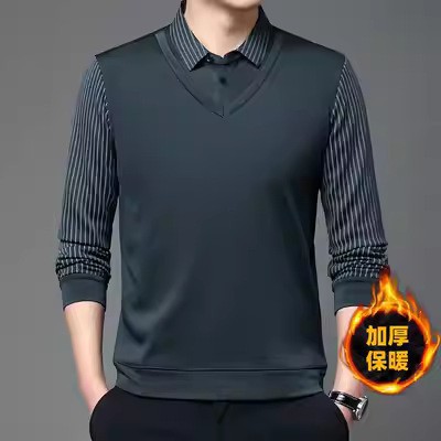 2023 가을/겨울 새로운 남성용 기모 두꺼운 탑 가짜 투피스 긴팔 티셔츠 라펠 따뜻한베이스 니트 셔츠