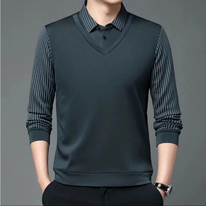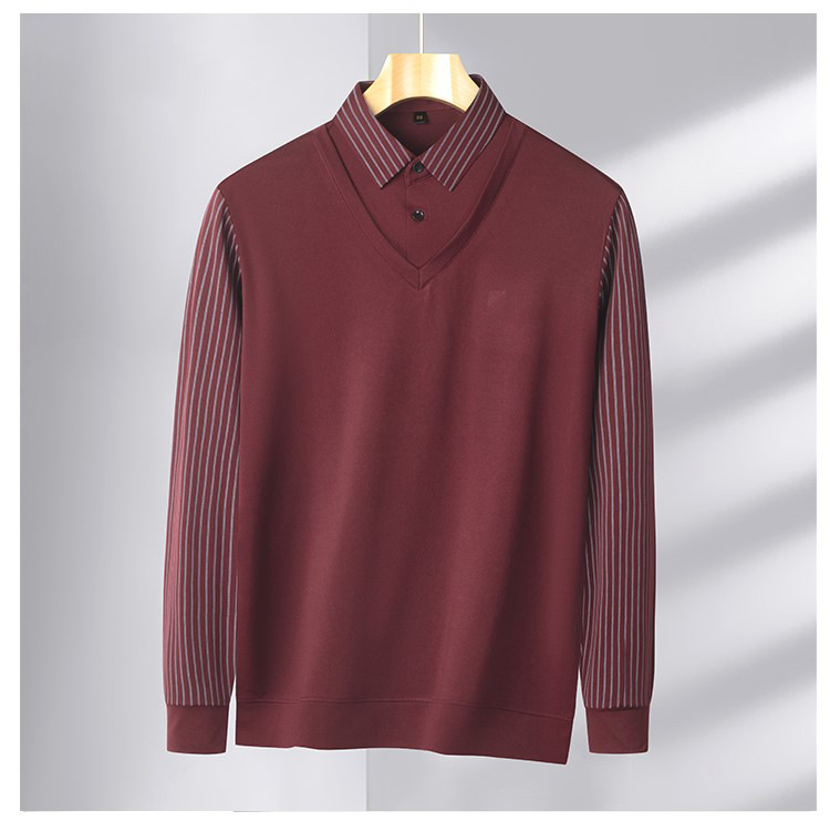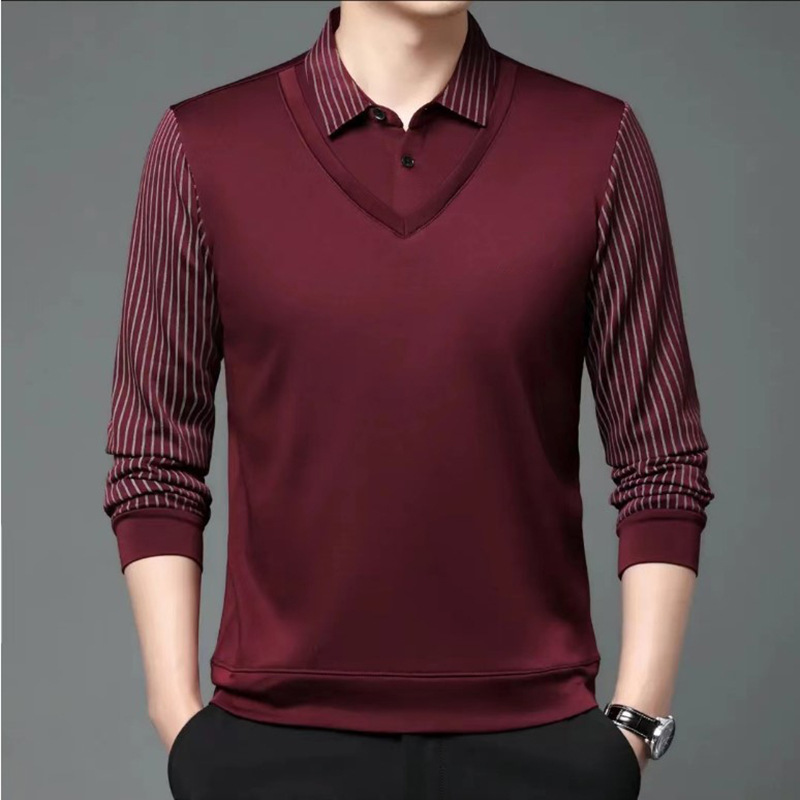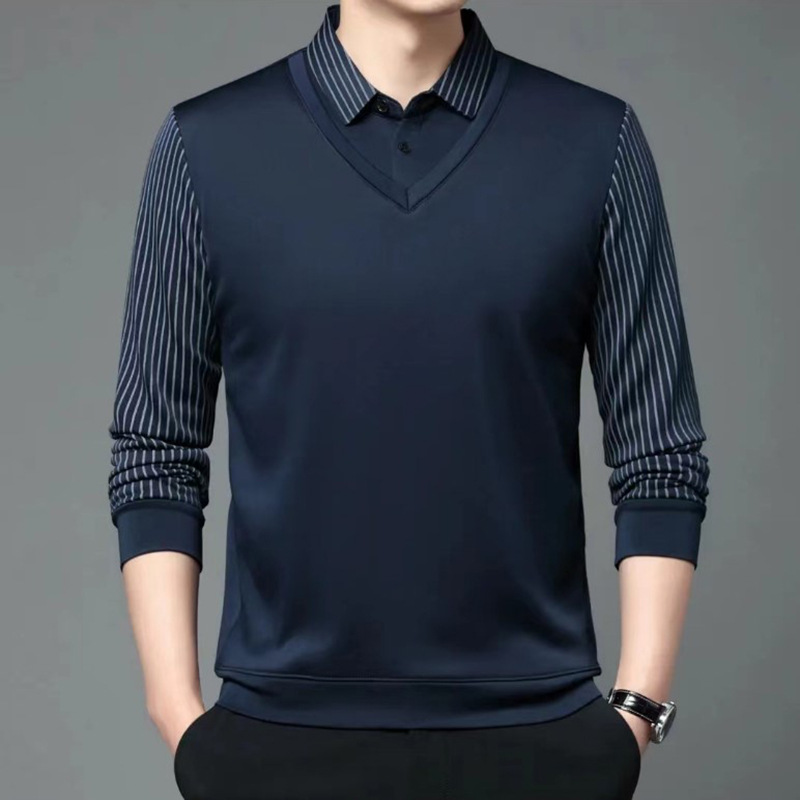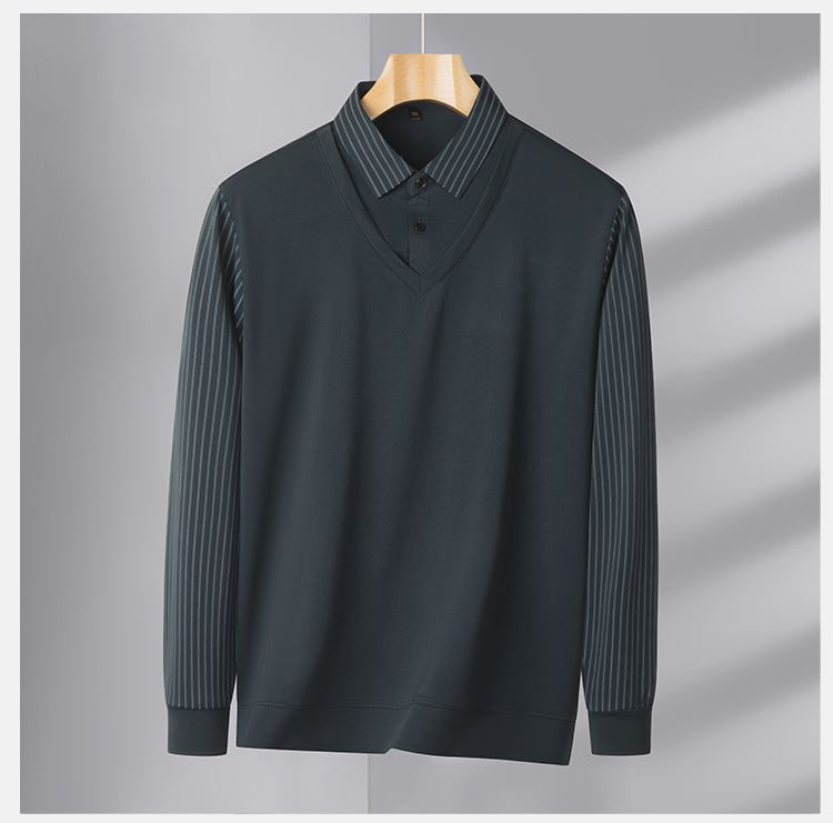 2023 가을/겨울 새로운 남성용 기모 두꺼운 탑 가짜 투피스 긴팔 티셔츠 라펠 따뜻한베이스 니트 셔츠