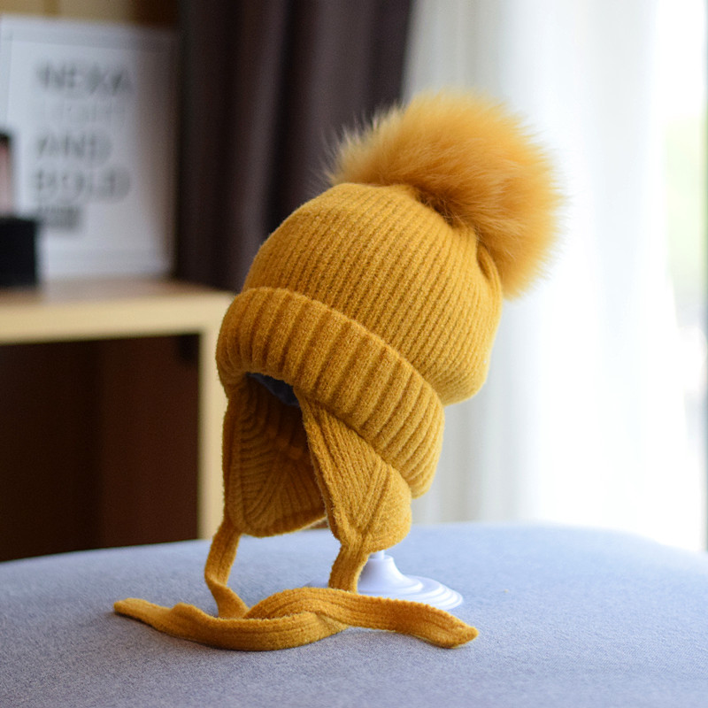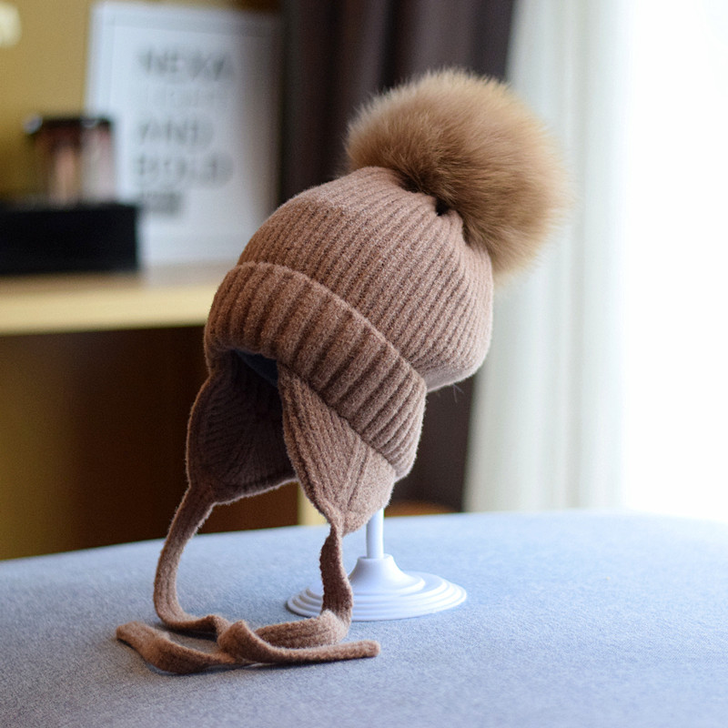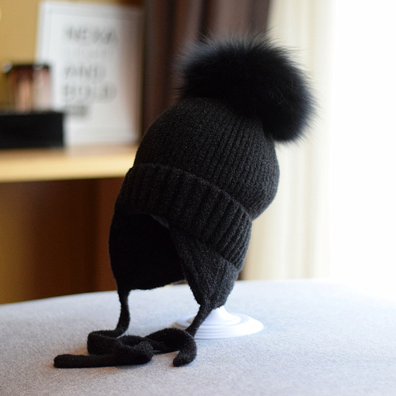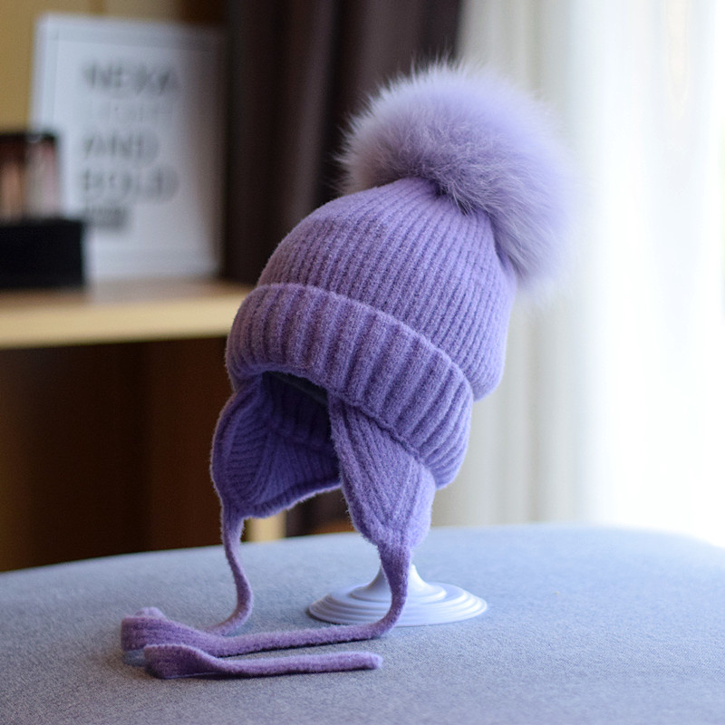 새로운 여우 모피 공 어린이 귀 보호 모자 소녀 겨울 기모 두꺼운 따뜻한 플러시 니트 레이 펑 모자 콜드 캡