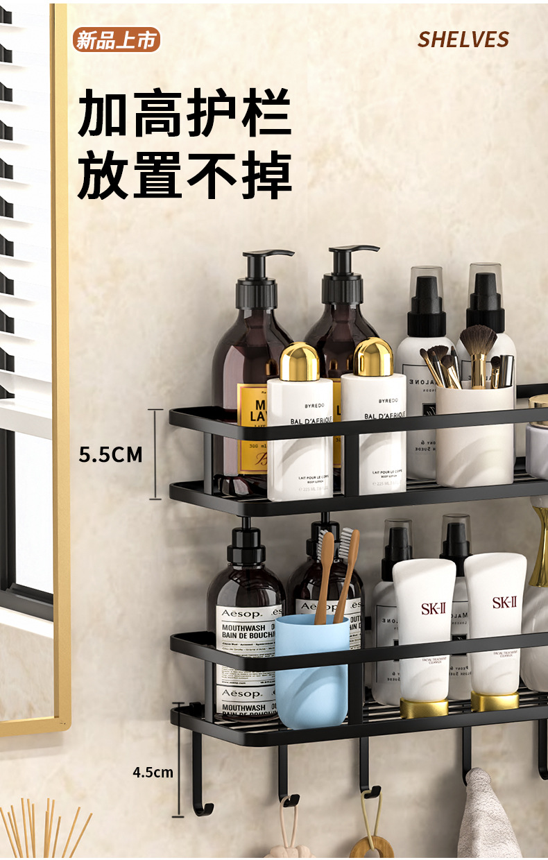 • 단층 보관 랙 + 비누 랙 2 개 (후크 5 개)