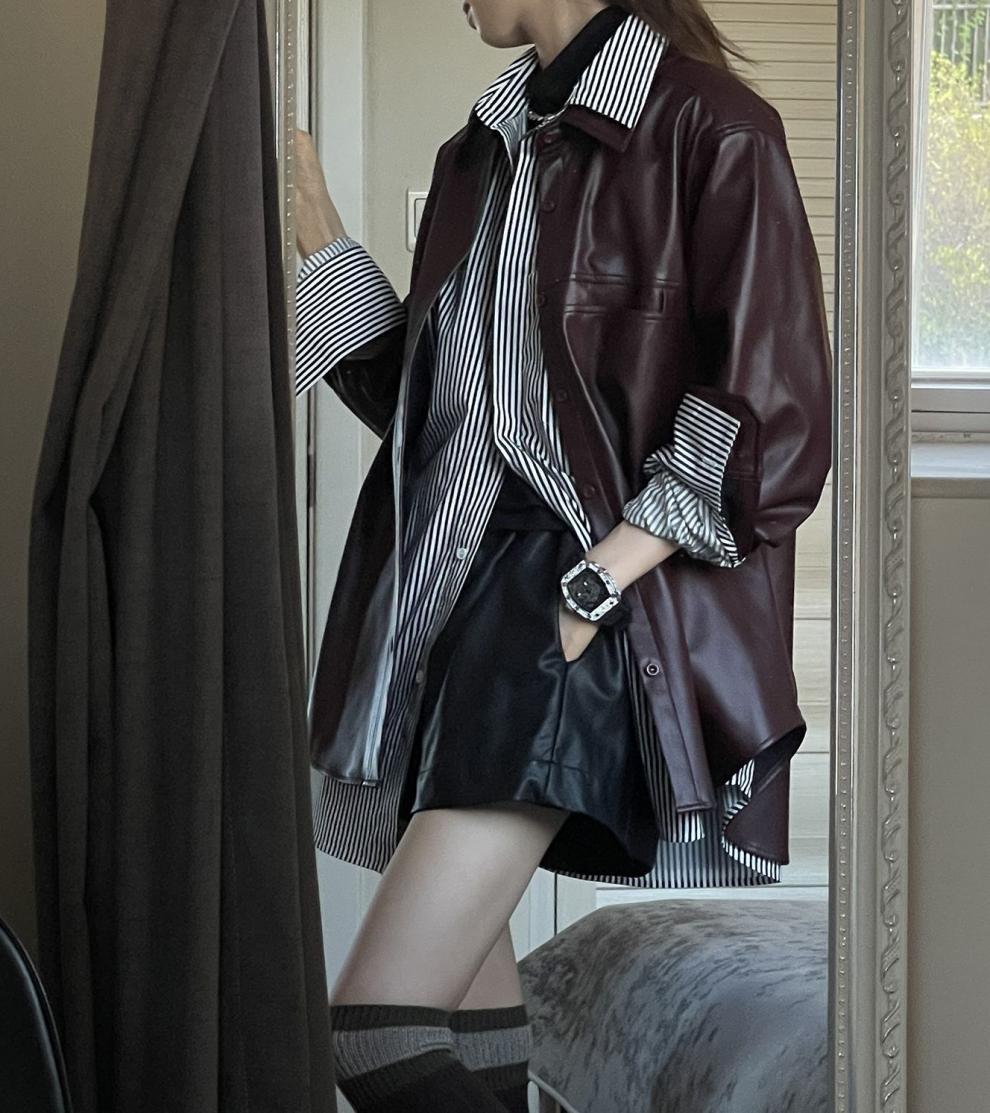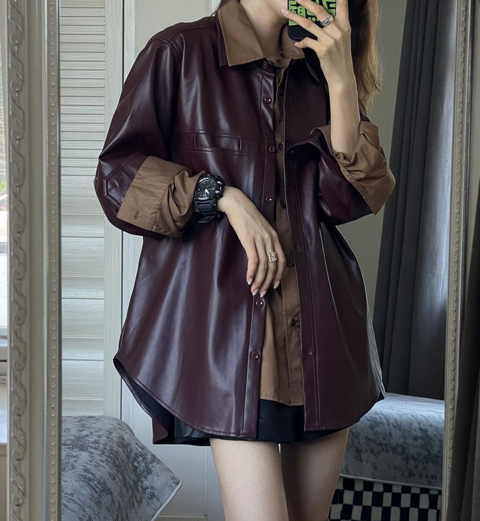 2025 가을, 겨울 신제품 포도 보라색 PU 가죽 자켓 여성 레트로 자켓 다목적 셔츠 패션 슈트스토어 가기